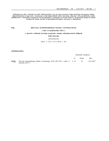 02014D0040(01) — PL — 13.01.2017 — 001.001 — 1 Dokument ten służy wyłącznie do celów informacyjnych i nie ma mocy prawnej. Unijne instytucje nie ponoszą żadnej odpowiedzialności za jego treść. Autentyczne wersje odpowiednich aktów prawnych, włącznie z ich preambułami, zostały opublikowane w Dzienniku Urzędowym Unii Europejskiej i są dostępne na stronie EUR-Lex. Bezpośredni dostęp do tekstów urzędowych można uzyskać za pośrednictwem linków zawartych w dokumencie ►B DECYZJA EUROPEJSKIEGO BANKU CENTRALNEGO z dnia 15 października 2014 r. w sprawie realizacji trzeciego programu zakupu zabezpieczonych obligacji (EBC/2014/40) (2014/828/UE) (Dz.U. L 335 z 22.11.2014, s. 22) zmieniona przez: Dziennik Urzędowy nr ►M1 Decyzja Europejskiego Banku Centralnego (UE) 2017/101 z dnia 11 stycznia 2017 r. L 16 strona 53 data 20.1.2017 02014D0040(01) — PL — 13.01.2017 — 001.001 — 2 ▼B DECYZJA EUROPEJSKIEGO BANKU CENTRALNEGO z dnia 15 października 2014 r. w sprawie realizacji trzeciego programu zakupu zabezpieczonych obligacji (EBC/2014/40) (2014/828/UE) Artykuł 1 Wprowadzenie i zakres programu obejmującego transakcje bezwarunkowego zakupu zabezpieczonych obligacji Eurosystem wprowadza niniejszą decyzją trzeci program, w ramach którego banki centralne Eurosystemu będą dokonywały transakcji zakupu kwalifikowanych zabezpieczonych obligacji w rozumieniu art. 2. W ramach trzeciego programu banki centralne Eurosystemu mogą doko nywać transakcji zakupu kwalifikowanych zabezpieczonych obligacji od kwalifikowanych kontrahentów na rynku pierwotnym i wtórnym, zgodnie z kryteriami kwalifikacji kontrahentów określonymi w art. 3. Artykuł 2 Kryteria kwalifikacji zabezpieczonych obligacji Na potrzeby transakcji bezwarunkowego zakupu realizowanych w ramach trzeciego programu kwalifikują się zabezpieczone obligacje, które są akty wami kwalifikowanymi na potrzeby operacji polityki pieniężnej zgodnie z postanowieniami pkt 6.2.1 załącznika I do wytycznych EBC/2011/14 (1), dodatkowo spełniają warunki akceptacji jako własne zabezpieczenie określone w pkt 6.2.3.2 (piąty akapit) załącznika I do wytycznych EBC/2011/14, oraz zostały wyemitowane przez instytucje kredytowe z siedzibą w strefie euro. Na potrzeby transakcji bezwarunko wego zakupu realizowanych w ramach trzeciego programu kwalifikują się Multicédulas, które są aktywami kwalifikowanymi na potrzeby operacji polityki pieniężnej zgodnie z postanowieniami pkt 6.2.1 załącznika I do wytycznych EBC/2011/14 oraz które zostały wyemitowane przez podmioty specjalnego przeznaczenia z siedzibą w strefie euro. Opisane powyżej zabezpieczone obligacje kwalifikują się na potrzeby transakcji bezwarunkowego zakupu realizowanych w ramach trzeciego programu, o ile spełniają następujące wymogi dodatkowe: 1. Wymagane jest przyznanie zabezpieczonym obligacjom przez co najmniej jedną zewnętrzną instytucję oceny wiarygodności kredytowej (ECAI) zaakceptowaną zgodnie z ramowymi zasadami oceny kredytowej w Eurosystemie (ECAF) oceny jakości kredytowej co najmniej na poziomie stopnia 3 jakości kredytowej (CQS3, obecnie odpowiadającej ocenie na poziomie 'BBB-' lub równoważnej). 2. Całkowity stan posiadania obligacji oznaczonej danym międzynaro dowym numerem identyfikacyjnym papierów wartościowych przez wszystkie banki centralne Eurosystemu wspólnie z tytułu pierwszego (2) i drugiego (3) programu zakupów zabezpieczonych obligacji (zwanych dalej „pierwszym programem” i „drugim progra mem”), z tytułu trzeciego programu oraz z jakiekolwiek innego tytułu, nie może być większy niż 70 %. (1) Wytyczne EBC/2011/14 z dnia 20 września 2011 r. w sprawie instrumentów i procedur polityki pieniężnej Eurosystemu (Dz.U. L 331 z 14.12.2011, s. 1). (2) Decyzja EBC/2009/16 z dnia 2 lipca 2009 r. w sprawie realizacji programu zakupu zabezpieczonych obligacji (Dz.U. L 175 z 4.7.2009, s. 18). (3) Decyzja EBC/2011/17 z dnia 3 listopada 2011 r. w sprawie realizacji drugiego programu zakupu zabezpieczonych obligacji (Dz.U. L 297 z 16.11.2011, s. 70). 02014D0040(01) — PL — 13.01.2017 — 001.001 — 3 ▼B 3. Zabezpieczone obligacje muszą być denominowane w euro oraz utrzymywane i rozliczane w strefie euro. 4. Na potrzeby transakcji zakupu realizowanych w ramach trzeciego programu nie kwalifikują się zabezpieczone obligacje wyemitowane przez podmioty, których dostęp do operacji kredytowych Eurosys temu został zawieszony — na czas takiego zawieszenia. 5. W okresie, w którym minimalne wymogi Eurosystemu w zakresie jakości kredytowej nie są stosowane w ramach wymogów w zakresie kwalifikowania zabezpieczeń dotyczących rynkowych instrumentów dłużnych emitowanych lub gwarantowanych przez rząd Grecji lub Cypru (zgodnie z art. 8 ust. 2 wytycznych EBC/2014/31 (1)), zabez pieczone obligacje podmiotów z siedzibą na Cyprze i w Grecji, które obecnie nie posiadają ratingu CQS3, muszą mieć rating na poziomie równym co najmniej najwyższemu ratingowi przyznanemu zabezpie czonym obligacjom przez odpowiednią instytucję w danej jurysdyk cji, a całkowity stan posiadania obligacji oznaczonej danym między narodowym numerem identyfikacyjnym papierów wartościowych przez wszystkie banki centralne Eurosystemu wspólnie z tytułu pierwszego, drugiego i trzeciego programu oraz z jakiekolwiek innego tytułu nie może być większy niż 30 %, przy czym obligacje te muszą spełniać następujące dodatkowe wymogi zapewniające osiągnięcie odpowiedniego poziomu ryzyka: a) obowiązek comiesięcznego przekazywania KBC siedziby emitenta informacji o cechach puli, w tym danych o poszczegól nych kredytach, jak również o strukturalnych cechach programu zakupu zabezpieczonych obligacji i informacji o emitencie; formularze sprawozdawcze zostaną udostępnione kontrahentom przez odpowiedni KBC; b) obowiązek minimalnego nadzabezpieczenia na poziomie 25 %; zasady dotyczące obliczania wysokości