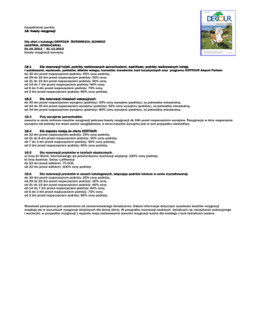 Uzupełnienie punktu 18. Koszty rezygnacji Dla ofert z katalogu DERTOUR ÖSTERREICH, SCHWEIZ (AUSTRIA, SZWAJCARIA) 01.01.2012 – 31.12.2012 koszty rezygnacji wynoszą: 18.1 realizowanych owanych koleją Dla rezerwacji hoteli, podróży realizowanych samochodami, wędrówek, podróży realiz i autobusami, wycieczek, pakietów, biletów wstępu, karnetów, transferów, kart turystycznych oraz programu DERTOUR Airport Parken: Parken: do 30 dni przed rozpoczęciem podróży: 25% ceny podróży, od 29 do 22 dni przed rozpoczęciem podróży: 30% ceny, od 21 do 15 dni przed rozpoczęciem podróży: 40% ceny, od 14 do 7 dni przed rozpoczęciem podróży: 60% ceny, od 6 do 3 dni przed rozpoczęciem podróży: 75% ceny, od 2 dni przed rozpoczęciem podróży: 80% ceny podróży. 18.2 Dla rezerwacji mieszkań wakacyjnych: do 45 dni przed rozpoczęciem wynajmu (podróży): 25% ceny wynajmu (podróży), za jednostkę mieszkalną, od 44 do 35 dni przed rozpoczęciem wynajmu (podróży): 50% ceny wynajmu (podróży), za jednostkę mieszkalną, od 34 dni przed rozpoczęciem wynajmu (podróży): 80% ceny wynajmu (podróży), za jednostkę mieszkalną. 18.3 Przy wynajmie samochodów: zawarta w cenie ochrona kosztów rezygnacji pokrywa koszty rezygnacji do 24h przed rozpoczęciem wynajmu. Rezygnacja w dniu rozpoczęcia wynajmu lub później nie może zostać uwzględniona, a zwrot kosztów wynajmu jest w tym przypadku niemożliwy. 18.4 Dla dojazdu koleją do oferty DERTOUR: do 22 dni przed rozpoczęciem podróży: 25% ceny podróży, od 21 do 8 dni przed rozpoczęciem podróży: 35% ceny podróży, od 7 do 3 dni przed rozpoczęciem podróży: 50% ceny podróży, od 2 dni przed rozpoczęciem podróży: 80% ceny podróży. 18.5 Dla rezerwacji przelotów w taryfach elastycznych: a) linią Air Berlin, Germanwings: po potwierdzeniu rezerwacji wiążącej: 100% ceny podróży. b) linią Austrian, Swiss, Lufthansa: do 23 dni przed odlotem: 75 EUR, od 22 dni przed odlotem: 100% ceny podróży. 18.6 Dla rezerwacji przelotów w cenach katalogowych, włączając podróże lotnicze w cenie zryczałtowanej: do 30 dni przed rozpoczęciem podróży: 25% ceny podróży, od 29 do 22 dni przed rozpoczęciem podróży: 30% ceny, od 21 do 15 dni przed rozpoczęciem podróży: 40% ceny, od 14 do 7 dni przed rozpoczęciem podróży: 60% ceny, od 6 do 3 dni przed rozpoczęciem podróży: 75% ceny, od 2 dni przed rozpoczęciem podróży: 80% ceny podróży. Wysokość potrącenia jest uzależniona od zarezerwowanego świadczenia. Dalsze informacje dotyczące wysokości kosztów rezygnacji znajdują się w warunkach rezygnacji właściwych dla danej oferty. W przypadku rezerwacji osobnych świadczeń np: mieszkania wakacyjnego i wycieczki, w przypadku rezygnacji z wyjazdu mają zastosowanie warunki rezygnacji ważne dla każdego z tych świadczeń osobno.