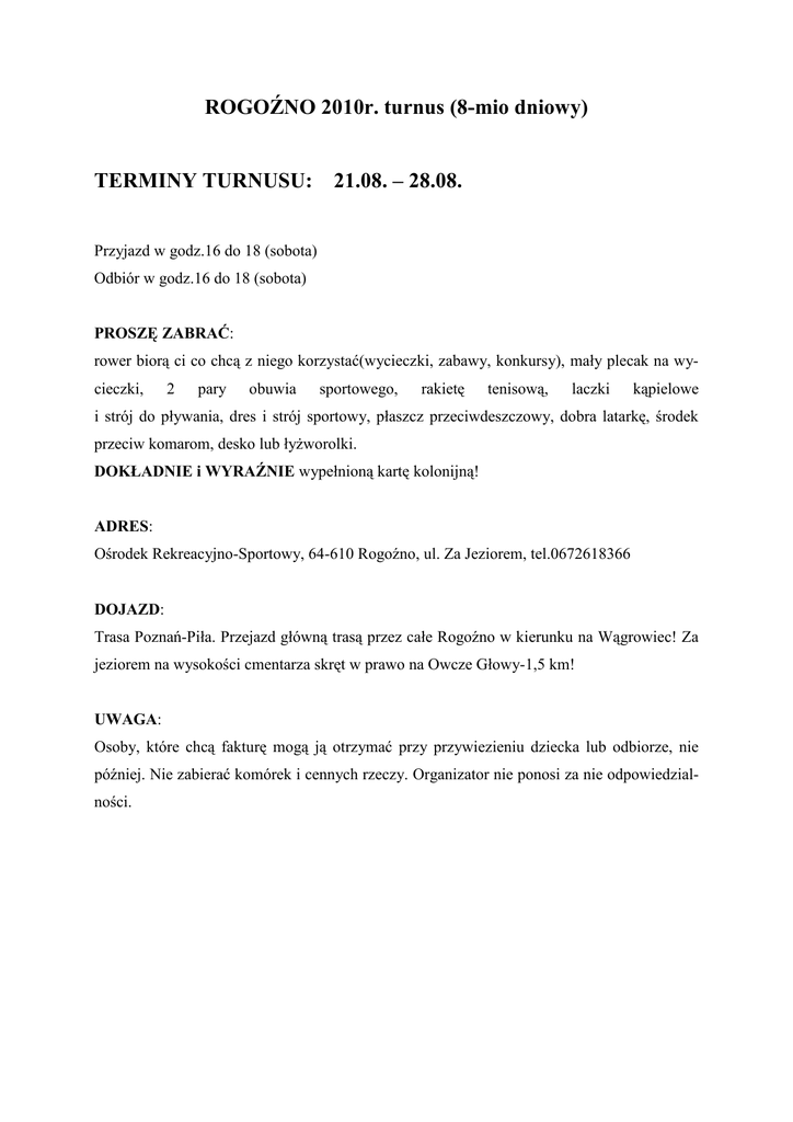 ROGOŹNO 2010r. turnus (8-mio dniowy)