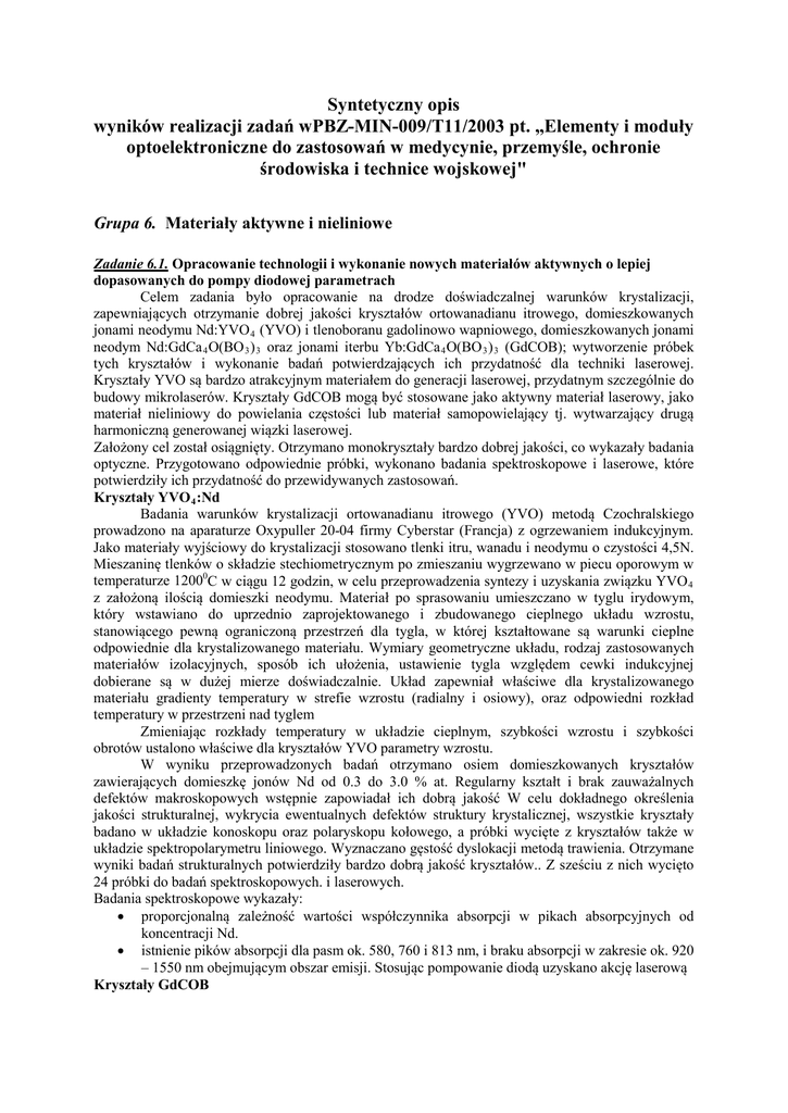 Syntetyczny opis wyników realizacji zadań wPBZ-MIN-009/T11/2003 pt. „Elementy i moduły optoelektroniczne do zastosowań w medycynie, przemyśle, ochronie środowiska i technice wojskowej" Grupa 6. Materiały aktywne i nieliniowe Zadanie 6.1. Opracowanie technologii i wykonanie nowych materiałów aktywnych o lepiej dopasowanych do pompy diodowej parametrach Celem zadania było opracowanie na drodze doświadczalnej warunków krystalizacji, zapewniających otrzymanie dobrej jakości kryształów ortowanadianu itrowego, domieszkowanych jonami neodymu Nd:YVO 4 (YVO) i tlenoboranu gadolinowo wapniowego, domieszkowanych jonami neodym Nd:GdCa 4 O(BO 3 ) 3 oraz jonami iterbu Yb:GdCa 4 O(BO 3 ) 3 (GdCOB); wytworzenie próbek tych kryształów i wykonanie badań potwierdzających ich przydatność dla techniki laserowej. Kryształy YVO są bardzo atrakcyjnym materiałem do generacji laserowej, przydatnym szczególnie do budowy mikrolaserów. Kryształy GdCOB mogą być stosowane jako aktywny materiał laserowy, jako materiał nieliniowy do powielania częstości lub materiał samopowielający tj. wytwarzający drugą harmoniczną generowanej wiązki laserowej. Założony cel został osiągnięty. Otrzymano monokryształy bardzo dobrej jakości, co wykazały badania optyczne. Przygotowano odpowiednie próbki, wykonano badania spektroskopowe i laserowe, które potwierdziły ich przydatność do przewidywanych zastosowań. Kryształy YVO 4 :Nd Badania warunków krystalizacji ortowanadianu itrowego (YVO) metodą Czochralskiego prowadzono na aparaturze Oxypuller 20-04 firmy Cyberstar (Francja) z ogrzewaniem indukcyjnym. Jako materiały wyjściowy do krystalizacji stosowano tlenki itru, wanadu i neodymu o czystości 4,5N. Mieszaninę tlenków o składzie stechiometrycznym po zmieszaniu wygrzewano w piecu oporowym w temperaturze 12000C w ciągu 12 godzin, w celu przeprowadzenia syntezy i uzyskania związku YVO 4 z założoną ilością domieszki neodymu. Materiał po sprasowaniu umieszczano w tyglu irydowym, który wstawiano do uprzednio zaprojektowanego i zbudowanego cieplnego układu wzrostu, stanowiącego pewną ograniczoną przestrzeń dla tygla, w której kształtowane są warunki cieplne odpowiednie dla krystalizowanego materiału. Wymiary geometryczne układu, rodzaj zastosowanych materiałów izolacyjnych, sposób ich ułożenia, ustawienie tygla względem cewki indukcyjnej dobierane są w dużej mierze doświadczalnie. Układ zapewniał właściwe dla krystalizowanego materiału gradienty temperatury w strefie wzrostu (radialny i osiowy), oraz odpowiedni rozkład temperatury w przestrzeni nad tyglem Zmieniając rozkłady temperatury w układzie cieplnym, szybkości wzrostu i szybkości obrotów ustalono właściwe dla kryształów YVO parametry wzrostu. W wyniku przeprowadzonych badań otrzymano osiem domieszkowanych kryształów zawierających domieszkę jonów Nd od 0.3 do 3.0 % at. Regularny kształt i brak zauważalnych defektów makroskopowych wstępnie zapowiadał ich dobrą jakość W celu dokładnego określenia jakości strukturalnej, wykrycia ewentualnych defektów struktury krystalicznej, wszystkie kryształy badano w układzie konoskopu oraz polaryskopu kołowego, a próbki wycięte z kryształów także w układzie spektropolarymetru liniowego. Wyznaczano gęstość dyslokacji metodą trawienia. Otrzymane wyniki badań strukturalnych potwierdziły bardzo dobrą jakość kryształów.. Z sześciu z nich wycięto 24 próbki do badań spektroskopowych. i laserowych. Badania spektroskopowe wykazały: • proporcjonalną zależność wartości współczynnika absorpcji w pikach absorpcyjnych od koncentracji Nd. • istnienie pików absorpcji dla pasm ok. 580, 760 i 813 nm, i braku absorpcji w zakresie ok. 920 – 1550 nm obejmującym obszar emisji. Stosując pompowanie diodą uzyskano akcję laserową Kryształy GdCOB Badania nad monokrystalizacją tlenoboranu gadolinowo wapniowego metodą Czochralskiego prowadzono na aparaturze „Oxypuller 05-03” produkcji francuskiej firmy CYBERSTAR z ogrzewaniem indukcyjnym, podobnej do tej jaką stosowano w badaniach warunków krystalizacji YVO. Uwzględniając własności GdCOB zaprojektowano i zbudowano cieplny układ wzrostu, tworzący z umieszczonym w niej tyglem przestrzeń, w której formowane są cieplne warunki wzrostu dla krystalizowanego materiału, co decyduje o jego jakości a więc i o przydatności do zastosowań. Na podstawie wyników otrzymywanych w trakcie badań, konstrukcja układ wzrostu była zmieniana w celu lepszego dostosowywania do wymogów procesu krystalizacji. Jest to normalna praktyka w badaniach nad krystalizacją. Materiałami wyjściowymi do krystalizacji były tlenki gadolinu Gd 2 O 3 i boru B 2 O 3 oraz węglan wapniaCaCO 3 . Stosowane odczynniki o czystości 5N suszono w temperaturze ok. 2000C, następnie po ochłodzeniu odważano w ilościach tworzących skład stechiometryczny i po wymieszaniu poddawano prażeniu w temperaturze 12000C w celu przeprowadzenia syntezy w fazie stałej, prowadzącej do otrzymania związku GdCa 4 O(BO 3 ) 3 . Uzyskany materiał po sprasowaniu umieszczano w tyglu i poddawano krystalizacji. Na podstawie wykonanych prób krystalizacji i badaniu jakości otrzymywanych próbek kryształów ustalono warunki wzrostu zapewniające dobrą jakość kryształów GdCOB. Prowadząc krystalizację w atmosferze azotu na zarodziach o orientacji <010>i utrzymując szybkość podnoszenia 0,9-1,0 mm/godz, prędkość obrotów 15-20 obr/min, kąt rozwarcia stożka 9001200 otrzymano kryształy o średnicy do 36mm i długości do 70mm.z zawartością domieszki Nd od 1,0 do 12% at i domieszki Yb od 3 do 15% at Badania spektroskopowe wykazały obecność pasma absorpcji dla domieszki Nd w obszarze 812nm i pasma absorpcji w obszarze 976 nm dla domieszki Yb przy braku absorpcji w paśmie generacji 1060nm. W handlu dostępne są pompy diodowe na te zakresy absorpcji. W przypadku kryształów Nd:GdCOB bada