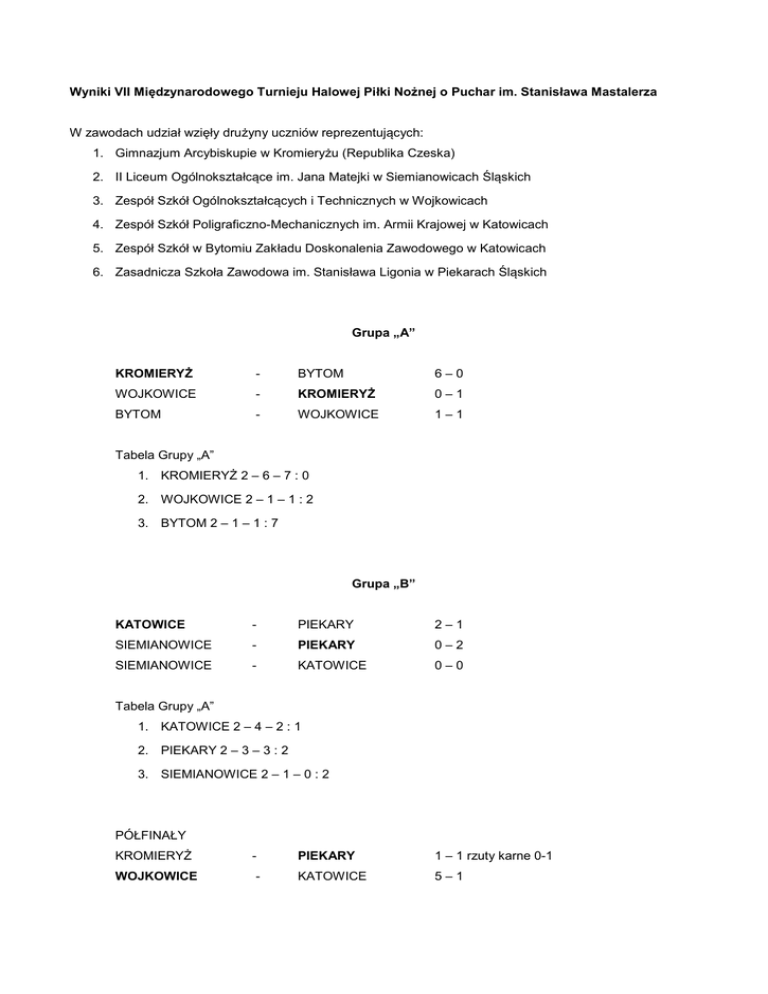 Wyniki VII Międzynarodowego Turnieju Halowej Piłki Nożnej o Puchar im. Stanisława Mastalerza W zawodach udział wzięły drużyny uczniów reprezentujących: 1. Gimnazjum Arcybiskupie w Kromieryżu (Republika Czeska) 2. II Liceum Ogólnokształcące im. Jana Matejki w Siemianowicach Śląskich 3. Zespół Szkół Ogólnokształcących i Technicznych w Wojkowicach 4. Zespół Szkół Poligraficzno-Mechanicznych im. Armii Krajowej w Katowicach 5. Zespół Szkół w Bytomiu Zakładu Doskonalenia Zawodowego w Katowicach 6. Zasadnicza Szkoła Zawodowa im. Stanisława Ligonia w Piekarach Śląskich Grupa „A” KROMIERYŻ - BYTOM 6–0 WOJKOWICE - KROMIERYŻ 0–1 BYTOM - WOJKOWICE 1–1 Tabela Grupy „A” 1. KROMIERYŻ 2 – 6 – 7 : 0 2. WOJKOWICE 2 – 1 – 1 : 2 3. BYTOM 2 – 1 – 1 : 7 Grupa „B” KATOWICE - PIEKARY 2–1 SIEMIANOWICE - PIEKARY 0–2 SIEMIANOWICE - KATOWICE 0–0 Tabela Grupy „A” 1. KATOWICE 2 – 4 – 2 : 1 2. PIEKARY 2 – 3 – 3 : 2 3. SIEMIANOWICE 2 – 1 – 0 : 2 PÓŁFINAŁY KROMIERYŻ - PIEKARY 1 – 1 rzuty karne 0-1 WOJKOWICE - KATOWICE 5–1 Mecze o miejsca o miejsce V SIEMIANOWICE - BYTOM 1–2 o miejsce III KROMIERYŻ - KATOWICE 4–0 o miejsce I WOJKOWICE - PIEKARY 1 – 1 rzuty karne 3-1 Kolejność końcowa: 1. Zespół Szkół Ogólnokształcących i Technicznych w Wojkowicach Patryk Kyrcz, Dawid Połedniok, Przemek Olejnik, Dariusz Kielanowski, Piotr Kurek, Damian Pawłowski, Daniel Piekarczyk, Damian Gęborski. 2. Zasadnicza Szkoła Zawodowa im. Stanisława Ligonia w Piekarach Śląskich Kamil Standera, Dawid Gołąbek, Łukasz Mysłek, Daniel Kisiela, Mateusz Zieliński, Mateusz Siudak, Grzegorz Zemło, Kamil Pryga, Mirosław Wołoszyn – Robert Lorenz 3. Gimnazjum Arcybiskupie w Kromieryżu (Republika Czeska) Jan Malota, Jakub Sanek, Tomas Tinka, Vojtech Hrncirik, Jan Kozubik, Martin Salek, Jan Hrncirik, Vit Jeżek, Daniel Stastny – Josef Porizek 4. Zespół Szkół Poligraficzno-Mechanicznych im. Armii Krajowej w Katowicach Michał Pochopień, Filip Kurpiński, Łukasz Pipczyński, Arkadiusz Majcher, Michał Górecki, Jakub Czarnuch, Rafał Gabzdyl – Agata Jabłońska. 5. II Liceum Ogólnokształcące im. Jana Matejki w Siemianowicach Śląskich Wojciech Kieruj, Wojciech Matuszek, Jakub Rybak, Dawid Tobolski, Konrad Śliz, Michał Siera, Krzysztof Hojka, Mateusz Szymański – Jolanta Kulik 6. Zespół Szkół w Bytomiu Zakładu Doskonalenia Zawodowego w Katowicach Mateusz Cziba, Artur Musik, Marcin Gliński, Jakub Nowak, Adrian Amanowicz, Marcin Paruzel, Bartosz Łuczyński, Janusz Łuczak, Tomasz Chudy, Maciej Rudziński, Sylwester Kołaciak, Kewin Henka.