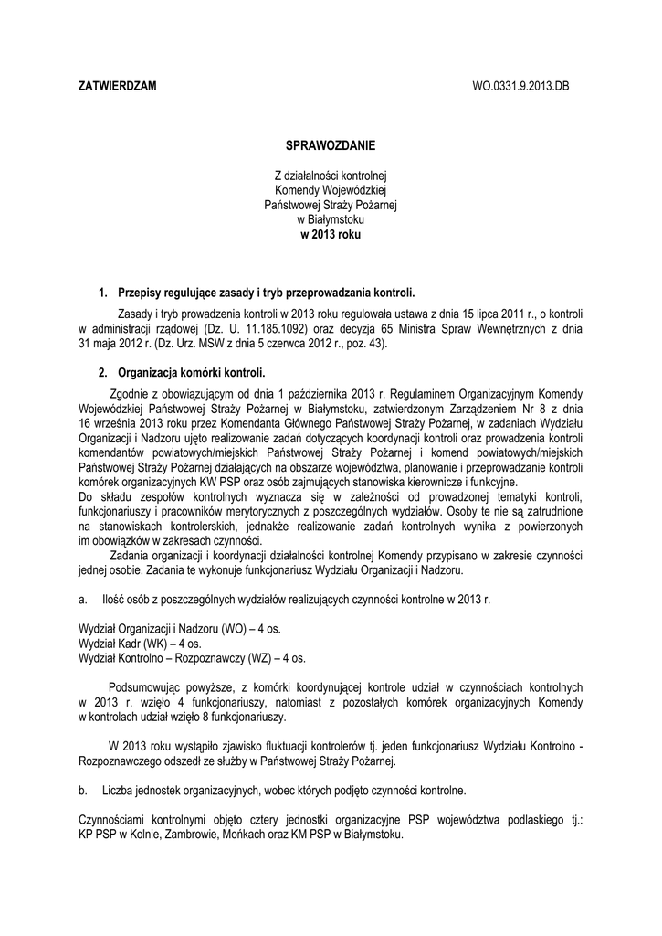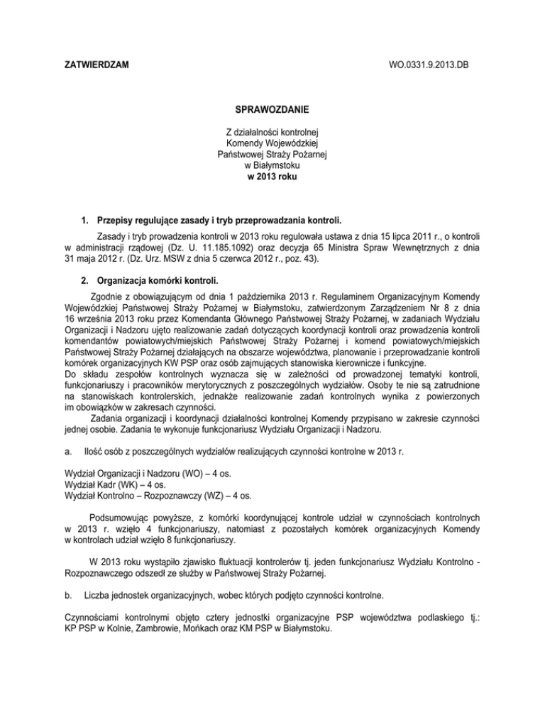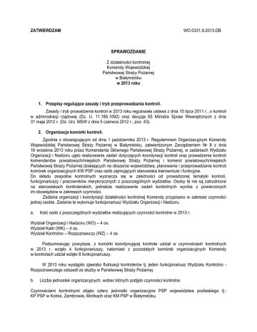 ZATWIERDZAM WO.0331.9.2013.DB SPRAWOZDANIE Z działalności kontrolnej Komendy Wojewódzkiej Państwowej Straży Pożarnej w Białymstoku w 2013 roku 1. Przepisy regulujące zasady i tryb przeprowadzania kontroli. Zasady i tryb prowadzenia kontroli w 2013 roku regulowała ustawa z dnia 15 lipca 2011 r., o kontroli w administracji rządowej (Dz. U. 11.185.1092) oraz decyzja 65 Ministra Spraw Wewnętrznych z dnia 31 maja 2012 r. (Dz. Urz. MSW z dnia 5 czerwca 2012 r., poz. 43). 2. Organizacja komórki kontroli. Zgodnie z obowiązującym od dnia 1 października 2013 r. Regulaminem Organizacyjnym Komendy Wojewódzkiej Państwowej Straży Pożarnej w Białymstoku, zatwierdzonym Zarządzeniem Nr 8 z dnia 16 września 2013 roku przez Komendanta Głównego Państwowej Straży Pożarnej, w zadaniach Wydziału Organizacji i Nadzoru ujęto realizowanie zadań dotyczących koordynacji kontroli oraz prowadzenia kontroli komendantów powiatowych/miejskich Państwowej Straży Pożarnej i komend powiatowych/miejskich Państwowej Straży Pożarnej działających na obszarze województwa, planowanie i przeprowadzanie kontroli komórek organizacyjnych KW PSP oraz osób zajmujących stanowiska kierownicze i funkcyjne. Do składu zespołów kontrolnych wyznacza się w zależności od prowadzonej tematyki kontroli, funkcjonariuszy i pracowników merytorycznych z poszczególnych wydziałów. Osoby te nie są zatrudnione na stanowiskach kontrolerskich, jednakże realizowanie zadań kontrolnych wynika z powierzonych im obowiązków w zakresach czynności. Zadania organizacji i koordynacji działalności kontrolnej Komendy przypisano w zakresie czynności jednej osobie. Zadania te wykonuje funkcjonariusz Wydziału Organizacji i Nadzoru. a. Ilość osób z poszczególnych wydziałów realizujących czynności kontrolne w 2013 r. Wydział Organizacji i Nadzoru (WO) – 4 os. Wydział Kadr (WK) – 4 os. Wydział Kontrolno – Rozpoznawczy (WZ) – 4 os. Podsumowując powyższe, z komórki koordynującej kontrole udział w czynnościach kontrolnych w 2013 r. wzięło 4 funkcjonariuszy, natomiast z pozostałych komórek organizacyjnych Komendy w kontrolach udział wzięło 8 funkcjonariuszy. W 2013 roku wystąpiło zjawisko fluktuacji kontrolerów tj. jeden funkcjonariusz Wydziału Kontrolno Rozpoznawczego odszedł ze służby w Państwowej Straży Pożarnej. b. Liczba jednostek organizacyjnych, wobec których podjęto czynności kontrolne. Czynnościami kontrolnymi objęto cztery jednostki organizacyjne PSP województwa podlaskiego tj.: KP PSP w Kolnie, Zambrowie, Mońkach oraz KM PSP w Białymstoku. c. Średni czas trwania kontroli: - od podpisania upoważnienia do czasu przekazania projektu wystąpienia pokontrolnego – dni 74 - od podpisania projektu wystąpienia pokontrolnego do przekazania wystąpienia pokontrolnego – dni 19 Podczas obliczania średniego czasu trwania kontroli nie brano pod uwagę kontroli w KM PSP w Białymstoku z uwagi na brak projektu wystąpienia pokontrolnego – kontrola odbyła się w siedzibie jednostki kontrolowanej w dniu 3 grudnia – osoba odpowiedzialną jest naczelnik Wydziału Organizacji i Nadzoru. 3. Liczba osób w komórce, które posiadają staż pracy: ogółem oraz w kontroli i/lub audycie wewnętrznym. Liczba osób posiadających ogólny staż pracy Liczba osób posiadających staż pracy w kontroli i/lub audycie* do 2 lat - - od 2 do 5 lat - 2 od 5 do 10 lat - 4 powyżej 10 lat 12 6 4. Koszty poniesione z tytułu działań kontrolnych. W 2013 roku nie poniesiono wydatków z tytułu zrealizowanych kontroli. Kontrole przeprowadzano w godzinach pracy urzędu. Delegacje służbowe były każdorazowo wystawiane kontrolerom na czas trwania kontroli, jednakże żadna z tych osób nie przedłożyła ich do rozliczenia. 5. Sposób planowania kontroli. Zakres tematyczny planowanych kontroli w jednostkach/komórkach organizacyjnych planowany jest w oparciu o informacje zbierane z poszczególnych wydziałów oraz informacje pochodzące ze skarg, mediów, kontroli zewnętrznych. Terminy przeprowadzania kontroli planowane były w ujęciu kwartalnym. Informacje o przepisach regulujących zasady i tryb tworzenia planu kontroli są przekazywane podczas odpraw naczelników. Nie prowadzono analizy ryzyka do planowania czynności kontrolnych na 2013 r. Plany kontroli tworzone są zgodnie z obowiązującymi przepisami w tym zakresie tj. ustawą z dnia 15 lipca 2011 r., o kontroli w administracji rządowej (Dz. U. 11.185.1092) oraz decyzją 65 Ministra Spraw Wewnętrznych z dnia 31 maja 2012 r. (Dz. Urz. MSW z dnia 5 czerwca 2012 r., poz. 43). 6. Ilość kontroli przeprowadzonych przez poszczególne komórki organizacyjne. Poniższe tabele przedstawiają ilość i rodzaj kontroli przeprowadzonych przez poszczególne wydziały w roku sprawozdawczym. Rodzaj kontroli: Zarządzone doraźnie Planowe - kontrole finansowo-gospodarcze* Kontrole mające charakter kompleksowy Kontrole mające charakter problemowy Kontrole mające charakter sprawdzający Kontrole mające charakter kompleksowy Kontrole mające charakter problemowy Kontrole mające charakter sprawdzający Kontrole mające charakter kompleksowy Kontrole mające charakter problemowy Kontrole mające charakter sprawdzający Kontrole mające charakter kompleksowy 1 - - - - - 1 - - - - - 1 1 - - - - - 1 - - - - - 1 wniosków o wszczęcie postępowań dyscyplinarnych 0 - - - - - 0 - - - - 0 wniosków skierowanych do prokuratury w celu wszczęcia postępowania przygotowawczego 0 - - - - - 0 - - - - 0 skierowanych zawiadomień o naruszeniu dyscypliny finansów publicznych 0 - - - - - 0 - - - - 0 kontroli rozpoczętych a niezakończonych w okresie sprawozdawczym (są to kontrole, w których na dzień 31.12.2012r. czynności kontrolne były w trakcie realizacji, lub brak było podpisanego projektu wystąpienia pokontrolnego kontrolera 0 - - - - 0 - - - - - 0 niezrealizowanych kontroli zaplanowanych na 2013 r. 0 - - - - 0 - - - - - 0 przeciętny o