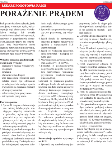 PORAŻENIE PRĄDEM REKLAMA 2155564/11 LEKARZ POGOTOWIA RADZI Praktycznie każde urządzenie, jakie stosujemy w naszym życiu, wykorzystuje prąd elektryczny. Niewłaściwa obsługa lub awaria wszelakich urządzeń elektrycznych, zarówno w gospodarstwie domowym, zakładzie pracy, czy też podczas prac budowlanych może zagrozić zdrowiu i życiu człowieka, jak też spowodować awarie, których skutkiem będą pożary i wybuchy. Wskutek porażenia prądem u człowieka mogą wystąpić: – oparzenia w miejscu wejścia i wyjścia prądu – omdlenia – złamania kości długich – uraz kręgosłupa (ponieważ ciało ludzkie może być odrzucone na odległość lub nastąpi upadek z wysokości po porażeniu prądem) – utrata przytomności – zaburzenia rytmu pracy serca – zatrzymanie pracy serca. Pierwsza pomoc 1. Sprawdź bezpieczeństwo miejsca, odetnij źródło prądu, wyciągając wtyczkę urządzenia z gniazdka, wyłączając bezpieczniki czy też wyłącznik główny – jeżeli się na tym nie znamy, należy wezwać pogotowie energetyczne (991). 2. Nie dotykaj poszkodowanego, dopóki prąd nie został odłączony, ponieważ ciało ludzkie (również zwierzęce) doskonale przewodzi prąd elektryczny. Dotknięcie osoby, która jest pod wpływem dzia- łania prądu elektrycznego, grozi porażeniem. 3. Sprawdź stan poszkodowanego: czy jest przytomny, czy oddycha. 4. Jeżeli doszło do zatrzymania krążenia, podejmij resuscytację zgodnie z wytycznymi BLS (patrz poniżej). 5. Jeżeli jest widoczne oparzenie, załóż opatrunek – najlepiej sterylną gazę. 6. Wezwij pomoc, dzwoniąc na numer alarmowy 112 lub 999. 7. Pozostań z poszkodowanym do przyjazdu zespołu ratownictwa medycznego, wspierając psychicznie poszkodowanego i jego rodzinę. Człowiek po porażeniu prądem, u którego doszło do zatrzymania krążenia, ma dużą szansę na powrót własnego krążenia po przeprowadzeniu skutecznej resuscytacji, z użyciem AED (Automatyczny Zewnętrzny Defibrylator), lub defibrylatora, który przywiezie ZRM, ponieważ najczęściej serce poszkodowanego jest zdrowe, a zatrzymanie krążenia następuje w mechanizmie migotania komór. Po zabraniu poszkodowanego do szpitala należy dołożyć wszelkiej staranności, aby fachowe osoby obejrzały wadliwe urządzenie i okablowanie, aby sytuacja nie powtórzyła się. Resuscytacja zgodnie z wytycznymi BLS: 1. Sprawdź, czy poszkodowany jest przytomny (mów do niego, gdy nie odpowiada, potrząśnij za barki lub uciśnij na mostek) – gdy brak reakcji: 2. Udrożnij drogi oddechowe (połóż rękę na czole i brodzie poszkodowanego odginając głowę do tyłu). 3. Przez 10 sekund sprawdzaj, czy oddycha (pochyl się nad twarzą, staraj się wyczuć i wysłuchać oddech i patrz na klatkę piersiową, czy się poruszyła). 4. Jeżeli wyczuwasz oddech, to znaczy, że jest też krążenie, wtedy ułóż poszkodowanego w pozycji bocznej bezpiecznej, jeżeli nie doznał urazu kręgosłupa. Gdy podejrzewasz uraz kręgosłupa u poszkodowanego, pozostaw go w pozycji na wznak z odgiętą głową do tyłu. 5. Jeżeli po udrożnieniu dróg oddechowych przez 10 sekund brak jest oddechu, to znaczy, że doszło do zatrzymania krążenia. 6. Ułóż poszkodowanego na twardym podłożu i podejmij uciskanie klatki piersiowej pośrodku mostka: ułóż ręce tak, aby nadgarstek leżał jeden na drugim, uciskaj 100-120 razy na minutę, tak aby klatka piersiowa obniżyła się o 1/3 wysokości. Jeżeli decydujesz się na wykonywanie oddechu „usta-usta” – odegnij głowę do tyłu zamykając nos i obejmując usta – wykonuj to w sekwencji 30 uciśnięć do 2 oddechów.