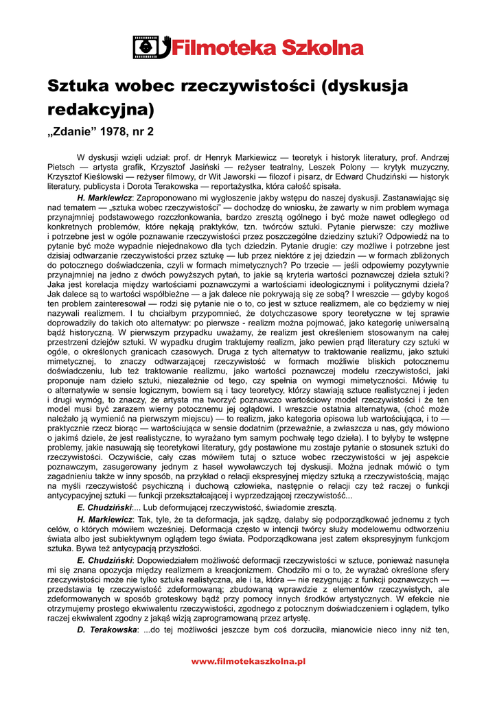 Sztuka wobec rzeczywistoci (dyskusja redakcyjna) „Zdanie” 1978, nr 2 W dyskusji wzili udzia : prof. dr Henryk Markiewicz — teoretyk i historyk literatury, prof. Andrzej Pietsch — artysta grafik, Krzysztof Jasiski — reyser teatralny, Leszek Polony — krytyk muzyczny, Krzysztof Kielowski — reyser filmowy, dr Wit Jaworski — filozof i pisarz, dr Edward Chudziski — historyk literatury, publicysta i Dorota Terakowska — reportaystka, która ca o spisa a. H. Markiewicz: Zaproponowano mi wyg oszenie jakby wstpu do naszej dyskusji. Zastanawiajc si nad tematem — „sztuka wobec rzeczywistoci” — dochodz do wniosku, e zawarty w nim problem wymaga przynajmniej podstawowego rozcz onkowania, bardzo zreszt ogólnego i by moe nawet odleg ego od konkretnych problemów, które nkaj praktyków, tzn. twórców sztuki. Pytanie pierwsze: czy moliwe i potrzebne jest w ogóle poznawanie rzeczywistoci przez poszczególne dziedziny sztuki? Odpowied na to pytanie by moe wypadnie niejednakowo dla tych dziedzin. Pytanie drugie: czy moliwe i potrzebne jest dzisiaj odtwarzanie rzeczywistoci przez sztuk — lub przez niektóre z jej dziedzin — w formach zblionych do potocznego dowiadczenia, czyli w formach mimetycznych? Po trzecie — jeli odpowiemy pozytywnie przynajmniej na jedno z dwóch powyszych pyta, to jakie s kryteria wartoci poznawczej dzie a sztuki? Jaka jest korelacja midzy wartociami poznawczymi a wartociami ideologicznymi i politycznymi dzie a? Jak dalece s to wartoci wspó biene — a jak dalece nie pokrywaj si ze sob? I wreszcie — gdyby kogo ten problem zainteresowa — rodzi si pytanie nie o to, co jest w sztuce realizmem, ale co bdziemy w niej nazywali realizmem. I tu chcia bym przypomnie, e dotychczasowe spory teoretyczne w tej sprawie doprowadzi y do takich oto alternatyw: po pierwsze - realizm mona pojmowa, jako kategori uniwersaln bd historyczn. W pierwszym przypadku uwaamy, e realizm jest okreleniem stosowanym na ca ej przestrzeni dziejów sztuki. W wypadku drugim traktujemy realizm, jako pewien prd literatury czy sztuki w ogóle, o okrelonych granicach czasowych. Druga z tych alternatyw to traktowanie realizmu, jako sztuki mimetycznej, to znaczy odtwarzajcej rzeczywisto w formach moliwie bliskich potocznemu dowiadczeniu, lub te traktowanie realizmu, jako wartoci poznawczej modelu rzeczywistoci, jaki proponuje nam dzie o sztuki, niezalenie od tego, czy spe nia on wymogi mimetycznoci. Mówi tu o alternatywie w sensie logicznym, bowiem s i tacy teoretycy, którzy stawiaj sztuce realistycznej i jeden i drugi wymóg, to znaczy, e artysta ma tworzy poznawczo wartociowy model rzeczywistoci i e ten model musi by zarazem wierny potocznemu jej ogldowi. I wreszcie ostatnia alternatywa, (cho moe nalea o j wymieni na pierwszym miejscu) — to realizm, jako kategoria opisowa lub wartociujca, i to — praktycznie rzecz biorc — wartociujca w sensie dodatnim (przewanie, a zw aszcza u nas, gdy mówiono o jakim dziele, e jest realistyczne, to wyraano tym samym pochwa tego dzie a). I to by yby te wstpne problemy, jakie nasuwaj si teoretykowi literatury, gdy postawione mu zostaje pytanie o stosunek sztuki do rzeczywistoci. Oczywicie, ca y czas mówi em tutaj o sztuce wobec rzeczywistoci w jej aspekcie poznawczym, zasugerowany jednym z hase wywo awczych tej dyskusji. Mona jednak mówi o tym zagadnieniu take w inny sposób, na przyk ad o relacji ekspresyjnej midzy sztuk a rzeczywistoci, majc na myli rzeczywisto psychiczn i duchow cz owieka, nastpnie o relacji czy te raczej o funkcji antycypacyjnej sztuki — funkcji przekszta cajcej i wyprzedzajcej rzeczywisto... E. Chudziski:... Lub deformujcej rzeczywisto, wiadomie zreszt. H. Markiewicz: Tak, tyle, e ta deformacja, jak sdz, da aby si podporzdkowa jednemu z tych celów, o których mówi em wczeniej. Deformacja czsto w intencji twórcy s uy modelowemu odtworzeniu wiata albo jest subiektywnym ogldem tego wiata. Podporzdkowana jest zatem ekspresyjnym funkcjom sztuka. Bywa te antycypacj przysz oci. E. Chudziski: Dopowiedzia em moliwo deformacji rzeczywistoci w sztuce, poniewa nasun a mi si znana opozycja midzy realizmem a kreacjonizmem. Chodzi o mi o to, e wyraa okrelone sfery rzeczywistoci moe nie tylko sztuka realistyczna, ale i ta, która — nie rezygnujc z funkcji poznawczych — przedstawia t rzeczywisto zdeformowan; zbudowan wprawdzie z elementów rzeczywistych, ale zdeformowanych w sposób groteskowy bd przy pomocy innych rodków artystycznych. W efekcie nie otrzymujemy prostego ekwiwalentu rzeczywistoci, zgodnego z potocznym dowiadczeniem i ogldem, tylko raczej ekwiwalent zgodny z jak wizj zaprogramowan przez artyst. D. Terakowska: ...do tej moliwoci jeszcze bym co dorzuci a, mianowicie nieco inny ni ten, www.filmotekaszkolna.pl o którym mowa, ale bardzo typowy rodzaj deformacji. Nie jest ona rodkiem artystycznym, jest to deformacja, owszem, wiadoma, ale dokonywana w okrelonym celu. Twórca, a mam na myli równie dziennikarzy — cho ich status zawodowy cigle nie jest jasny, mimo e cz dziennikarzy na pewno udowodnia swoje prawa bycia twórcami — otó, twórca deformuje rzeczywisto , na przykad j upiksza, liczc na yczliwe przyjcie przez mecenasów i szefów jego dziea czy cho by doranie pisanego artykuu w gazecie. Twórca myli: „Jeeli t rzeczywisto upiksz, zapewne nie spodoba si to przecitnemu odbiorcy, ale wadza, która za tym wycinkiem rzeczywistoci stoi, bdzie ze mnie zadowolona”. Bywa taka deformacja wynikiem poddania si twórcy doranym czsto wymogom tzw. chwili — wymogom politycznym, propagandowym — czy nawet wywodzi si z wewntrznego przekonania twórcy, e takie wymogi istniej. W efekcie tak zdeformowane zarówno dzieo, jak i prasowa forma wypowiedzi równie maj ,,ywot chwili”, bowiem z rzeczywistoci wrcz mijaj si. Jest to ten rodzaj deformacji, który na pewno wystpuje w dziennikarstwie, na pewno w literaturze, filmie, teatrze, by moe nawet w plastyce i muzyce, cho o tych ostatnich dwóch dziedzinach sztuki trudno by