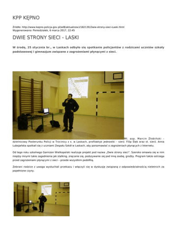 KPP KĘPNO Źródło: http://www.kepno.policja.gov.pl/wl8/aktualnosci/182139,Dwie-strony-sieci-Laski.html Wygenerowano: Poniedziałek, 6 marca 2017, 22:45 DWIE STRONY SIECI - LASKI W środę, 25 stycznia br., w Laskach odbyło się spotkanie policjantów z rodzicami uczniów szkoły podstawowej i gimnazjum związane z zagrożeniami płynącymi z sieci. Mł. asp. Marcin Żłobiński – dzielnicowy Posterunku Policji w Trzcinicy z s. w Laskach, profilaktyk jednostki – sierż. Filip Ślęk oraz st. sierż. Anna Lubojańska spotkali się z uczniami Zespołu Szkół w Laskach, aby porozmawiać o zagrożeniach płynących z Internetu. Od tego roku szkolnego Garnizon Wielkopolski realizuje projekt pod nazwa „Dwie strony sieci”. Szeroko omawia się w nim między innymi takie zagadnienia jak stalking, znęcanie się, podszywanie się pod inną osobę, groźby. Program także ostrzega przed zagrożeniami płynącymi z sieci – przede wszystkim pedofilią. Zebrani rodzice z uwaga wysłuchali przekazu i włączyli się w dyskusję związaną z odpowiedzialnością nieletnich za popełnione czyny. Ocena: 0/5 (0) Tweetnij