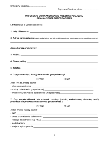 Wniosek o dofinansowanie kosztów podjęcia dzialalności