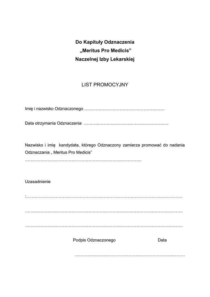 Do Kapituły Odznaczenia „Meritus Pro Medicis” Naczelnej Izby Lekarskiej LIST PROMOCYJNY Imię i nazwisko Odznaczonego ………………………………………………… Data otrzymania Odznaczenia …………………………………………………… Nazwisko i imię kandydata, którego Odznaczony zamierza promować do nadania Odznaczania „ Meritus Pro Medicis” ……………………………………………………………………….. Uzasadnienie :………………………………………………………………………………………………… …………………………………………………………………………………………………. …………………………………………………………………………………………………. Podpis Odznaczonego Data ……………………………………………………………………