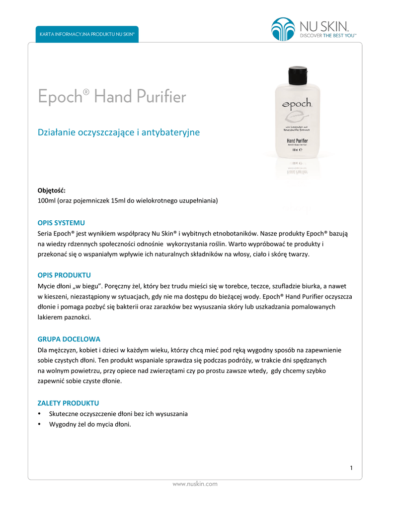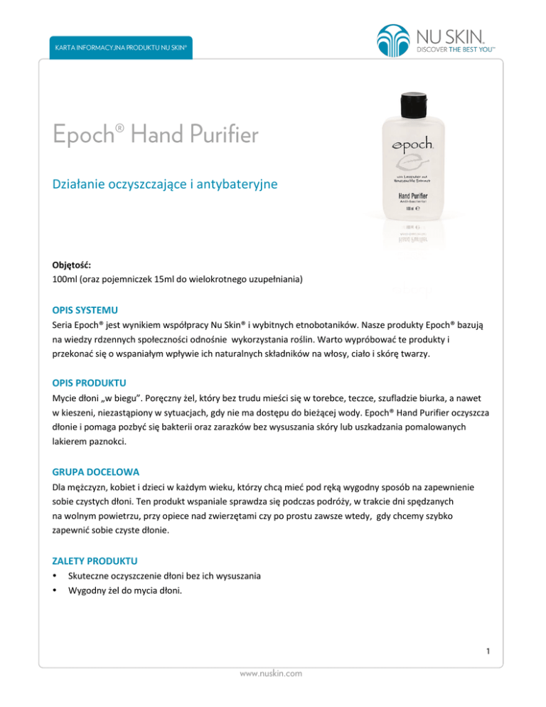 Działanie oczyszczające i antybateryjne Objętość: 100ml (oraz pojemniczek 15ml do wielokrotnego uzupełniania) OPIS SYSTEMU Seria Epoch® jest wynikiem współpracy Nu Skin® i wybitnych etnobotaników. Nasze produkty Epoch® bazują na wiedzy rdzennych społeczności odnośnie wykorzystania roślin. Warto wypróbować te produkty i przekonać się o wspaniałym wpływie ich naturalnych składników na włosy, ciało i skórę twarzy. OPIS PRODUKTU Mycie dłoni „w biegu”. Poręczny żel, który bez trudu mieści się w torebce, teczce, szufladzie biurka, a nawet w kieszeni, niezastąpiony w sytuacjach, gdy nie ma dostępu do bieżącej wody. Epoch® Hand Purifier oczyszcza dłonie i pomaga pozbyć się bakterii oraz zarazków bez wysuszania skóry lub uszkadzania pomalowanych lakierem paznokci. GRUPA DOCELOWA Dla mężczyzn, kobiet i dzieci w każdym wieku, którzy chcą mieć pod ręką wygodny sposób na zapewnienie sobie czystych dłoni. Ten produkt wspaniale sprawdza się podczas podróży, w trakcie dni spędzanych na wolnym powietrzu, przy opiece nad zwierzętami czy po prostu zawsze wtedy, gdy chcemy szybko zapewnić sobie czyste dłonie. ZALETY PRODUKTU Skuteczne oczyszczenie dłoni bez ich wysuszania Wygodny żel do mycia dłoni. KLUCZOWE SKŁADNIKI Alkohol − skutecznie usuwa zarazki i bakterie. SPOSÓB UŻYCIA Obfitą ilość produktu należy nanieść na dłonie. Rozprowadzić żel na obie dłonie i dokładnie umyć nim całe dłonie. Delikatnie wmasowywać produkt aż do wyschnięcia. CZY WIEDZIELI PAŃSTWO, ŻE...? Darowizna w postaci 0,25 USD ze sprzedaży każdego produktu serii Epoch® przekazywana jest na działalność Nu Skin Force for Good Foundation®, organizacji non-profit, której misją jest budowanie lepszego świata dla dzieci poprzez poprawę jakości życia ludzi, wspieranie kultur rdzennych społeczeństw oraz ochronę zagrożonych ekosystemów. PRODUKTY UZUPEŁNIAJĄCE Body Cleansing Gel − specjalnie opracowany żel wzbogacony ekstraktem z aloesu, który nadaje skórze miękkość i świetne samopoczucie. Stosować codziennie w trakcie prysznicu i kąpieli, a także przy regularnym myciu dłoni. Body Bar − pozbawiona mydła kostka do mycia ciała dla całej rodziny do stosowania pod prysznicem lub podczas kąpieli. Kostka Body Bar z delikatnym grejpfrutowym zapachem pozostawia skórę świeżą i czystą, znakomicie uzupełnia działanie żelu Epoch® Hand Purifier. NAJCZĘŚCIEJ ZADAWANE PYTANIA Na jak długo żel Epoch® Hand Purifier usuwa bakterie? Epoch® Hand Purifier ma antybakteryjne działanie kontaktowe. Jednak tak jak w przypadku zwykłego mycia dłoni mydłem i wodą, efekt ten nie utrzymuje się zbyt długo. Dlatego też zalecamy ponowne stosowanie żelu Epoch® Hand Purifier, gdy tylko zależy nam na uzyskaniu czystych dłoni przed posiłkiem lub po skorzystaniu z toalety. Jakie bakterie według testów usuwa żel Epoch® Hand Purifier? Produkt został przetestowano na obecność szczepów bakteryjnych E. Coli, Pseudomonas, Staphylococcus Aureus oraz Klebsiella. POKAZ Otwieramy buteleczkę Epoch® Hand Purifier i podajemy słuchaczom, dzieląc się tym produktem z innymi najlepiej możemy pokazać jego działanie i omówić jego skuteczność. Produkt świetnie sprawdza się w trakcie podróży, gdy spędza się czas na świeżym powietrzu lub w innej podobnej sytuacji, gdy zależy nam na błyskawicznym oczyszczeniu dłoni. SKŁADNIKI Alcohol Denat., Aqua, Lonicera Japonica Leaf Extract, Carbomer, PEG-40 Hydrogenated Castor Oil, Aminomethyl Propanol, Parfum, Chlorphenesin, Phenoxyethanol, Methylparaben, Disodium EDTA, Ethylparaben, Limonene, Linalool. Niniejszy dokument jest przeznaczony wyłącznie do użytku wewnętrznego pracowników i niezależnych Dystrybutorów Nu Skin Enterprises EMEA i nie może zostać przekazany do wiadomości publicznej.