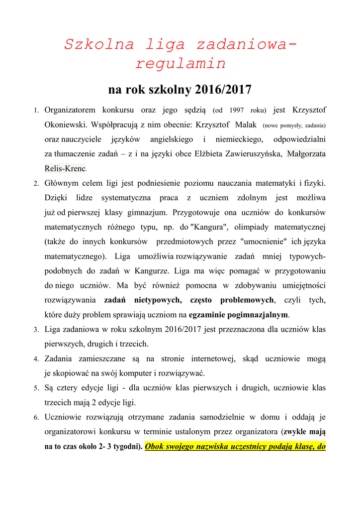 Szkolna liga zadaniowaregulamin na rok szkolny 2016/2017 1. Organizatorem konkursu oraz jego sędzią (od 1997 roku) jest Krzysztof Okoniewski. Współpracują z nim obecnie: Krzysztof Malak oraz nauczyciele języków angielskiego i (nowe pomysły, zadania) niemieckiego, odpowiedzialni za tłumaczenie zadań – z i na języki obce Elżbieta Zawieruszyńska, Małgorzata Relis-Krenc. 2. Głównym celem ligi jest podniesienie poziomu nauczania matematyki i fizyki. Dzięki lidze systematyczna praca z uczniem zdolnym jest możliwa już od pierwszej klasy gimnazjum. Przygotowuje ona uczniów do konkursów matematycznych różnego typu, np. do "Kangura", olimpiady matematycznej (także do innych konkursów przedmiotowych przez "umocnienie" ich języka matematycznego). Liga umożliwia rozwiązywanie zadań mniej typowychpodobnych do zadań w Kangurze. Liga ma więc pomagać w przygotowaniu do niego uczniów. Ma być również pomocna w zdobywaniu umiejętności rozwiązywania zadań nietypowych, często problemowych, czyli tych, które duży problem sprawiają uczniom na egzaminie pogimnazjalnym. 3. Liga zadaniowa w roku szkolnym 2016/2017 jest przeznaczona dla uczniów klas pierwszych, drugich i trzecich. 4. Zadania zamieszczane są na stronie internetowej, skąd uczniowie mogą je skopiować na swój komputer i rozwiązywać. 5. Są cztery edycje ligi - dla uczniów klas pierwszych i drugich, uczniowie klas trzecich mają 2 edycje ligi. 6. Uczniowie rozwiązują otrzymane zadania samodzielnie w domu i oddają je organizatorowi konkursu w terminie ustalonym przez organizatora (zwykle mają na to czas około 2- 3 tygodni). Obok swojego nazwiska uczestnicy podają klasę, do której uczęszczają i numer z dziennika. Jeśli będzie dużo uczestników ligi, to jej wyniki będą umieszczane na stronie www szkoły. 7. Wyniki ogłaszane są najpóźniej po 3 tygodniach od zebrania ostatnich dostarczonych przez uczniów zadań. 8. Wyniki ligi mogą być uwiarygodnione, jeżeli widać, że uczeń sam nie liczył zadań. Polega to na sprawdzeniu, czy uczeń zna zastosowane przez siebie w zadaniach metody. 9. W przypadku pierwszej negatywnej weryfikacji uczeń nie otrzymuje punktów za niezweryfikowane zadanie. Każda następna niepozytywna weryfikacja to 0 punktów za cały etap ligi. 10. Jeśli będzie potrzebna weryfikacja, to termin oddania wyników uczniom, wydłuża się ponad ustalony w punkcie siódmym. 11. Najlepsi uczniowie z klas trzecich, drugich i pierwszych biorą udział w finale - (najczęściej na przełomie kwietnia-maja, do dziesięciu osób z danego poziomu klasowego). Uczniowie dostają zadania i liczą je po lekcjach, w szkole. Czas na obliczenie zadań - 1 godzina zegarowa. 12. Punktację końcową oblicza się następująco - do punktów za 4 (2) edycje ligi - tabela - załącznik 1 dodaje się punkty uzyskane w finale pisemnym. 13. Szkolnym mistrzem ligi z danego poziomu klasowego zostaje uczeń z klasy 1,2 lub 3, który ma najlepszy wynik w finale i eliminacjach ligi! 14. Nagrody otrzymują: mistrzowie Ligi zadaniowej z klas pierwszej, drugiej i trzeciej, a w razie możliwości osoby, które zajęły miejsca 2 i 3 w kategorii tych klas. 15. Dodatkową nagrodą może być dla uczniów wszystkich klas (finalistów) podniesienie oceny końcowej z matematyki i fizyki o jedną w górę. Warunkiem otrzymania wyższej oceny jest zdobycie 90% możliwych do zdobycia punktów za zadania fizyczne, osobno 90% możliwych do zdobycia punktów za zadania matematyczne (w eliminacjach i finale!!! - czyli trzeba być finalistą!!. 16. Zadania matematyczne i fizyczne będą wyróżnione w lidze znakami F i M. 17. Wszystkie inne sprawy, nieujęte w powyższym regulaminie, rozstrzyga organizator ligi. Załącznik 1: tabela Punkty zdobyte za 4 (2) edycje ligi - w % Punkty zaliczone do finału ponad 100% 12 punktów ponad 91 % 10 punktów 81 - 90 % 8 punktów 71 - 80 % 6 punktów 61 - 70 % 5 punktów 51 - 60 % 4 punkty 41 -50 % 3 punkty 31 - 40 % 2 punkty
