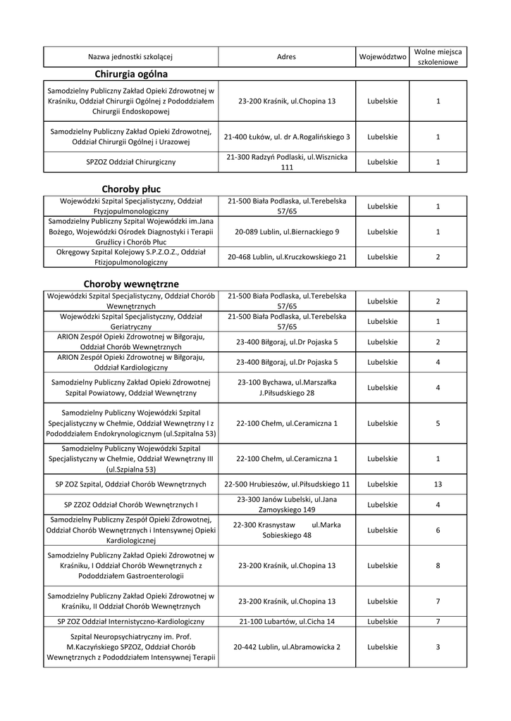 Adres Województwo Wolne miejsca szkoleniowe Samodzielny Publiczny Zakład Opieki Zdrowotnej w Kraśniku, Oddział Chirurgii Ogólnej z Pododdziałem Chirurgii Endoskopowej 23-200 Kraśnik, ul.Chopina 13 Lubelskie 1 Samodzielny Publiczny Zakład Opieki Zdrowotnej, Oddział Chirurgii Ogólnej i Urazowej 21-400 Łuków, ul. dr A.Rogalińskiego 3 Lubelskie 1 SPZOZ Oddział Chirurgiczny 21-300 Radzyń Podlaski, ul.Wisznicka 111 Lubelskie 1 21-500 Biała Podlaska, ul.Terebelska 57/65 Lubelskie 1 20-089 Lublin, ul.Biernackiego 9 Lubelskie 1 20-468 Lublin, ul.Kruczkowskiego 21 Lubelskie 2 Lubelskie 2 Lubelskie 1 23-400 Biłgoraj, ul.Dr Pojaska 5 Lubelskie 2 Nazwa jednostki szkolącej Chirurgia ogólna Choroby płuc Wojewódzki Szpital Specjalistyczny, Oddział Ftyzjopulmonologiczny Samodzielny Publiczny Szpital Wojewódzki im.Jana Bożego, Wojewódzki Ośrodek Diagnostyki i Terapii Gruźlicy i Chorób Płuc Okręgowy Szpital Kolejowy S.P.Z.O.Z., Oddział Ftizjopulmonologiczny Choroby wewnętrzne Wojewódzki Szpital Specjalistyczny, Oddział Chorób Wewnętrznych Wojewódzki Szpital Specjalistyczny, Oddział Geriatryczny ARION Zespół Opieki Zdrowotnej w Biłgoraju, Oddział Chorób Wewnętrznych ARION Zespół Opieki Zdrowotnej w Biłgoraju, Oddział Kardiologiczny 21-500 Biała Podlaska, ul.Terebelska 57/65 21-500 Biała Podlaska, ul.Terebelska 57/65 23-400 Biłgoraj, ul.Dr Pojaska 5 Lubelskie 4 Samodzielny Publiczny Zakład Opieki Zdrowotnej Szpital Powiatowy, Oddział Wewnętrzny 23-100 Bychawa, ul.Marszałka J.Piłsudskiego 28 Lubelskie 4 Samodzielny Publiczny Wojewódzki Szpital Specjalistyczny w Chełmie, Oddział Wewnętrzny I z Pododdziałem Endokrynologicznym (ul.Szpitalna 53) 22-100 Chełm, ul.Ceramiczna 1 Lubelskie 5 Samodzielny Publiczny Wojewódzki Szpital Specjalistyczny w Chełmie, Oddział Wewnętrzny III (ul.Szpialna 53) 22-100 Chełm, ul.Ceramiczna 1 Lubelskie 1 SP ZOZ Szpital, Oddział Chorób Wewnętrznych 22-500 Hrubieszów, ul.Piłsudskiego 11 Lubelskie 13 SP ZZOZ Oddział Chorób Wewnętrznych I 23-300 Janów Lubelski, ul.Jana Zamoyskiego 149 Lubelskie 4 Samodzielny Publiczny Zespół Opieki Zdrowotnej, Oddział Chorób Wewnętrznych i Intensywnej Opieki Kardiologicznej 22-300 Krasnystaw ul.Marka Sobieskiego 48 Lubelskie 6 Samodzielny Publiczny Zakład Opieki Zdrowotnej w Kraśniku, I Oddział Chorób Wewnętrznych z Pododdziałem Gastroenterologii 23-200 Kraśnik, ul.Chopina 13 Lubelskie 8 Samodzielny Publiczny Zakład Opieki Zdrowotnej w Kraśniku, II Oddział Chorób Wewnętrznych 23-200 Kraśnik, ul.Chopina 13 Lubelskie 7 SP ZOZ Oddział Internistyczno-Kardiologiczny 21-100 Lubartów, ul.Cicha 14 Lubelskie 7 Szpital Neuropsychiatryczny im. Prof. M.Kaczyńskiego SPZOZ, Oddział Chorób Wewnętrznych z Pododdziałem Intensywnej Terapii 20-442 Lublin, ul.Abramowicka 2 Lubelskie 3 Wojewódzki Szpital Specjalistyczny im.Stefana Kardynała Wyszyńskiego SPZOZ, Oddział Kardiologii z Pododdziałem Kardiologii Inwazyjnej 20-718 Lublin, Al.Kraśnicka 100 Lubelskie 1 Wojewódzki Szpital Specjalistyczny im. Stefana Kardynała Wyszyńskiego, Oddział Gastroenterologii 20-718 Lublin, Al.Kraśnicka 100 Lubelskie 4 20-718 Lublin, Al.Kraśnicka 100 Lubelskie 1 20-089 Lublin, ul.Biernackiego 9 Lubelskie 4 20-950 Lublin, ul.Jaczewskiego 2 Lubelskie 7 20-954 Lublin, ul.Jaczewskiego 8 Lubelskie 5 20-954 Lublin, ul.Jaczewskiego 8 Lubelskie 3 20-954 Lublin, ul.Jaczewskiego 8 Lubelskie 7 20-954 Lublin, ul.Jaczewskiego 8 Lubelskie 5 20-468 Lublin, ul.Kruczkowskiego 21 Lubelskie 2 20-081 Lublin, ul.Staszica 11 Lubelskie 9 SP ZOZ, Oddział Wewnętrzno-Kardiologiczny 21-400 Łuków, ul. dr A.Rogalińskiego 3 Lubelskie 7 SP ZOZ Szpital Powiatowy, Oddział Chorób Wewnętrznych w Poniatowej 24-300 Opole Lubelskie, ul.Przemysłowa 4a Lubelskie 6 Samodzielny Publiczny Zakład Opieki Zdrowotnej w Parczewie, Oddział Internistyczno-Kardiologiczny 21-200 Parczew, ul.Kościelna 124 Lubelskie 8 SP ZOZ Szpital Specjalistyczny, Oddział Wewnętrzny 24-100 Puławy, ul.Bema 1 Lubelskie 4 SP ZOZ Szpital Specjalistyczny, Oddział Kardiologii 24-100 Puławy, ul.Bema 1 Lubelskie 1 SPZOZ Szpital Rejonowy im. Prof. F.Skubiszewskiego, Oddział Chorób Wewnętrznych i Kardiologii 21-300 Radzyń Podlaski, ul.Wisznicka 111 Lubelskie 5 Lubelskie 1 21-040 Świdnik, ul.B.Leśmiana 4 Lubelskie 3 21-040 Świdnik, ul.B.Leśmiana 4 Lubelskie 6 22-600 Tomaszów Lubelski, Al.Grunwaldzkie 1 Lubelskie 5 Lubelskie 2 Lubelskie 3 Lubelskie 18 Wojewódzki Szpital Specjalistyczny im.Stefana Kardynała Wyszyńskiego SPZOZ, Oddział Nefrologii i Nadciśnienia Tętniczego Samodzielny Publiczny Szpital Wojewódzki im. Jana Bożego, Oddział Internistyczny Instytut Medycyny Wsi, Klinika Chorób Wewnętrznych, Zawodowych i Toksykologii SP Szpital Kliniczny nr 4 AM , Katedra i Klinika Nefrologii, Oddział Kliniczny Samodzielny Publiczny Szpital Kliniczny nr 4 AM, Katedra i Klinika Reumatologii Samodzielny Publiczny Szpital Kliniczny nr 4 AM, I Katedra i Klinika Kardiologii Samodzielny Publiczny Szpital Kliniczny nr 4, Klinika Pneumonologii, Onkologii i Alergologii Okręgowy Szpital Kolejowy SPZOZ, Oddział Internistyczno-Kardiologiczny z Intensywną Opieką Kardiologiczną SP Szpital Kliniczny nr 1 AM, Katedra i Klinika Hematoonkologii i Transplantacji Szpiku Samodzielny Publiczny Zespół Opieki Zdrowotnej, Oddział Wewnętrzny Samodzielny Publiczny Zakład Opieki Zdrowotnej w Świdniku, I Oddział Chorób Wewnetrznych (Al. Lotników Polskich 18) Samodzielny Publiczny Zakład Opieki Zdrowotnej w Świdniku, II Oddział Chorób Wewnętrznych (Al. Lotników Polskich 18) Samodzielny Publiczny Zespół Opieki Zdrowotnej w Tomaszowie Lubelskim, Oddział Wewnętrzny 22-460 Szczebrzeszyn Klukowskiego 3 ul.Dr Samodzielny Publiczny Zespół Opieki Zdrowotnej w 22-600 Tomaszów Lubelski, Tomaszowie Lubelskim, Oddział InternistycznoAl.Grunwaldzkie 1 Kardiologiczny Samodzielny Publiczny Zespół Opieki Zdrowotnej, 22-200 Włodawa Oddział Internisty