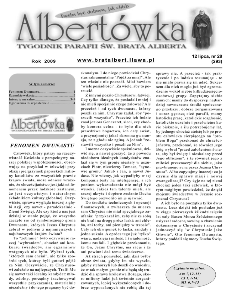 Rok 2009 W tym numerze: Fenomen Dwunastu.................................1 Rzymskie wakacje...............................................2 Intencje mszalne..................................3-4 Og³oszenia duszpasterskie .......................4 FENOMEN DWUNASTU Cz³owiek, który patrzy na rzeczywistoœæ Koœcio³a z perspektywy naszej polskiej wspó³czesnoœci, obserwuj¹c na przyk³ad w telewizji przy okazji pielgrzymek papieskich miliony katolików ze wszystkich prawie krajów œwiata, mo¿e odnieœæ wra¿enie, ¿e chrzeœcijañstwo jest jakimœ fenomenem przez ludzkoœæ zastanym, ¿e jest oczywistym i naturalnym sk³adnikiem kultury globalnej. Oczywiœcie, sprawa wygl¹da inaczej z g³êbi Azji, czy nawet - paradoksalnie Ziemi Œwiêtej. Ale czy ktoœ z nas jest dzisiaj w stanie poj¹æ, ¿e wszystko zaczê³o siê od symbolicznego grona Dwunastu, których Jezus Chrystus zebra³ w jednym z najmniejszych i najubo¿szych krajów œwiata? To "zebranie" by³o oczywiœcie raczej "wybraniem", chocia¿ ani konkursu œwiadectw, ani egzaminów wstêpnych nie by³o. Wybra³ tych, "których sam chcia³", ale tylko spoœród tych, którzy byli gotowi pójœæ za Nim. Oczywiœcie, ¿e Chrystusowi zale¿a³o na najlepszych. Trafi³ Mu siê nawet taki idealny kandydat: m³ody, zdolny, porz¹dny (zachowywa³ wszystkie przykazania), materialnie niezale¿ny i do tego pragn¹cy byæ do- www.bratalbert.ilawa.pl skona³ym. I do niego powiedzia³ Chrystus sakramentalne "PójdŸ za mn¹!". Ale ten w³aœnie nie poszed³. Mia³ bowiem "wiele posiad³oœci". Za wiele, aby to porzuciæ. Z innymi posz³o Chrystusowi ³atwiej. Czy tylko dlatego, ¿e posiadali mniej i nie mieli specjalnie czego ¿a³owaæ? Ale przecie¿ i od tych dwunastu, którzy poszli za nim, Chrystus ¿¹da³, aby "porzucili wszystko". Przecie¿ ich ³odzie znad jeziora Genezaret, sieci, czy choæby komora celna - to by³o dla nich prawdziwe bogactwo, ich ca³y œwiat, a przynajmniej jakaœ skromna gwarancja, ¿e z g³odu nie zgin¹. A jednak "zostawili wszystko i poszli za Nim". I mo¿na oczywiœcie spekulowaæ, dziwiæ siê, a nawet gorszyæ, ¿e z powodu niedoboru idealnych kandydatów znalaz³ siê w tym gronie niesta³y w uczuciach Piotr, niewierny Tomasz, "synowie gromu" Jakub i Jan, a nawet Judasz. Nie wiemy, jak wypad³yby w tej kompanii testy na inteligencjê, a ich poziom wykszta³cenia nie móg³ byæ wysoki. Jakieœ tam talenty mieli, ale raczej ukryte i dopiero zes³anie Ducha Œwiêtego pozwoli³o im je ujawniæ. Do œrodków technicznych i operacji finansowych, a zw³aszcza do miecza sam Chrystus nie mia³ specjalnego zaufania: "przykaza³ im, ¿eby nic ze sob¹ nie brali na drogê prócz laski: ani chleba, ani torby, ani pieniêdzy w trzosie". Ca³y ich ekwipunek to laska, sanda³y i jedna suknia. A oprócz tego ju¿ "tylko" wiara, nadzieja i mi³oœæ. I œwiadomoœæ, komu zaufali. I g³êbokie przekonanie, ¿e On, Jezus Chrystus, ma racjê i ¿e oni powinni daæ temu œwiadectwo. A¿ strach pomyœleæ, jaki dziœ by³by obraz œwiata, gdyby im nie wysz³o, gdyby stchórzyli lub doszli do wniosku, ¿e w tak ma³ym gronie nie bêd¹ siê trudziæ dla sprawy królestwa Bo¿ego, skoro miliony ludzi ju¿ œwietnie zorganizowanych, lepiej wykszta³conych i dobrze wyposa¿onych nie robi¹ dla tej 12 lipca, nr 28 (293) sprawy nic. A przecie¿ - tak praktycznie i po ludzku rozumuj¹c - to nie mia³o prawa siê im udaæ. Sukcesem dla nich mog³o ju¿ byæ zgromadzenie wokó³ siebie kilkudziesiêcioosobowej grupy. Zapytajmy siebie samych: mamy do dyspozycji najbardziej nowoczesne œrodki spo³ecznego przekazu, dobrze zorganizowan¹ i coraz gêstsz¹ sieæ parafii, mamy katolick¹ prasê, katolickie rozg³oœnie, katolickie uczelnie i przeœwietne kurie biskupie, a ilu potrzebujemy lat, by jednego chocia¿ ateistê lub po prostu cz³owieka cierpi¹cego na "problem Boga" przekonaæ do chrzeœcijañstwa, przekonaæ, ¿e równie¿ jego Bóg wybra³ "przed za³o¿eniem œwiata, aby by³ œwiêty i nieskalany przed Jego obliczem", i ¿e równie¿ jego z mi³oœci przeznaczy³ dla siebie, jako przybranego syna przez Jezusa Chrystusa". Albo zapytajmy inaczej: co ja czyniê dla sprawy misji i nowej ewangelizacji? Czy ¿yje na tej ziemi chocia¿ jeden taki cz³owiek, o którym móg³bym powiedzieæ, ¿e dziêki mojemu œwiadectwu w Jezusie rozpozna³ Chrystusa? A ich by³o na pocz¹tku tylko dwunastu. Lecz dziêki ich pos³udze ju¿ w ci¹gu pierwszych kilkudziesiêciu lat ca³y Basen Morza Œródziemnego us³ysza³ radosn¹ nowinê o zbawieniu dokonanym w Chrystusie i zaczyna³ jednoczyæ siê "w Chrystusie jako G³owie". Oto fenomen Dwunastu, którzy poddali siê mocy Ducha Œwiêtego. Czytania mszalne: Am 7,12-15; Ef 1,3-14; Mk 6,7-13 RZYMSKIE WAKACJE Dnia 19 czerwca to dla wszystkich dzieci radosna chwila odbioru œwiadectw i œwiadomoœæ, ¿e najbli¿sze 2 miesi¹ce to zas³u¿ony czas odpoczynku, po ca³ym roku nauki. Z tak¹ radoœci¹ kolejnego dnia 20 czerwca grupa pielgrzymów z ksiêdzem dziekanem na czele, wyruszy³a na pielgrzymkowy szlak. Naszym celem by³o nawiedzenie grobu Ojca œw. Jana Paw³a II. Ju¿ pierwszy dzieñ naszej pielgrzymki to dla naszych najm³odszych pielgrzymów nie lada wyzwanie. Bo w dniu, kiedy rozpoczyna³y siê wakacje zamiast sobie pospaæ, musia³y obudziæ siê oko³o godziny 4 00 , by o godz. 5 00 uczestniczyæ we Mszy œw. w intencji naszej pielgrzymki. I tak oto z Bo¿ym b³ogos³awieñstwem wyruszyliœmy naszym i³awskim autokarem podziwiaj¹c polskie krajobrazy do Brna, w którym mieliœmy pierwszy nocleg. Podsumowaniem drugiego dnia naszej pielgrzymki by³a k¹piel w Adriatyku, gdy¿ zatrzymaliœmy siê w piêknie po³o¿onym miasteczku turystycznym Lido di Jesolo. I oto dzieñ trzeci - Florencja, kolebka renesansu. Florencja to nie miasto z zabytkami - to miasto zabytek. Na ka¿dym kroku widaæ tu historiê. A wœród tych zabytków na pierwsze miejsce wysuwa siê pokryta bia³ym, ró¿owym