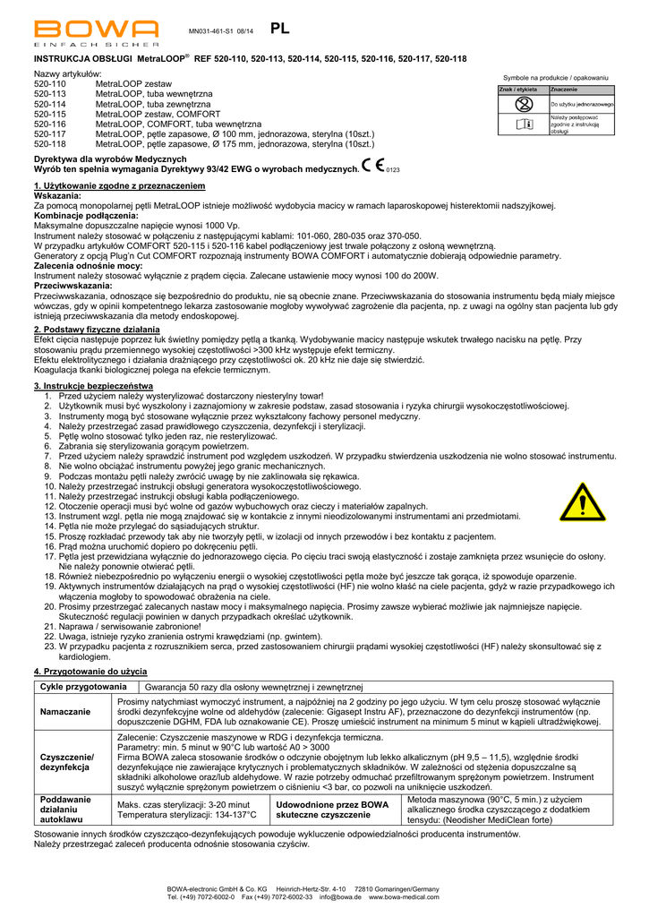 MN031-461-S1 08/14 PL INSTRUKCJA OBSŁUGI MetraLOOP® REF 520-110, 520-113, 520-114, 520-115, 520-116, 520-117, 520-118 Nazwy artykułów: 520-110 MetraLOOP zestaw 520-113 MetraLOOP, tuba wewnętrzna 520-114 MetraLOOP, tuba zewnętrzna 520-115 MetraLOOP zestaw, COMFORT 520-116 MetraLOOP, COMFORT, tuba wewnętrzna 520-117 MetraLOOP, pętle zapasowe, Ø 100 mm, jednorazowa, sterylna (10szt.) 520-118 MetraLOOP, pętle zapasowe, Ø 175 mm, jednorazowa, sterylna (10szt.) Dyrektywa dla wyrobów Medycznych Wyrób ten spełnia wymagania Dyrektywy 93/42 EWG o wyrobach medycznych. Symbole na produkcie / opakowaniu 0123 1. Użytkowanie zgodne z przeznaczeniem Wskazania: Za pomocą monopolarnej pętli MetraLOOP istnieje możliwość wydobycia macicy w ramach laparoskopowej histerektomii nadszyjkowej. Kombinacje podłączenia: Maksymalne dopuszczalne napięcie wynosi 1000 Vp. Instrument należy stosować w połączeniu z następującymi kablami: 101-060, 280-035 oraz 370-050. W przypadku artykułów COMFORT 520-115 i 520-116 kabel podłączeniowy jest trwale połączony z osłoną wewnętrzną. Generatory z opcją Plug’n Cut COMFORT rozpoznają instrumenty BOWA COMFORT i automatycznie dobierają odpowiednie parametry. Zalecenia odnośnie mocy: Instrument należy stosować wyłącznie z prądem cięcia. Zalecane ustawienie mocy wynosi 100 do 200W. Przeciwwskazania: Przeciwwskazania, odnoszące się bezpośrednio do produktu, nie są obecnie znane. Przeciwwskazania do stosowania instrumentu będą miały miejsce wówczas, gdy w opinii kompetentnego lekarza zastosowanie mogłoby wywoływać zagrożenie dla pacjenta, np. z uwagi na ogólny stan pacjenta lub gdy istnieją przeciwwskazania dla metody endoskopowej. 2. Podstawy fizyczne działania Efekt cięcia następuje poprzez łuk świetlny pomiędzy pętlą a tkanką. Wydobywanie macicy następuje wskutek trwałego nacisku na pętlę. Przy stosowaniu prądu przemiennego wysokiej częstotliwości >300 kHz występuje efekt termiczny. Efektu elektrolitycznego i działania drażniącego przy częstotliwości ok. 20 kHz nie daje się stwierdzić. Koagulacja tkanki biologicznej polega na efekcie termicznym. 3. Instrukcje bezpieczeństwa 1. Przed użyciem należy wysterylizować dostarczony niesterylny towar! 2. Użytkownik musi być wyszkolony i zaznajomiony w zakresie podstaw, zasad stosowania i ryzyka chirurgii wysokoczęstotliwościowej. 3. Instrumenty mogą być stosowane wyłącznie przez wykształcony fachowy personel medyczny. 4. Należy przestrzegać zasad prawidłowego czyszczenia, dezynfekcji i sterylizacji. 5. Pętlę wolno stosować tylko jeden raz, nie resterylizować. 6. Zabrania się sterylizowania gorącym powietrzem. 7. Przed użyciem należy sprawdzić instrument pod względem uszkodzeń. W przypadku stwierdzenia uszkodzenia nie wolno stosować instrumentu. 8. Nie wolno obciążać instrumentu powyżej jego granic mechanicznych. 9. Podczas montażu pętli należy zwrócić uwagę by nie zaklinowała się rękawica. 10. Należy przestrzegać instrukcji obsługi generatora wysokoczęstotliwościowego. 11. Należy przestrzegać instrukcji obsługi kabla podłączeniowego. 12. Otoczenie operacji musi być wolne od gazów wybuchowych oraz cieczy i materiałów zapalnych. 13. Instrument wzgl. pętla nie mogą znajdować się w kontakcie z innymi nieodizolowanymi instrumentami ani przedmiotami. 14. Pętla nie może przylegać do sąsiadujących struktur. 15. Proszę rozkładać przewody tak aby nie tworzyły pętli, w izolacji od innych przewodów i bez kontaktu z pacjentem. 16. Prąd można uruchomić dopiero po dokręceniu pętli. 17. Pętla jest przewidziana wyłącznie do jednorazowego cięcia. Po cięciu traci swoją elastyczność i zostaje zamknięta przez wsunięcie do osłony. Nie należy ponownie otwierać pętli. 18. Również niebezpośrednio po wyłączeniu energii o wysokiej częstotliwości pętla może być jeszcze tak gorąca, iż spowoduje oparzenie. 19. Aktywnych instrumentów działających na prąd o wysokiej częstotliwości (HF) nie wolno kłaść na ciele pacjenta, gdyż w razie przypadkowego ich włączenia mogłoby to spowodować obrażenia na ciele. 20. Prosimy przestrzegać zalecanych nastaw mocy i maksymalnego napięcia. Prosimy zawsze wybierać możliwie jak najmniejsze napięcie. Skuteczność regulacji powinien w danych przypadkach określać użytkownik. 21. Naprawa / serwisowanie zabronione! 22. Uwaga, istnieje ryzyko zranienia ostrymi krawędziami (np. gwintem). 23. W przypadku pacjenta z rozrusznikiem serca, przed zastosowaniem chirurgii prądami wysokiej częstotliwości (HF) należy skonsultować się z kardiologiem. 4. Przygotowanie do użycia Cykle przygotowania Namaczanie Czyszczenie/ dezynfekcja Poddawanie działaniu autoklawu Gwarancja 50 razy dla osłony wewnętrznej i zewnętrznej Prosimy natychmiast wymoczyć instrument, a najpóźniej na 2 godziny po jego użyciu. W tym celu proszę stosować wyłącznie środki dezynfekcyjne wolne od aldehydów (zalecenie: Gigasept Instru AF), przeznaczone do dezynfekcji instrumentów (np. dopuszczenie DGHM, FDA lub oznakowanie CE). Proszę umieścić instrument na minimum 5 minut w kąpieli ultradźwiękowej. Zalecenie: Czyszczenie maszynowe w RDG i dezynfekcja termiczna. Parametry: min. 5 minut w 90°C lub wartość A0 > 3000 Firma BOWA zaleca stosowanie środków o odczynie obojętnym lub lekko alkalicznym (pH 9,5 – 11,5), względnie środki dezynfekujące nie zawierające krytycznych i problematycznych składników. W zależności od stężenia dopuszczalne są składniki alkoholowe oraz/lub aldehydowe. W razie potrzeby odmuchać przefiltrowanym sprężonym powietrzem. Instrument suszyć wyłącznie sprężonym powietrzem o ciśnieniu <3 bar, co pozwoli na uniknięcie uszkodzeń. Metoda maszynowa (90°C, 5 min.) z użyciem Udowodnione przez BOWA Maks. czas sterylizacji: 3-20 minut alkalicznego środka czyszczącego z dodatkiem skuteczne czyszczenie Temperatura