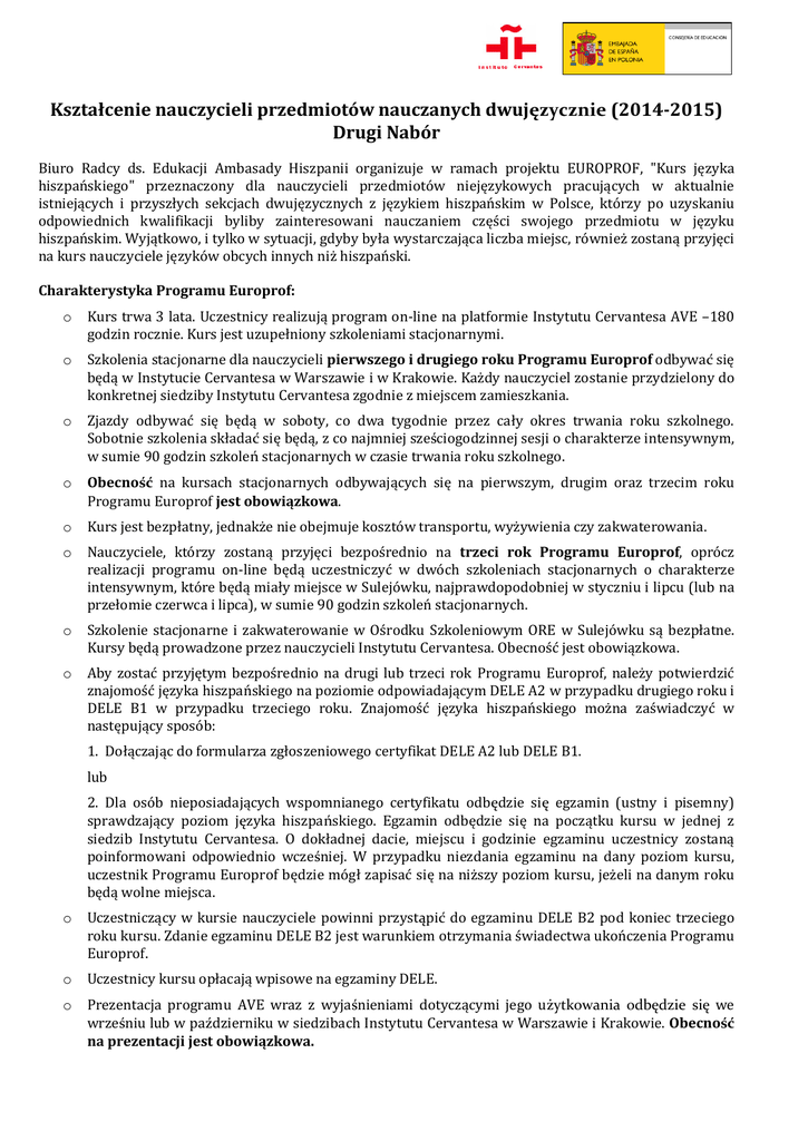 Kształcenie nauczycieli przedmiotów nauczanych dwujęzycznie (2014-2015) Drugi Nabór Biuro Radcy ds. Edukacji Ambasady Hiszpanii organizuje w ramach projektu EUROPROF, "Kurs języka hiszpańskiego" przeznaczony dla nauczycieli przedmiotów niejęzykowych pracujących w aktualnie istniejących i przyszłych sekcjach dwujęzycznych z językiem hiszpańskim w Polsce, którzy po uzyskaniu odpowiednich kwalifikacji byliby zainteresowani nauczaniem części swojego przedmiotu w języku hiszpańskim. Wyjątkowo, i tylko w sytuacji, gdyby była wystarczająca liczba miejsc, również zostaną przyjęci na kurs nauczyciele języków obcych innych niż hiszpański. Charakterystyka Programu Europrof: o Kurs trwa 3 lata. Uczestnicy realizują program on-line na platformie Instytutu Cervantesa AVE –180 godzin rocznie. Kurs jest uzupełniony szkoleniami stacjonarnymi. o Szkolenia stacjonarne dla nauczycieli pierwszego i drugiego roku Programu Europrof odbywać się będą w Instytucie Cervantesa w Warszawie i w Krakowie. Każdy nauczyciel zostanie przydzielony do konkretnej siedziby Instytutu Cervantesa zgodnie z miejscem zamieszkania. o Zjazdy odbywać się będą w soboty, co dwa tygodnie przez cały okres trwania roku szkolnego. Sobotnie szkolenia składać się będą, z co najmniej sześciogodzinnej sesji o charakterze intensywnym, w sumie 90 godzin szkoleń stacjonarnych w czasie trwania roku szkolnego. o Obecność na kursach stacjonarnych odbywających się na pierwszym, drugim oraz trzecim roku Programu Europrof jest obowiązkowa. o Kurs jest bezpłatny, jednakże nie obejmuje kosztów transportu, wyżywienia czy zakwaterowania. o Nauczyciele, którzy zostaną przyjęci bezpośrednio na trzeci rok Programu Europrof, oprócz realizacji programu on-line będą uczestniczyć w dwóch szkoleniach stacjonarnych o charakterze intensywnym, które będą miały miejsce w Sulejówku, najprawdopodobniej w styczniu i lipcu (lub na przełomie czerwca i lipca), w sumie 90 godzin szkoleń stacjonarnych. o Szkolenie stacjonarne i zakwaterowanie w Ośrodku Szkoleniowym ORE w Sulejówku są bezpłatne. Kursy będą prowadzone przez nauczycieli Instytutu Cervantesa. Obecność jest obowiązkowa. o Aby zostać przyjętym bezpośrednio na drugi lub trzeci rok Programu Europrof, należy potwierdzić znajomość języka hiszpańskiego na poziomie odpowiadającym DELE A2 w przypadku drugiego roku i DELE B1 w przypadku trzeciego roku. Znajomość języka hiszpańskiego można zaświadczyć w następujący sposób: 1. Dołączając do formularza zgłoszeniowego certyfikat DELE A2 lub DELE B1. lub 2. Dla osób nieposiadających wspomnianego certyfikatu odbędzie się egzamin (ustny i pisemny) sprawdzający poziom języka hiszpańskiego. Egzamin odbędzie się na początku kursu w jednej z siedzib Instytutu Cervantesa. O dokładnej dacie, miejscu i godzinie egzaminu uczestnicy zostaną poinformowani odpowiednio wcześniej. W przypadku niezdania egzaminu na dany poziom kursu, uczestnik Programu Europrof będzie mógł zapisać się na niższy poziom kursu, jeżeli na danym roku będą wolne miejsca. o Uczestniczący w kursie nauczyciele powinni przystąpić do egzaminu DELE B2 pod koniec trzeciego roku kursu. Zdanie egzaminu DELE B2 jest warunkiem otrzymania świadectwa ukończenia Programu Europrof. o Uczestnicy kursu opłacają wpisowe na egzaminy DELE. o Prezentacja programu AVE wraz z wyjaśnieniami dotyczącymi jego użytkowania odbędzie się we wrześniu lub w październiku w siedzibach Instytutu Cervantesa w Warszawie i Krakowie. Obecność na prezentacji jest obowiązkowa. Warunki uczestnictwa w programie Europrof: o Pisemna deklaracja nauczyciela oraz dyrektora szkoły, że dany nauczyciel – po ukończeniu kursu – będzie nauczać części przedmiotu w języku hiszpańskim oraz zobowiązanie dyrekcji szkoły do umożliwienia nauczycielowi obecności w części stacjonarnej kursu. o Posiadanie komputera z dostępem do Internetu i środki techniczne niezbędne do realizacji kursu. ● Liczba miejsc: 15 ● Zapisy: Listownie do dnia 8 września 2014 r. w Biurze Radcy ds. Edukacji Ambasady Hiszpanii. Kopie dokumentów można wysłać wcześniej faxem lub mailem (kopie powinny posiadać pieczątkę i podpis). Informacje i zapisy: Biuro Radcy ds. Edukacji Ambasady Hiszpanii. Adres: ul. Fabryczna 16/22, lokal 22, 00-446 Warszawa, tel.: (022) 6269811-12, fax: (022)6220733. Informacje: e-mail: [email protected] UWAGA: Kurs odbędzie się tylko pod warunkiem, że zgłosi się minimum 70% uczestników. Program oraz kalendarz zajęć mogą ulec zmianie.