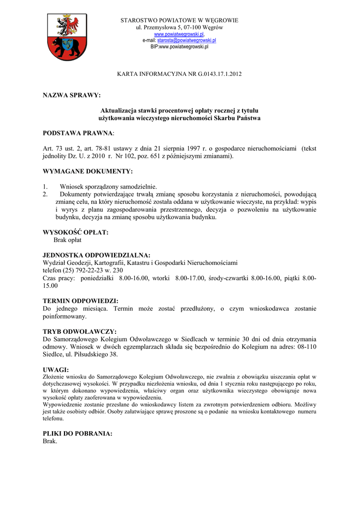 STAROSTWO POWIATOWE W WĘGROWIE ul. Przemysłowa 5, 07-100 Węgrów www.powiatwegrowski.pl, e-mail: [email protected] BIP:www.powiatwegrowski.pl KARTA INFORMACYJNA NR G.0143.17.1.2012 NAZWA SPRAWY: Aktualizacja stawki procentowej opłaty rocznej z tytułu uŜytkowania wieczystego nieruchomości Skarbu Państwa PODSTAWA PRAWNA: Art. 73 ust. 2, art. 78-81 ustawy z dnia 21 sierpnia 1997 r. o gospodarce nieruchomościami (tekst jednolity Dz. U. z 2010 r. Nr 102, poz. 651 z późniejszymi zmianami). WYMAGANE DOKUMENTY: 1. 2. Wniosek sporządzony samodzielnie. Dokumenty potwierdzające trwałą zmianę sposobu korzystania z nieruchomości, powodującą zmianę celu, na który nieruchomość została oddana w uŜytkowanie wieczyste, na przykład: wypis i wyrys z planu zagospodarowania przestrzennego, decyzja o pozwoleniu na uŜytkowanie budynku, decyzja na zmianę sposobu uŜytkowania budynku. WYSOKOŚĆ OPŁAT: Brak opłat JEDNOSTKA ODPOWIEDZIALNA: Wydział Geodezji, Kartografii, Katastru i Gospodarki Nieruchomościami telefon (25) 792-22-23 w. 230 Czas pracy: poniedziałki 8.00-16.00, wtorki 8.00-17.00, środy-czwartki 8.00-16.00, piątki 8.0015.00 TERMIN ODPOWIEDZI: Do jednego miesiąca. Termin moŜe zostać przedłuŜony, o czym wnioskodawca zostanie poinformowany. TRYB ODWOŁAWCZY: Do Samorządowego Kolegium Odwoławczego w Siedlcach w terminie 30 dni od dnia otrzymania odmowy. Wniosek w dwóch egzemplarzach składa się bezpośrednio do Kolegium na adres: 08-110 Siedlce, ul. Piłsudskiego 38. UWAGI: ZłoŜenie wniosku do Samorządowego Kolegium Odwoławczego, nie zwalnia z obowiązku uiszczania opłat w dotychczasowej wysokości. W przypadku niezłoŜenia wniosku, od dnia 1 stycznia roku następującego po roku, w którym dokonano wypowiedzenia, właściwy organ oraz uŜytkownika wieczystego obowiązuje nowa wysokość opłaty zaoferowana w wypowiedzeniu. Wypowiedzenie zostanie przesłane do wnioskodawcy listem za zwrotnym potwierdzeniem odbioru. MoŜliwy jest takŜe osobisty odbiór. Osoby załatwiające sprawę proszone są o podanie na wniosku kontaktowego numeru telefonu. PLIKI DO POBRANIA: Brak.