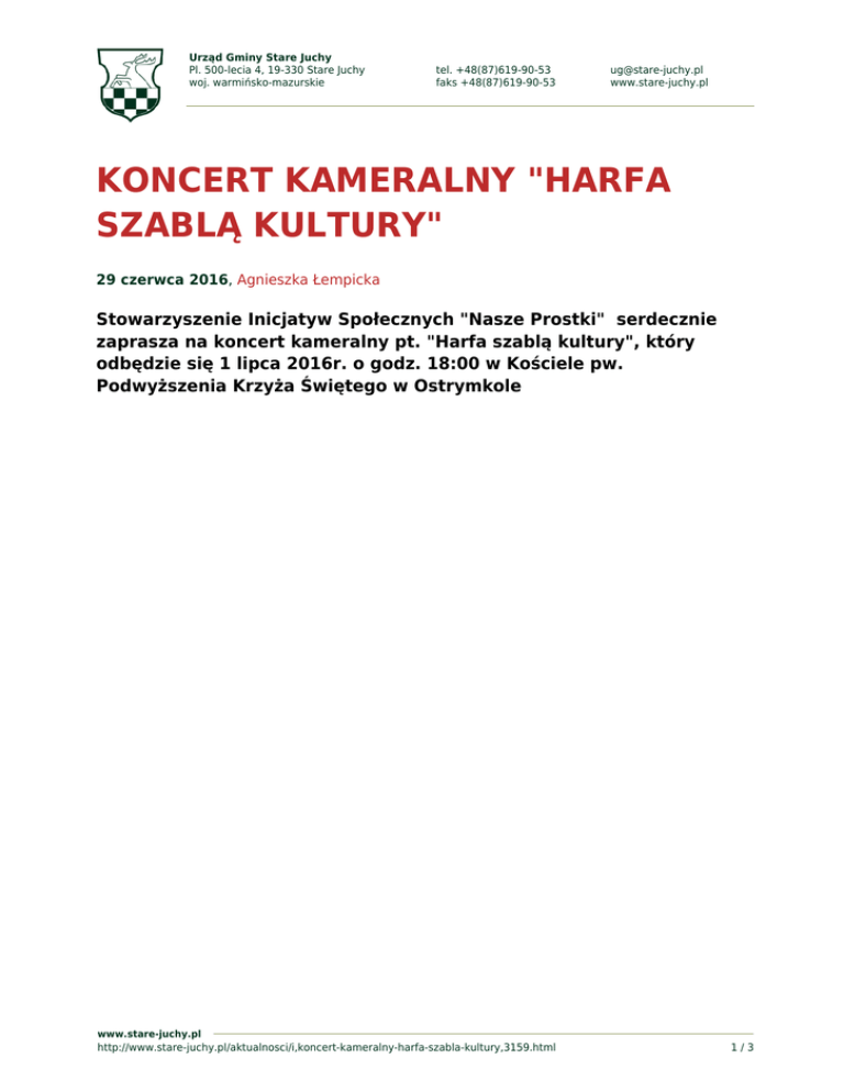 Urząd Gminy Stare Juchy Pl. 500-lecia 4, 19-330 Stare Juchy woj. warmińsko-mazurskie tel. +48(87)619-90-53 faks +48(87)619-90-53 [email protected] www.stare-juchy.pl KONCERT KAMERALNY "HARFA SZABLĄ KULTURY" 29 czerwca 2016, Agnieszka Łempicka Stowarzyszenie Inicjatyw Społecznych "Nasze Prostki" serdecznie zaprasza na koncert kameralny pt. "Harfa szablą kultury", który odbędzie się 1 lipca 2016r. o godz. 18:00 w Kościele pw. Podwyższenia Krzyża Świętego w Ostrymkole www.stare-juchy.pl http://www.stare-juchy.pl/aktualnosci/i,koncert-kameralny-harfa-szabla-kultury,3159.html 1/3 Urząd Gminy Stare Juchy Pl. 500-lecia 4, 19-330 Stare Juchy woj. warmińsko-mazurskie tel. +48(87)619-90-53 faks +48(87)619-90-53 [email protected] www.stare-juchy.pl www.stare-juchy.pl http://www.stare-juchy.pl/aktualnosci/i,koncert-kameralny-harfa-szabla-kultury,3159.html 2/3 Urząd Gminy Stare Juchy Pl. 500-lecia 4, 19-330 Stare Juchy woj. warmińsko-mazurskie tel. +48(87)619-90-53 faks +48(87)619-90-53 [email protected] www.stare-juchy.pl www.stare-juchy.pl http://www.stare-juchy.pl/aktualnosci/i,koncert-kameralny-harfa-szabla-kultury,3159.html 3/3