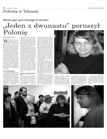 4 BIAŁY ORZEŁ . WHITE EAGLE November 19, 2010 Polonia w Teksasie „Jeden z dwunastu” poruszył Polonię Wizyta ojca Jana Koczego w Houston W MARIA KĘSTOWICZ-LECH ostatnich dniach października zawitał do Houston ojciec Jan Koczy. To kolejna duchownego wizyta duchownego w polskiej parafii. Wiele osób pamięta zapewne, że Ojciec Jan jest polskim misjonarzem i prowadzi w Ekwadorze katolicką misje. Właśnie o nim, jego pracy oraz celach misji został nakręcony przez ekipę z Warszawy film dokumentalny pt. „Jeden z dwunastu” w reżyserii Grzegorza Kasperka i Andrzeja Morawskiego. Film został zakwalifikowany do pokazu na Festiwalu Filmów Polskich a jego premiera filmu, odbyła się w Houston. Ojciec Jan został zaproszony na pokaz filmu i na spotkanie z widzami. Film, który porusza Treść filmu głęboko wzruszyła widzów. Niektórzy nie mogli powstrzymać się od łez oglądając sceny z życia ludzi w ekstremalnych warunkach, w bezgranicznej biedzie, mieszkających w szałasach skleconych z bambusowych deseczek, na bagnach, bez możliwości znalezienia ja- kiejkolwiek pracy i zdobycia środków na wyżywienie. Dzieci tam żyjące wciąż głodne i często samotne nie mają prawie żadnej szansy na wykształcenie czy opiekę zdrowotną. Tymi właśnie dziećmi opiekuje się ojciec Jan. Stara się im pomoc wszelkimi sposobami zapewniając wyżywienie, edukację, pomoc medyczną. Obecnie w misji jest 200 dzieci. Będzie ich więcej, bo wkrótce zostaną otwarte nowe ośrodki misyjne. Opieka obejmuje również rodziców dzieci organizując im różne kursy na przyuczenie do prostych zawodów. Po filmie była okazja do rozmowy z ojcem Janem. Kiedy się go widzi z bliska, nie chce się wierzyć żeby ten delikatnej postury, miły, skromny człowiek wziął na swoje barki ogromne zadania i że je z powodzeniem realizuje. Polonia z Houston pomaga Ojciec Jan odpowiadał na liczne pytania, zbierając też słowa podziwu za niestrudzoną pracę, na rzecz dzieci, za niezliczone pomysły na polepszenie ich losu, za efekty pracy w tych tak ciężkich warunkach, za wytrwałość w kontynuacji podjętych zobowiązań. Wyjaśniał warunki adopcji na odległość, dzięki której za niewielkie pieniądze można dzieciom zapewnić stałą pomoc. Przy okazji tylko tego jednego spotkania zostało zebranych przez gości festiwalowych około $ 1200 na potrzeby misji. Polacy w Houston znani są z hojności i z udzielania pomocy na szlachetne cele. Przy różnych okazjach spotkań z ojcem Janem w parafii i w prywatnych domach zostało zebranych $4850. Ojciec Jan odprawił kilkakrotnie msze w polskim kościele. Odbył także spotkania z parafianami, w czasie których opowiadał o swojej pracy i różnych związanych z nią problemach i radościach. Przy okazji można było obejrzeć zdjęcia z pobytu wolontariuszy z Houston i ich pracy w misji. Z okazji Dnia Wszystkich Świętych Thalia Kruger, która pochodzi z Ekwadoru przygotowała dla wszystkich śniadanie ekwadorskie z tradycyjnymi na ten dzień potrawami, specjalnymi bułeczkami w formie ludzików i wieloowocowym, bardzo smacznym kompotem. Halloween ojciec Jan spędził wśród Polaków u gościnnej jak zawsze Ani Sienko i choć jak amerykańska tradycja nakazuje, większość gości przyszła w przeróżnych kostiumach, jedzenie było polskie ze względu na gościa honorowego, który o polskich potrawach jak gołąbki, bigos czy pierogi może tylko pomarzyć w Ekwadorze. Fot. Sławomir Gogol W programie pobytu w Houston były także wizyty oficjalne: spotkanie z uczniami międzynarodowej szkoły AWTY i wieczór ze studentami na University of St. Thomas.