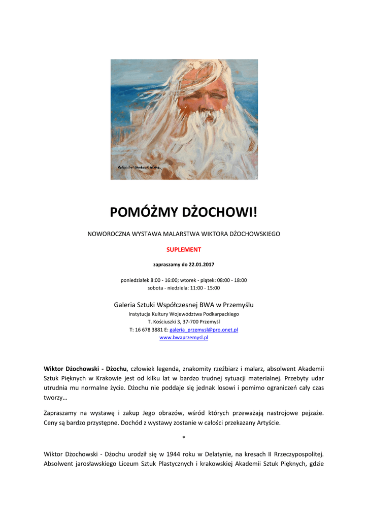 POMÓŻMY DŻOCHOWI! NOWOROCZNA WYSTAWA MALARSTWA WIKTORA DŻOCHOWSKIEGO SUPLEMENT zapraszamy do 22.01.2017 poniedziałek 8:00 - 16:00; wtorek - piątek: 08:00 - 18:00 sobota - niedziela: 11:00 - 15:00 Galeria Sztuki Współczesnej BWA w Przemyślu Instytucja Kultury Województwa Podkarpackiego T. Kościuszki 3, 37-700 Przemyśl T: 16 678 3881 E: [email protected] www.bwaprzemysl.pl Wiktor Dżochowski - Dżochu, człowiek legenda, znakomity rzeźbiarz i malarz, absolwent Akademii Sztuk Pięknych w Krakowie jest od kilku lat w bardzo trudnej sytuacji materialnej. Przebyty udar utrudnia mu normalne życie. Dżochu nie poddaje się jednak losowi i pomimo ograniczeń cały czas tworzy… Zapraszamy na wystawę i zakup Jego obrazów, wśród których przeważają nastrojowe pejzaże. Ceny są bardzo przystępne. Dochód z wystawy zostanie w całości przekazany Artyście. * Wiktor Dżochowski - Dżochu urodził się w 1944 roku w Delatynie, na kresach II Rrzeczypospolitej. Absolwent jarosławskiego Liceum Sztuk Plastycznych i krakowskiej Akademii Sztuk Pięknych, gdzie studiował rzeźbę w pracowniach prof. Jacka Pugeta i prof. Mariana Koniecznego. Dyplom w roku 1973. Członek ZPAP. Brał udział w wielu wystawach i plenerach. Ma w dorobku realizacje z zakresu polichromii, rzeźby sakralnej i malarstwa. Mieszka w Przemyślu. Kawałek Dżocha w swoim domu Dżochu, czyli Wiktor Dżochowski, to postać szczególna, od dziesięcioleci na trwałe wpisana w przemyski krajobraz. Kresowiak z urodzenia, przemyślanin z wyboru losu. Artysta, który w codziennym swoim bytowaniu wierny jest zasadzie jedności -że życie to sztuka, a sztuka to życie. Rzeźbiarz z wykształcenia, najpełniej realizujący się artystycznie w malarstwie. Nie teoretyzuje, nie kalkuluje, nie kombinuje, nie intelektualizuje, nie odmierza niczego cyrklem. Po prostu, bierze pędzel w swoją wielką łapę i „maści”. Spod jego pędzla wyłaniają się wyjątkowo subtelne, delikatne, bezpretensjonalne, emanujące ekspresją i lekkością obrazy. Tak bardzo kontrastujące z jego potężną sylwetką. Miał wiele wystaw, jego dzieła zobaczyć można zarówno w galeriach, muzeach, kościołach jak i prywatnych domach. Nadarza się wyjątkowa okazja dla tych, którzy pragną umieścić Dżocha na ścianach kolejnych mieszkań, lub też poszukują jakiegoś niebanalnego prezentu. W dniach 07 - 22.01. 2017 w Galerii Sztuki Współczesnej w Przemyślu wystawiona zostanie kolekcja jego obrazów. Prace te będzie można nabyć po okazyjnych cenach. Warto skorzystać z tej okazji. Warto mieć kawałek Dżocha, w swoim domu, aby móc z nim obcować na co dzień, a nie tylko od święta. Zdzisław Szeliga ZAPRASZAMY