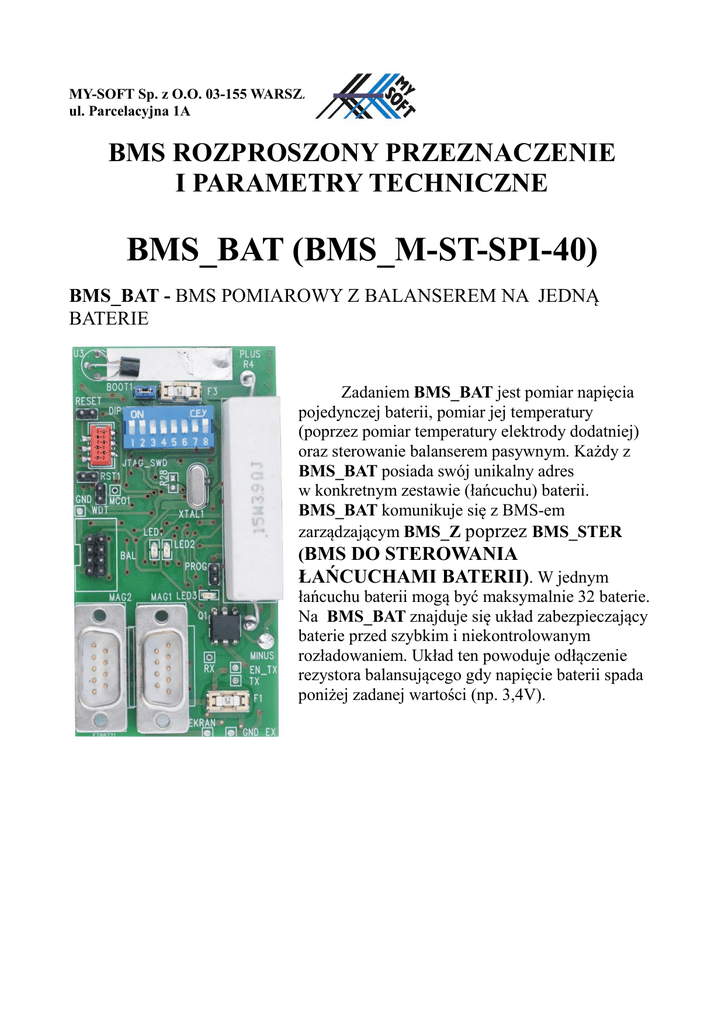 MY-SOFT Sp. z O.O. 03-155 WARSZAWA ul. Parcelacyjna 1A BMS ROZPROSZONY PRZEZNACZENIE I PARAMETRY TECHNICZNE BMS_BAT (BMS_M-ST-SPI-40) BMS_BAT - BMS POMIAROWY Z BALANSEREM NA JEDNĄ BATERIE Zadaniem BMS_BAT jest pomiar napięcia pojedynczej baterii, pomiar jej temperatury (poprzez pomiar temperatury elektrody dodatniej) oraz sterowanie balanserem pasywnym. Każdy z BMS_BAT posiada swój unikalny adres w konkretnym zestawie (łańcuchu) baterii. BMS_BAT komunikuje się z BMS-em zarządzającym BMS_Z poprzez BMS_STER (BMS DO STEROWANIA ŁAŃCUCHAMI BATERII). W jednym łańcuchu baterii mogą być maksymalnie 32 baterie. Na BMS_BAT znajduje się układ zabezpieczający baterie przed szybkim i niekontrolowanym rozładowaniem. Układ ten powoduje odłączenie rezystora balansującego gdy napięcie baterii spada poniżej zadanej wartości (np. 3,4V). MY-SOFT Sp. z O.O. 03-155 WARSZAWA ul. Parcelacyjna 1A BMS_BAT dane techniczne: ZASILANIE LICZBA OBSŁUGIWANYCH BATERII ROZDZIELCZOŚĆ POMIARU NAPIĘCIA BATERII KOMPENSACYJNE ŹRÓDŁO NAPIĘCIA ODNIESIENIA ZAKRES POMIARU NAPIĘCIA DOKŁADNOŚĆ POMIARU NAPIĘCIA POMIAR TEMPERATURY DOKŁADNOŚĆ POMIARU TEMPERATURY STEROWANIE REZYSTOREM BALANSUJĄCYM ZABEZPIECZENIE PRZED ROZŁADOWANIEM BATERII KOMUNIKACJA PRZEZ RS485 ZŁĄCZE RS485 MOŻLIWOŚĆ STEROWANIA BALANSEREM AKTYWNYM TYP KOMUNIKACJI Z BALANSEREM AKTYWNYM DIP_SWITCH do ustawiania adresu pakietu i konfiguracji NIEULOTNA PAMIĘĆ PARAMETRÓW PROCESOR O NISKIM POBORZE MOCY DODATKOWY, ZEWNĘTRZNY WATCHDOG REDUKCJA POBIERANEGO PRĄDU Z BATERII ZABEZPIECZENIE BEZPIECZNIK SZYBKI 5A ZABEZPIECZENIE OD STRONY MAGISTRALI RS485 ZABEZPIECZENIE KOMPARATORA TERMINATOR RS485 ZAKRES TEMPERATUR PRACY ZAKRES TEMPERATUR PRZECHOWYWANIA Producent: MY-SOFT Sp. z O.O. ul. Parcelacyjna 1A 03-155 Warszawa tel. 22 519 41 50 e-mail:[email protected] www.mysoft.com.pl - z pojedynczego ogniwa (2,7 – 4,5V) -1 - 12 bitów - TAK - 0 – 4,5V - +/- 3 mV - TAK - +/- 3 °C - TAK (prąd rezystora 1-3 A) - TAK (3,4V) - TAK, IZOLOWANA 1,5kV - 2 złącza po 9 pin typu DB (męskie) TAK (OPCJA) - SPI - 8 pozycji - TAK - TAK - TAK - TAK OD STRONY BATERII TRANSIL TYP A - BEZPIECZNIK SZYBKI 2A TRANSIL TYP A - 5,1 V - brak - od -30 do 50 °C - od -30 do 50 °C
