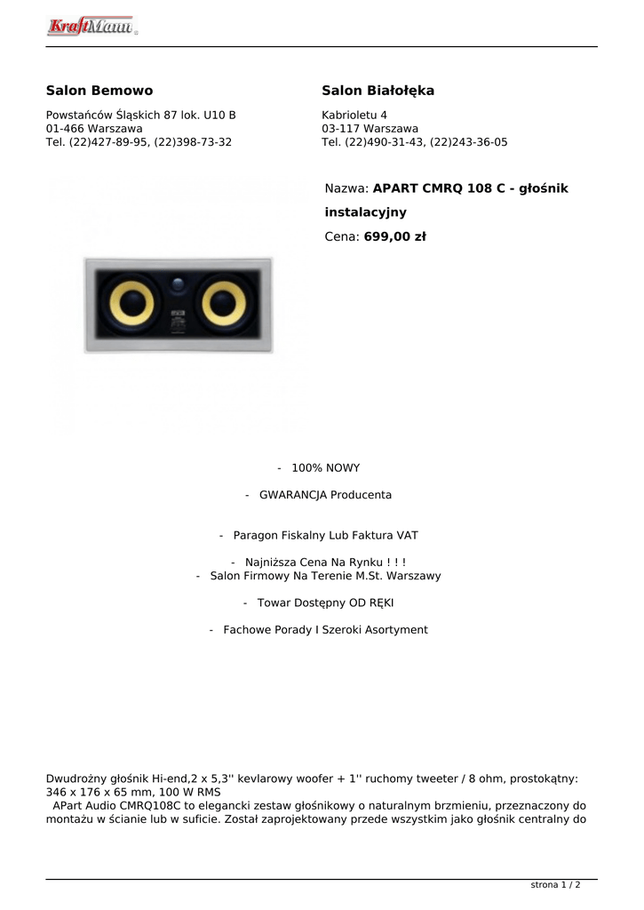 Salon Bemowo Salon Białołęka Powstańców Śląskich 87 lok. U10 B 01-466 Warszawa Tel. (22)427-89-95, (22)398-73-32 Kabrioletu 4 03-117 Warszawa Tel. (22)490-31-43, (22)243-36-05 Nazwa: APART CMRQ 108 C - głośnik instalacyjny Cena: 699,00 zł - 100% NOWY - GWARANCJA Producenta - Paragon Fiskalny Lub Faktura VAT - Najniższa Cena Na Rynku ! ! ! - Salon Firmowy Na Terenie M.St. Warszawy - Towar Dostępny OD RĘKI - Fachowe Porady I Szeroki Asortyment Dwudrożny głośnik Hi-end,2 x 5,3'' kevlarowy woofer + 1'' ruchomy tweeter / 8 ohm, prostokątny: 346 x 176 x 65 mm, 100 W RMS APart Audio CMRQ108C to elegancki zestaw głośnikowy o naturalnym brzmieniu, przeznaczony do montażu w ścianie lub w suficie. Został zaprojektowany przede wszystkim jako głośnik centralny do strona 1 / 2 systemu kina domowego, jednak może być z nie mniejszym powodzeniem użytkowany jako element stereofonicznego systemu hi-fi lub innych aplikacji, na przykład w salach klubowych, barach, butikach, hotelach, itd. Łatwy do integracji z hi-endowym systemem audio, systemem kina domowego lub wysokiej klasy systemem do odtwarzania muzyki tła, CMRQ108C oferuje niezrównaną jakość dźwięku w swojej klasie cenowej. Dzięki bardzo cienkiej widocznej części ramki mocującej oraz zdejmowanej maskownicy, która może być pomalowana na dowolny kolor, głośniki te mogą stanowić dyskretny element każdego wnętrza, niezależnie od jego charakteru i wystroju. CMRQ108C wyposażono w dwa 5,3-calowe głośniki nisko-średniotonowe DuPont z membranami z kewlaru, otoczonymi gumowymi pierścieniami o niskiej stratności. Takie rozwiązanie gwarantuje najwyższą możliwą rozdzielczość i najmniejsze podbarwienia dźwięku. Wysokie częstotliwości pokrywa 1-calowy głośnik wysokotonowy z jedwabną kopułką, dobraną specjalnie pod kątem dostarczania wyrafinowanego i szczegółowego dźwięku, pozbawionego szorstkości charakterystycznej dla tanich metalowych kopułek wysokotonowych. Nasycenie najwyższych częstotliwości można regulować zgodnie ze swoimi upodobaniami, za pomocą trójstopniowego przełącznika. Impedancja zestawu CMRQ108C wynosi 8 Ohm. Instalowanie zestawu jest łatwe i proste; zatrzaski montażowe pozwalają na montaż w ścianie lub w suficie o grubości do 28 mm. Stosując opcjonalne ramki montażowe, można je zainstalować nawet w grubych ścianach ceglanych. Przewody głośnikowe można podłączyć pewnie i bezpiecznie dzięki solidnym pozłacanym terminalom wyjściowym, akceptujących przewody o przekroju do 6 mm². Zestawy głośnikowe serii CMRQ nie są ekranowane magnetycznie, ponieważ nie jest to konieczne, za wyjątkiem przypadków zainstalowania ich w bezpośrednim sąsiedztwie telewizorów kineskopowych. Płaskie ekrany, dla których zestawy CMRQ są naturalnym uzupełnieniem, nie są wrażliwe na pola magnetyczne. Firma APart Audio dołożyła natomiast szczególnych starań, dobierając inne cechy zestawów: złocone terminale połączeniowe, starannie zaprojektowana i zaimplementowana zwrotnica, solidna stalowa maskownica oraz świetna jakość wykonania są gwarancją dla pełni muzycznych doznań. Przy zamówieniu co najmniej 12 sztuk, CMRQ108C mogą być dostarczone w dowolnym kolorze z palety RAL (nr ref: PAINTCM). KONTAKT: Marcin 506-732-725 strona 2 / 2 Powered by TCPDF (www.tcpdf.org)