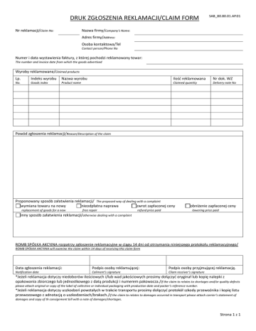 DRUK ZGŁOSZENIA REKLAMACJI/CLAIM FORM Nr reklamacji/Claim No: SAB_80.80.01.AP.01 Nazwa firmy/Company’s Name: Adres firmy/Address: Osoba kontaktowa/Tel Contact person/Phone No Numer i data wystawienia faktury, z której pochodzi reklamowany towar: The number and invoice date from which the goods advertised Wyroby reklamowane/Claimed products Lp. Indeks wyrobu Nazwa wyrobu Ilość reklamowana Nr dok. WZ No. Goods index Product name Claimed quantity Delivery note No Powód zgłoszenia reklamacji/Reason/Description of the claim Proponowany sposób załatwienia reklamacji/ The proposed way of dealing with a complaint wymiana towaru na nowy nieodpłatna naprawa zwrot zapłaconej ceny replacement of goods for a new free repair refund price paid obniżenie zapłaconej ceny lowering price paid inny sposób załatwienia reklamacji/otherwise dealing with a complaint ROMB SPÓŁKA AKCYJNA rozpatrzy zgłoszenie reklamacyjne w ciągu 14 dni od otrzymania niniejszego protokołu reklamacyjnego/ ROMB SPÓŁKA AKCYJNA will examine the claim within 14 days of receiving this claim form Data zgłoszenia reklamacji: Podpis osoby reklamującej: Podpis osoby przyjmującej reklamację. Notification date Caliment’s signature Cliam receiver’s signature *Jeżeli reklamacja dotyczy niedoborów ilościowych i/lub wad jakościowych prosimy dołączyć oryginał lub kopię nalepki z opakowania zbiorczego lub jednostkowego z datą produkcji i numerem pakowacza./If the claim to relates to shortages and/or quality defects please attach original or copy of the label of collective or individual packaging with production date and packer’s reference number. *Jeżeli reklamacja dotyczy uszkodzeń powstałych w trakcie transportu prosimy dołączyć protokół szkody przewoźnika i kopię listu przewozowego z adnotacją o uszkodzeniach/brakach./If the claim to relates to damages occurred in transport please attach carrier’s statement of damages and copy of th consignment bill with a note of damages/shortages. Strona 1 z 1