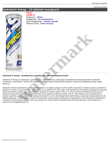 Informacje o produkcie Utworzono 06-03-2017 Hydratonic Energy - 10 tabletek musujących Cena : 16,00 zł er m ar k Producent : Olimp Dostępność : Na zamówienie Stan magazynowy : bardzo wysoki Średnia ocena : brak recenzji Hydratonic® Energy - kompleksowe nawodnienie i źródło dodatkowej energii! at Hydratonic® Energy to rewelacyjny, zaawansowany napój izotoniczny, zawierający kompleksowe zestawienie witamin składników mineralnych, oraz kofeiny i tauryny, aby zapewnić pożądany stopień nawodnienia organizmu i dostarczyć dodatkowej energii osobie aktywnej. w Niezwykle istotnym parametrem, na który należy zwrócić szczególną uwagę w trakcie wysiłku fizycznego, to właśnie poziom nawodnienia organizmu. Ubytek z organizmu wody i elektrolitów już na poziomie 2% masy ciała, może powodować wcześniejsze wystąpienie zmęczenia. Około 5-procentowy ubytek wagi, potrafi obniżyć zdolność do wysiłku nawet o 30% (1, 2). W tym zakresie odwodnienia obserwuje się obniżenie maksymalnej zdolności pochłaniania tlenu przez organizm (VO2max) nawet o 5% (3). Aby zapobiec temu niekorzystnemu stanowi organizmu, koniecznym jest jak najszybciej przywrócić w nim równowagę wodno-elektrolitową, przyjmując napoje izotoniczne (4). Badania pokazują, iż przyjmowanie w trakcie intensywnego wysiłku płynów zawierających węglowodany może skutkować przedłużeniem możliwości kontynuowania wysiłku o 30%, przy spożyciu co najmniej 400 ml takiego napoju lub takiej jego ilości, która dostarcza co najmniej 120 g węglowodanów (5). Wygenerowano w programie www.oscGold.com er m ar k Wykres 1. Zależność pomiędzy niskim poziomem nawodnienia organizmu a pogorszeniem objętości treningowej i mocy tlenowej. Zaadoptowano z Hydration effects on thermoregulation and performance in the heat. Michael N. Sawka, , Scott J. Montain, William A. Latzka. Comparative Biochemistry and Physiology Part A: Molecular & Integrative Physiology. Volume 128, Issue 4, April 2001, Pages 679–690 Największe postępy treningowe wynikają głównie z systematyczności szkolenia oraz stworzenia warunków żywieniowych (stosowanie zaawansowanej suplementacji) pozwalających zapewnić odpowiedni poziom nawodnienia organizmu. ZAAWANSOWANA FORMUŁA IZOTONICZNO-ELEKTROLITOWA, KOMPLEKS WITAMIN ORAZ SKŁADNIKÓW MINERALNYCH, ENERGIA I WYTRZYMAŁOŚĆ! Produktem, który spełnia najbardziej krytyczne wymagania zarówno w kierunku efektywnej hydratacji organizmu w warunkach jego odwodnienia, z jednoczesnym wspierającym efektem zwiększającym wytrzymałość w trakcie wysiłku jest Hydratonic® Energy. Napój izotoniczny, ze względu na optymalną, zbliżoną do płynów ustrojowych koncentrację elektrolitów dużo szybciej i skuteczniej nawadnia organizm i gasi pragnienie, niż zwykła woda. Przyczynia się tym samym do utrzymania właściwej równowagi elektrolitycznej organizmu, która jest niezbędnym elementem właściwego jego funkcjonowania. at Całość formuły izotonicznej została wzbogacona dodatkowo tauryną. Jak pokazują badania (6) suplementacja tauryną znacząco wydłuża czas w trakcie biegu do wyczerpania nawet o 50 %, w porównaniu z grupą placebo. Inne badanie udowadnia synergizm i słuszność zastosowanego w Hydratonic® Energy. połączenia tauryny z kofeiną. Wiadomym jest bowiem, iż kofeina zwiększa wytrzymałość, niemniej jednak może przyczyniać się do gromadzenia się kwasu mlekowego w mięśniach. Tauryna natomiast obniża akumulację mleczanów podczas wysiłku i wpływa na poprawę wcześniej wspomnianej wytrzymałości. Wyniki z badań (7) suplementacji kofeiny i tauryny potwierdzają zasadność stosowania tych dwóch substancji aktywnych jednocześnie, co zostało zaimplementowane w Hydratonic® Energy. w Dopełnieniem rewelacyjnego składu Hydratonic® Energy jest perfekcyjnie dobrany kompleks 10 witamin i składników mineralnych, który zawiera pulę niezbędnych mikro- i makroskładników dla osób poddawanych intensywnym i częstym obciążeniom fizycznym. Wśród dodanych witamin mamy te z grupy B, które wplatając się w metabolizm węglowodanów przyczyniają się do redukcji zmęczenia, utrzymania normalnego metabolizmu energetycznego oraz funkcjonowania systemu nerwowego. Jednoczesne podanie w Hydratonic® Energy węglowodanów i witamin z grupy B jest kolejnym synergistycznym połączeniem, którego zasadność potwierdzają fakty naukowe. Dla spełnienia najwyższych wymagań ludzi aktywnych, oprócz genialnego składu, ten profesjonalny produkt, ma formę wygodnej i poręcznej tabletki musującej EFFER MAX™, którą możesz zabrać ze sobą i w każdej chwili rozpuścić w dowolnym miejscu w wodzie. Genialne smaki i jakość użytych składników jednocześnie nawadniają i orzeźwiają każdego, kto w podczas swojego wysiłku sięga po Hydratonic® Energy. Synergizm składników to jego największy atut. Zasadność wykorzystania każdej użytej do produkcji substancji aktywnej jest ugruntowana faktami naukowymi. Hydratonic® Energy polecany jest szczególnie sportowcom uprawiającym kolarstwo, biegi, pływanie, triathlon, sporty walki, tenis, squash, golf, gry zespołowe tj. piłka nożna, piłka ręczna, koszykówka, siatkówka, rugby, futbol amerykański, hokej, oraz trenującym w siłowniach, fitness klubach, bez względu na rodzaj treningu. Informacja o wartości odżywczej 1 tabletka: Wartość energetyczna 162 kJ/38 kcal Tłuszcz 0 g Informacje o produkcie er m ar k w tym kwasy tłuszczowe nasycone 0 g Węglowodany 7,1 g w tym cukry 6,7 g Białko 0 g Sól 0,6 g Wit. E 1,8 mg (15%*) PureWay-C® 8,9 g w tym: witamina C 8 mg (10%*) bioflawonoidy cytrusowe 0,2 mg Wit. B1 0,08 mg (7,5%*) 0,17 mg (15%*) Wit. B2 0,21 mg (15%*) Niacyna (mg NE) 2,4 mg (15%*) Wit. B6 0,1 mg (7,5%*) Kwas pantotenowy 0,45 mg (7,5%*) Potas 150 mg (7,5%*) Wapń 60 mg (7,5%*) Magnez 94,2 mg (25%*) Sód 0,24 g Tauryna 200 mg Kofeina 35 mg *%RDA - referencyjne wartości 