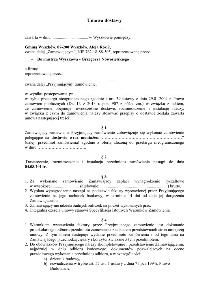 Umowa dostawy ………………………………. zawarta w dniu ………………….…………. w Wyszkowie pomiędzy: Gminą Wyszków, 07-200 Wyszków, Aleja Róż 2, zwaną dalej „Zamawiającym”, NIP 762-18-88-505, reprezentowaną przez: − Burmistrza Wyszkowa - Grzegorza Nowosielskiego a firmą: …………………………………………………………………...……… reprezentowaną przez: …………….………………………………………………………………………… zwaną dalej „Przyjmującym” zamówienie, w wyniku postępowania pn.: …………………………………………………………………….…………..……… w trybie przetargu nieograniczonego zgodnie z art. 39 ustawy z dnia 29.01.2004 r. Prawo zamówień publicznych (Dz. U. z 2013 r. poz. 907 z późn. zm.) w związku z faktem, że zamówienie obejmuje równocześnie dostawę, rozmieszczenie i instalację rzeczy, w związku z czym do zamówienia należy stosować przepisy o dostawie została zawarta umowa następującej treści: § 1. Zamawiający zamawia, a Przyjmujący zamówienie zobowiązuje się wykonać zamówienie polegające na dostawie wraz montażem …………………………………………………” (dalej: przedmiot zamówienia) zgodnie z ofertą złożoną do przetargu nieograniczonego w dniu …………………………….. § 2. Dostarczenie, rozmieszczenie i instalacja przedmiotu zamówienia nastąpi do dnia 04.08.2014r. § 3. 1. Za wykonane zamówienie Zamawiający zapłaci wynagrodzenie ryczałtowe w wysokości …………….……… zł (słownie: ……………………………………………….………) brutto. 2. Wypłata wynagrodzenia nastąpi na podstawie faktury wystawionej przez Przyjmującego zamówienie na jego rachunek bankowy, w terminie 14 dni od dnia jej doręczenia Zamawiającemu. 3. Zamawiający nie udziela żadnych zaliczek na poczet wykonanych prac. 4. Integralną częścią umowy stanowi Specyfikacja Istotnych Warunków Zamówienia. § 4. 1. Warunkiem wystawienia faktury przez Przyjmującego zamówienie jest dokonanie protokolarnego odbioru przedmiotu zamówienia z udziałem przedstawicieli stron niniejszej umowy. Z tym dniem następuje wydanie przedmiotu zamówienia i od tego dnia na Zamawiającego przechodzą ciężary i korzyści związane z tym przedmiotem. 2. Do obowiązków Przyjmującego należy skompletowanie i przedstawienie Zamawiającemu, najpóźniej w dniu odbioru końcowego, dokumentów pozwalających na ocenę prawidłowego wykonania przedmiotu odbioru, a w szczególności: a) dziennik budowy, b) oświadczenia w trybie art. 57 ust. 1 ustawy z dnia 7 lipca 1994r. Prawo Budowlane, c) kartę gwarancyjną, d) oświadczenie o zgodności dostarczonych i zamontowanych trybun zaoferowanych w przetargu nieograniczonym z dnia …………….…………….. e) certyfikat zgodności zamontowanych trybun o spełnianiu wymagań bezpieczeństwa zawartych w PN-EN 13200-1; 2005, PN-EN 13200-3;2006, f) geodezyjną inwentaryzację powykonawczą. § 5. 1. W przypadku niedotrzymania terminu dostarczenia, rozmieszczenia i instalacji przedmiotu umowy stosownie do §2, Przyjmujący zamówienie zobowiązany będzie do zapłaty na rzecz Zamawiającego kary umownej w wysokości 1% wartości wynagrodzenia, o którym mowa w § 3 ust.1 za każdy dzień opóźnienia. 2. W przypadku niewykonania lub nienależytego wykonania przedmiotu umowy w inny sposób, niż polegający na niedotrzymaniu terminu dostarczenia, rozmieszczenia i instalacji przedmiotu, Przyjmujący zamówienie zobowiązany będzie do zapłaty na rzecz Zamawiającego kary umownej w wysokości 10% wynagrodzenia, o którym mowa w § 3 ust. 1. 3. Zamawiający może dochodzić odszkodowania przewyższającego wysokość kar umownych. 4. Kary umowne za poszczególne naruszenia umowy podlegają kumulacji i trwają pomimo odstąpienia od umowy przez którąkolwiek ze stron. § 6. 1. Wykonawca wniósł zabezpieczenie należytego wykonania umowy w wysokości 10% zaoferowanej ceny brutto za przedmiot umowy, tj. ……………….zł. 2. Wykonawca zabezpieczenie wykonania umowy wniósł w formie: ………………….. 3. 70% kwoty zabezpieczenia zostanie zwrócone Wykonawcy w ciągu 30 dni po dokonaniu protokolarnego odbioru przedmiotu zamówienia i przyjęcia go przez Zamawiającego jako należycie wykonanego. Pozostałe 30% zabezpieczenia zostanie zwrócone po upływie gwarancji jakości. § 7. 1. Na wykonane zamówienie oraz wykorzystane materiały Przyjmujący zamówienie udziela Zamawiającemu pięcioletniej gwarancji i rękojmi. 2. Przyjmujący zamówienie nie ponosi odpowiedzialności za szkody wynikłe wskutek wandalizmu, kradzieży, nieprawidłowego użytkowania oraz naturalnego zużycia materiału. 3. Bieg uprawnień z tytułu rękojmi i gwarancji rozpoczyna się w dniu zakończenia przez Zamawiającego czynności odbioru. 4. O stwierdzonych wadach w przypadku korzystania z uprawnień z tytułu rękojmi, Zamawiający ma obowiązek zawiadomienia Przyjmującego zamówienie najpóźniej w terminie dwóch miesięcy od daty wykrycia wady. § 8. 1. Przelew wierzytelności przysługującej Wykonawcy w stosunku do Zamawiającego wymaga zgody Zamawiającego wyrażonej w formie pisemnej pod rygorem nieważności. 2. Zamawiający nie odpowiada w stosunku do Wykonawcy za zadośćuczynienie przekazowi także w przypadku, gdy Zamawiający jest dłużnikiem Wykonawcy w stosunku do przekazanego świadczenia. § 9. Odpowiedzialność za roszczenie osób trzecich wynikające z nienależytego wykonania umowy ponosi Przyjmujący zamówienie. § 10. W sprawach nie unormowanych niniejszą umową mają zastosowanie przepisy kodeksu cywilnego. § 11. Spory pomiędzy stronami rozstrzygał będzie Sąd miejscowo właściwy dla Zamawiającego. § 12. Umowa została sporządzona w trzech jednobrzmiących egzemplarzach, z których jeden otrzymuje Przyjmujący zamówienie