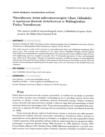 SYLWAN 153 (5): 346-353, 2009 PIOTR SKUISALA, MAGDALENA MASLAK Niewidoczny gwiat mikrostawonogOw (Atari, allembola) w martwym drewnie gwierkowym w BabiogOrskim Parku Narodowym The unseen world of microarthropods (Atari, (lollembola) of spruce dead wood in the Babia GOra National Park ABSTRACT Skubala P., Ma§lak M. 2009. Niewidoczny gwiat mikrostawonogOw (Atari, Collembok) w martwym drewnie s'wierkowym w BabiogOrskim Parku Narodowym. Sylwan 153 (5): 346-353. The article presents results of the research on microarthropods (Atari and Co Ilembok) inhabiting fallen spruce trees. The research was conducted in the spruce forest Plagiothecio-Piceekm tatricum typicum in the 13abia GOra National Park, Carpathian Mountains. Five downed spruce logs in different stage of decay and neighbouring soil were sampled seasonally. Over 91 thousands specimens of mites and springtails were collected in 140 samples. Changes in population densities of different groups of microarthropods with the age of the dead wood was analysed and compared with densities in forest litter and soil. The total number of microarthopods inhabiting downed spruce logs on the area of hectare in the studied forest was estimated. KEY WORDS Atari, Collembok, downed logs, dead wood, spruce ADD-REM Piotr Skubala e-mail: [email protected] Magdalena Ma§lak [email protected] Katedra Ekologii; Uniwersytet ul. Bankowa 9; 40-007 Katowice WStVp Smierc drzewa jest procesem tak czcstym w przyrodzie, ze wydawae by sic moglo, ze powinien on bye dobrze poznany przez biologow. Zadziwiajqeyin jest to, jak (Hugo martwe drewno bylo uznawane za zbcdny, a nawet niechciany element ek.osystemu le§nego. Dopier° niedawno zaezcto doceniae role martwych drzew, jednak w dalszym act] doge pozostawianego w lasach martwego drewna jest zatrwaZajqco niska. W przecictnym gospodarczym europejskim lesie pozostawia sic co najwyZej 5% ilogci martwego drewna spotykanej w lasach naturalnych [Gutowski i in. 2004]. Fauna martwego drewna, mimo ze bardzo liczna i istotna w zyciu lasu, jest slabo poznana. Dotychezasowe badania dotyczyly przewaznie entomofauny. Stosunkowo dobrze poznane sq saproksyliczne owady, glOwnie chrzqszcze Coleoptera, ze wzgledu na ich role w gospodarce leftiej i stopieri zagrolenia wielu gatunkow. Jedynie nieliczne opracowania dotyczq zgrupowan mikrostawonogOw w martwym drewnie Wager 1968; Seastedt i in. 1989; Johnston, Crossley 1993; Paviour-Smith, Elbourn 1993; Skubala, Duras 2008]. Mikrostawonogi glebowe to przede wszystkim rortocze Atari (reprezentanci rzedow: Oribatida, Gamasida, Actinedida i Ataridida) i skoczoPDF compression, OCR, web optimization using a watermarked evaluation copy of CVISION PDFCompressor Niewidoczny gwiat mikrostawonogow (Acari, Co llembota) 347 gonki llembo/a. Zwierzcta to odgrywaja szczegOlnie watnq role w procesach dekompozycji obiegu materii, przyczyniajac sic micdzy innymi do pobudzenia wzrostu mikroorganizrnOw glebowych, przemieszczania skladnikOw gleby i udzialu w eyklach biogeochemicznych [Coleman,. Crossley 1996]. Ce lem badari bylo poznanie procesu zasiedlania lekicych klOd gwierka w kolejnych etapach rozkladu przez glOwne grapy mikrostawonogOw oraz okreglenie udzialu poszczegolnych grup rortoczy i skoczogonkow w zasiedlaniu martwych kl6d. Bogactwo gatunkowe w poszezeg6lnych klodach i otaczajacej *hie okreglono dla rortoczy z rzcdu Onibatida. Ponadto oszacowano jaka czck ogolu fanny mikrostawonogow w borze gwierkowym zasiedla martwe drewno. Teren bad all Badania przeprowadzono na terenie Babiogaskiego Parka Narodowego (BPN). Teren badari znajdowal sic w reglu gOrnym, w acydofilnej zachodniokarpackiej gwierczynie ganoreglowej Plagiothecio-Piceetum tahicum typicum [Holeksa 1998]. Wyznaczony obszar o powierzchni 100x100 znajdowal sic niedaleko Markowych Szczawin, w oddziale 23, na wysokogei okolo 1180 m n.p.m., na pOlnoenyin stoku o niewielkim nachyleniu (10'). Metoclyka Na powierzchni obserwacyjnej wybrano po jednej klodzie gwierka Picea abies z kaMego stopnia rozkladu. Mialy one zblihme rozmiary (dlugog6 -.12 in, grednica m)- i podobna ekspozycjc (pOtnocno-wschodnia). Zastosowano 5-stopniowq skate rozkladu klOd [Maser i in. 1988]. Pr6by obejmujace fragmenty kory, bielu i lyka zostaly pobrane w picciu losowo wybranych miejscach. Mialy one zblizony ciOar ((rednio 260 g gwieej masy) i objetW. Proby pobierano w czterech sezonach od sierpnia 2004 do czerwca 2005. KaMorazowo z klody zebrano po pic6 prat) drew- na. W najbliszym otoczeniu Hod pobierano po 10 pr6b glebowych. 'eh grednia sucha masa wynosila okolo 90 g. Mikrostawonogi wyplaszano w aparacie 'ililigrena przez 5 dni. Przyjmujac okreglonq gcstog6 oraz miV,szoV, martwego drewna w poszezegolnych klasach rozkladu, grednie zagcszczenie badanych grup zwierzat w 100 gramach suchej masy oraz przyj- mujac wyznaczone pole powierzchni. Toby glebowej i grednia liczbe osobnikow dla takiej prOby, okreglono potencjalnq liezbc mikrostawonogow na hektar. Gcstog6 martwego drewna gwierkowego w kaZdej z Has rozkladu okreglono na podstawie pomiar6w wlasnych. MigtszW martwego drewna gwierkowego w badanym oddziale legnym (84 m3/ha) przyjeto za Holeksa [1998]. rednie zagcszczenie poszezegOlnych grup mikrostawonog6w porownano za pomoca jednoczynnikowej an.alizy wariancji (ANOVA). Wyniki W martwych klodach gwierkow i glebie w BPN zebrano ogolem 64 237 przedstawicieli rortoczy 27 378 skoczogonk6w. Zagcszczenie mikrostawonogOw w tnartwym drewnie (podawa.ne jako liczba osobnikow w 100 gramach suchej masy) bylo bardzo zr&nicowane w poszezegolnych klodach. Istnialy statystycznie istotne r&niee w liezbie rortoczy i skoczogonk.Ow w klodach o ranym stopniu rozkladu (rye. 1). NajwV,sze zagcszezenie mikrostawonogow odnotowano w klodzie w II klasie rozkladu (ponad 5500 os./100 g s.m.). Za.gcszezenie rortoczy w klodach o 111 i IV stopniu rozkladu bylo zblione i przekraczalo 2500 os./100 g sAn. Zagcsztzenit rortoczy bylo wyrainie niisze w klodzie w ostatniej klasie rozkladu i najnitsze w klodzie I klasi