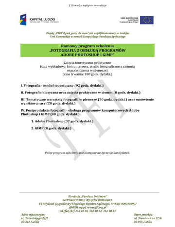 Człowiek – najlepsza inwestycja Projekt „PWP Rynek pracy dla mam” jest współfinansowany ze środków Unii Europejskiej w ramach Europejskiego Funduszu Społecznego Ramowy program szkolenia „FOTOGRAFIA Z OBSŁUGĄ PROGRAMÓW ADOBE PHOTOSHOP I GIMP” Zajęcia teoretyczno-praktyczne (sala wykładowa, komputerowa, studio fotograficzne z ciemnią oraz ćwiczenia w plenerze) (czas trwania: 180 godz. dydakt.) I. Fotografia - moduł teoretyczny (92 godz. dydakt.) II. Fotografia klasyczna oraz zajęcia praktyczne w ciemni (8 godz. dydakt.) III. Tematyczne warsztaty fotografii w plenerze (20 godz. dydakt.) oraz omówienie wyników pracy (20 godz. dydakt.) IV. Postprodukcja fotografii - obsługa programów komputerowych Adobe Photoshop i GIMP (40 godz. dydakt.): 1. Adobe Photoshop (32 godz. dydakt.) 2. GIMP (8 godz. dydakt.) Pełny program szkolenia jest dostępny na życzenie kandydatek. Fundacja „Fundusz Inicjatyw” NIP 9462553005, REGON 060368615, VI Wydział Gospodarczy Krajowego Rejestru Sądowego, nr KRS 0000306907 [email protected], www.ffi.org.pl tel./fax (81) 532 10 30, 532 10 32, 532 10 33 Adres rejestracyjny: Biuro projektu: ul. Sierpińskiego 24/5 ul. Narutowicza 57/6 20-448 Lublin 20-016 Lublin