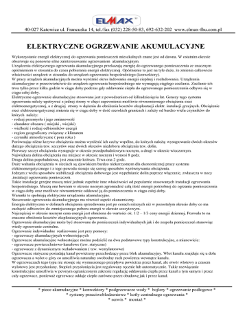 40-027 Katowice ul. Francuska 14, tel./fax (032) 228-50-83, 692-632-202 www.elmax-fhu.com.pl ELEKTRYCZNE OGRZEWANIE AKUMULACYJNE Wykorzystanie energii elektrycznej do ogrzewania pomieszczeń mieszkalnych znane jest od dawna. W ostatnim okresie obserwuje się ponowne silne zainteresowanie ogrzewaniem akumulacyjnym. Urządzenia elektrycznego ogrzewania akumulacyjnego przekazują energię do ogrzewanego pomieszczenia ze znacznym opóźnieniem w stosunku do czasu pobierania energii elektrycznej. Opóźnienie to jest na tyle duże, że zmienia całkowicie właściwości urządzeń w stosunku do urządzeń ogrzewania bezpośredniego (konwektory). W pracy urządzeń akumulacyjnych można wyróżnić okres ładowania energii cieplnej i rozładowania. Urządzenia akumulacyjne w przeciwieństwie do urządzeń ogrzewania bezpośredniego nie wymagają ciągłego zasilania. Zasilanie ich trwa tylko przez kilka godzin w ciągu doby podczas gdy oddawanie ciepła do ogrzewanego pomieszczenia odbywa się w ciągu całej doby. Elektryczne ogrzewanie akumulacyjne stosowane jest z powodzeniem od kilkudziesięciu lat. Genezy tego systemu ogrzewania należy upatrywać z jednej strony w chęci zapewnienia możliwie równomiernego obciążenia sieci elektroenergetycznej, a z drugiej strony w dążeniu do obniżenia kosztów eksploatacji elektr. instalacji grzejnych. Obciążenie sieci elektroenergetycznej zmienia się w ciągu doby w dość szerokich granicach i zależy od bardzo wielu czynników do których należy: - rodzaj przemysłu i jego zmianowość - charakter obszaru ( miejski , wiejski) - wielkość i rodzaj odbiorników energii - region geograficzny związany z klimatem - czynniki atmosferyczne ( pora roku ) Porównując różne krzywe obciążenia można wyróżnić ich cechy wspólne, do których należą: występowanie dwóch okresów dużego obciążenia tzw. szczytów oraz dwóch okresów niedoboru obciążenia tzw. dolin. Pierwszy szczyt obciążenia występuje w okresie przedpołudniowym nocnym, a drugi w okresie wieczornym. Największa dolina obciążenia ma miejsce w okresie nocnym i wynosi 8 godz. Druga dolina popołudniowa, jest znacznie krótsza. Trwa ona 2 godz. Duże wahania obciążenia w sieciach są zjawiskiem bardzo niekorzystnym dla ekonomicznej pracy systemu elektroenergetycznego i z tego powodu stosuje się szereg sposobów wyrównywania obciążenia. Jednym z wielu sposobów stabilizacji obciążenia dobowego jest wypełnianie dolin poprzez włączanie, zwłaszcza w nocy ,instalacji ogrzewania pomieszczeń. Takie instalacje grzejne muszą mieć jednak zupełnie inne właściwości od popularnie stosowanych instalacji ogrzewania bezpośredniego. Muszą one bowiem w okresie nocnym zgromadzić całą ilość energii potrzebnej do ogrzania pomieszczenia w ciągu doby oraz możliwie równomiernie oddawać ją do pomieszczenia w ciągu całej doby. Warunki te spełniają elektryczne urządzenia akumulacyjne. Stosowanie ogrzewania akumulacyjnego ma również aspekt ekonomiczny. Energia elektryczna w dolinach obciążenia sprzedawana jest po cenach niższych niż w pozostałym okresie doby co ma zachęcić odbiorców do zmniejszonego poboru energii w okresie szczytowym. Najczęściej w okresie nocnym cena energii jest obniżona do wartości ok. 1/2 – 1/3 ceny energii dziennej. Pozwala to na znaczne obniżenie kosztów eksploatacyjnych ogrzewania. Ogrzewanie akumulacyjne może być stosowane do pomieszczeń indywidualnych jak i do zespołu pomieszczeń stanowiąc wtedy ogrzewanie centralne. Ogrzewanie indywidualne realizowane jest przy pomocy: - ogrzewaczy akumulacyjnych wolnostojących Ogrzewacze akumulacyjne wolnostojące można podzielić na dwa podstawowe typy konstrukcyjne, a mianowicie: - ogrzewacze powierzchniowo-kanałowe (tzw. statyczne) - ogrzewacze z dynamicznym rozładowaniem ( tzw. wentylatorowe) Ogrzewacze statyczne posiadają kanał powietrzny przechodzący przez blok akumulacyjny. Wlot kanału znajduje się u dołu ogrzewacza a wylot o góry co umożliwia naturalny swobodny ruch powietrza wewnątrz kanału. W ogrzewaczach tego typu nie stosuje się wymuszonego przepływu powietrza przez kanał, ale otwór wlotowy a czasem wylotowy jest przysłaniany. Stopień przysłonięcia jest regulowany ręcznie lub automatycznie. Takie rozwiązanie konstrukcyjne umożliwia w pewnym ograniczonym zakresie regulację oddawania ciepła przez kanał a tym samym i przez cały ogrzewacz, ponieważ ogrzewacz oddaje ciepło zarówno przez obudowę jak i przez kanał. ___________________________________________________________________________ * piece akumulacyjne * konwektory * podgrzewacze wody * bojlery * ogrzewanie podłogowe * * systemy przeciwoblodzeniowe * kotły centralnego ogrzewania * * serwis * montaż * 40-027 Katowice ul. Francuska 14, tel./fax (032) 228-50-83, 692-632-202 www.elmax-fhu.com.pl Ogrzewacze akumulacyjne z dynamicznym rozładowaniem podobnie jak statyczne posiadają kanał powietrzny jednak tak skonstruowany , że niemożliwy jest w nim swobodny przepływ powietrza. Przepływ powietrza przez kanał wymuszany jest zamontowanym w ogrzewaczu wentylatorem elektrycznym . Ogrzewacze te posiadają izolację cieplną znacznie lepszą od statycznych co powoduje, że ciepło do pomieszczenia oddawane jest głównie przez wydmuchiwane z kanału powietrze. Sterując przy pomocy regulatora temperatury ogrzewanego pomieszczenia pracą wentylatora można precyzyjnie dopasować wydajność ogrzewacza do aktualnych strat cieplnych pomieszczenia. Dobra izolacja cieplna umożliwia przetrzymywanie zgromadzonego w ogrzewaczu ciepła przy wyłączonym wentylatorze przez znaczne okresy czasu. ( do kilkunastu godzin). Wentylator ogrzewacza ma zwykle regulowany wydatek. Przy normalnej pracy wykorzystywany jest mniejszy wydatek wentylatora. W sytuacji kiedy istnieje konieczność szybkiego nagrzania pomieszczenia wykorzystywany jest maksymalny wydatek wentylatora. Pozwala to na bardzo szybkie