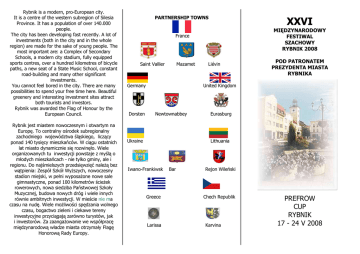 Rybnik is a modern, pro-European city. It is a centre of the western subregion of Silesia Province. It has a population of over 140.000 people. The city has been developing fast recently. A lot of investments (both in the city and in the whole region) are made for the sake of young people. The most important are: a Complex of Secondary Schools, a modern city stadium, fully equipped sports centres, over a hundred kilometres of bicycle paths, a new seat of a State Music School, constant road-building and many other significant investments. You cannot feel bored in the city. There are many possibilities to spend your free time here. Beautiful greenery and interesting investment sites attract both tourists and investors. Rybnik was awarded the Flag of Honour by the European Council. Rybnik jest miastem nowoczesnym i otwartym na Europę. To centralny ośrodek subregionalny zachodniego województwa śląskiego, liczący ponad 140 tysięcy mieszkańców. W ciągu ostatnich lat miasto dynamicznie się rozwinęło. Wiele organizowanych tu inwestycji powstaje z myślą o młodych mieszkańcach - nie tylko gminy, ale i regionu. Do najśmielszych przedsięwzięć naleŜą bez wątpienia: Zespół Szkół WyŜszych, nowoczesny stadion miejski, w pełni wyposaŜone nowe sale gimnastyczne, ponad 100 kilometrów ścieŜek rowerowych, nowa siedziba Państwowej Szkoły Muzycznej, budowa nowych dróg i wiele innych równie ambitnych inwestycji. W mieście nie ma czasu na nudę. Wiele moŜliwości spędzania wolnego czasu, bogactwo zieleni i ciekawe tereny inwestycyjne przyciągają zarówno turystów, jak i inwestorów. Za zaangaŜowanie we współpracę międzynarodową władze miasta otrzymały Flagę Honorową Rady Europy. PARTNERSHIP TOWNS XXVI MIĘDZYNARODOWY FESTIWAL SZACHOWY RYBNIK 2008 France Saint Vallier Mazamet Germany Dorsten Liévin POD PATRONATEM PREZYDENTA MIASTA RYBNIKA United Kingdom Newtownabbey Ukraine Eurasburg Lithuania Iwano-Frankiwsk Greece Larissa Bar Rejon Wileński Chech Republik Karvina PREFROW CUP RYBNIK 17 - 24 V 2008 UWAGA! W odpowiedzi na prośby uczestników turniej dzieci zostanie przeprowadzony w ciągu jednego dnia! 26th INTERNATIONAL CHESS TOURNAMENT RYBNIK 2008 TURNIEJ DLA DZIECI W ramach XXVI Międzynarodowego Festiwalu Szachowego Rybnik 2008 rozegrany zostanie Międzynarodowy Szachowy Puchar Polski P’15 do lat 7, 8 i 9. ORGANIZERS The tournament is under auspices of the City Mayor Adam Fudali Polish Chess Federation Silesian Chess Federation in Katowice Urząd Marszałkowski Katowice The City Council of Rybnik Miejski Klub Szachowy w Rybniku Termin zawodów – sobota 17 maja 2008 roku. Miejsce zawodów – SP nr2 w Rybniku ul. Wodzisławska 46. System rozgrywek - szwajcarski na dystansie 9 rund z tempem gry 15 min na zawodnika. Rozegrane zostaną dwa turnieje dla chłopców i dziewcząt z wydzieloną klasyfikacją do lat 9, 8 i 7. W zawodach mogą startować dzieci urodzone w 1999 roku i młodsze. Zgłoszenia - Warunkiem uczestnictwa jest zgłoszenie udziału do dnia 15.05.08 na stronie internetowej: www.cheesarbiter.com i wpłata wpisowego w kwocie 20 zł na konto nr 33 1060 0076 0000 4012 8000 38 62 lub gotówką przed rozpoczęciem turnieju. Weryfikacja uczestników turnieju na Sali gry w dniu rozpoczęcia zawodów 17.05.2008 o godzinie 9.00. NAGRODY - W kaŜdej z grup wiekowych do lat 7, 8 i 9 po trzy puchary dla chłopców i dziewcząt - Nagrody rzeczowe dla najlepszych i upominki dla wszystkich uczestników JUNIOR TOURNAMENT – POLSH CUP UNDER 7, 8 AND 9 The juniors tournament will be held from 17th to 18th of May in Rybnik et the Primary School number 2, Wodzisławska 46 St. The tournament will be played in 2 separated groups of boys and girl. Rate of play: 15 min per each player. Entry fee: 20 PLN. PRIZES - - 3 trophies for boys and girls in each of the groups under 7, 8 and 9 Prizes for the best player and small gifts for every player ___________________________________________________________________________- Patronat nad festiwalem: Prezydent Miasta Rybnika Adam Fudali ORGANIZATOR Polski Związek Szachowy w Warszawie Śląski Związek Szachowy w Katowicach Urząd Marszałkowski Województwa Śląskiego Urząd Miasta Rybnika Miejski Klub Szachowy w Rybniku ___________________________________________________________________________- TURNIEJE ZAMKNIĘTE I SYSTEM ROZGRYWEK W ramach Festiwalu w Rybnickim Centrum Kultury, ul. Saint Vallier 1 od 20 – 24.05.2008 r. rozegrane zostaną równieŜ: - Turniej Główny z normą IM i WGM - Turniej Seniorów powyŜej 60 lat - Turniej Talentów Szachowych Wszystkie trzy turnieje z udziałem 10 zawodników systemem kołowym z tempem gry 40 posunięć na 1,5 godz. + 30 min. na dokończenie partii. 1. 2. 3. 4. 5. runda runda runda runda runda 20.05.08 20.05.08 21.05.08 21.05.08 22.05.08 TERMINARZ ROZGRYWEK godz. 930 6. runda 22.05.08 godz. 1530 7. runda 23.05.08 godz. 900 8. runda 23.05.08 godz. 1500 9. runda 24.05.08 godz. 900 godz. godz. godz. godz. 1500 900 1500 900 ___________________________________________________________________________- Organizator nie zabezpiecza noclegów. MoŜna dokonać rezerwacji w miejscach noclegowych w rybnickich hotelach we własnym zakresie. Dodatkowe informacje Piotr Bobrowski, tel. +48 601 873 637 The second part of tournament will be held from 20th to 24th of May 2008 in Rybnik at the Center of Culture, 1 Saint Vallier St. TOURNAMENT RULES The tournament will consist of 3 closed tournaments: The Main group with the IM and WGM norm The Senior group above 60 years old The Young Talents group Rate for play: 90 minutes for the 40 moves + 30 minutes for the rest of the game.