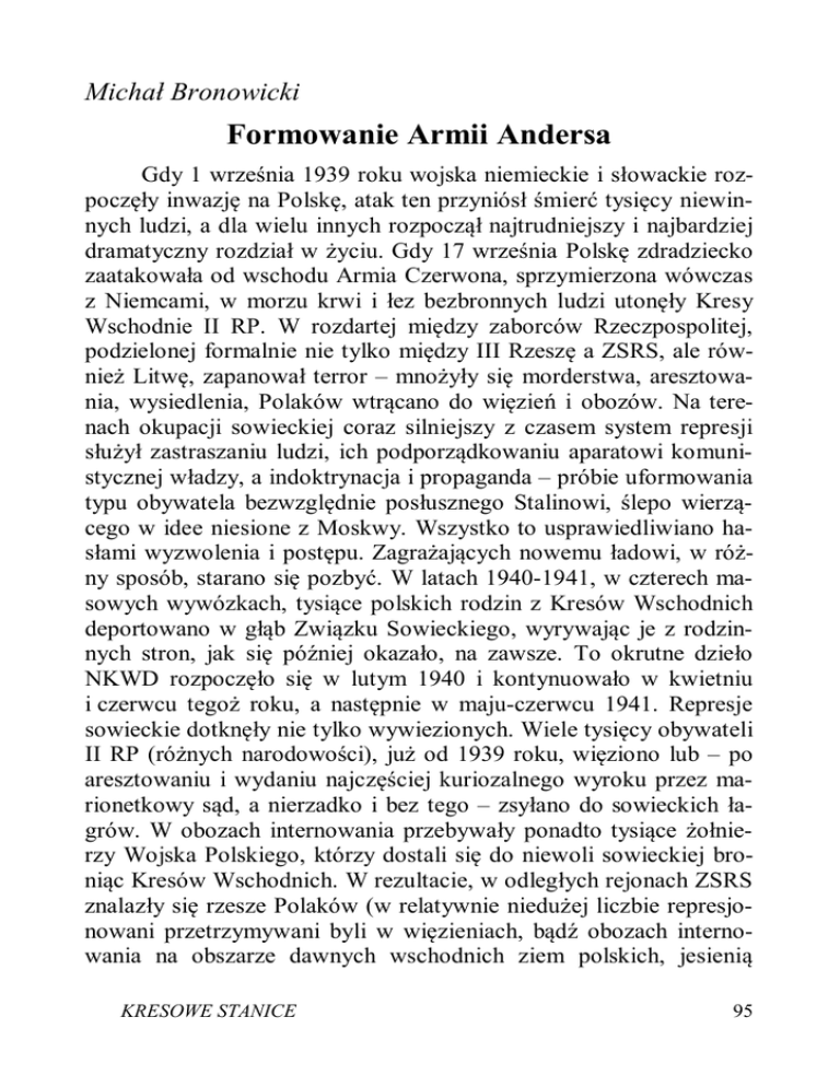 Michał Bronowicki Formowanie Armii Andersa Gdy 1 września 1939 roku wojska niemieckie i słowackie rozpoczęły inwazję na Polskę, atak ten przyniósł śmierć tysięcy niewinnych ludzi, a dla wielu innych rozpoczął najtrudniejszy i najbardziej dramatyczny rozdział w życiu. Gdy 17 września Polskę zdradziecko zaatakowała od wschodu Armia Czerwona, sprzymierzona wówczas z Niemcami, w morzu krwi i łez bezbronnych ludzi utonęły Kresy Wschodnie II RP. W rozdartej między zaborców Rzeczpospolitej, podzielonej formalnie nie tylko między III Rzeszę a ZSRS, ale również Litwę, zapanował terror – mnożyły się morderstwa, aresztowania, wysiedlenia, Polaków wtrącano do więzień i obozów. Na terenach okupacji sowieckiej coraz silniejszy z czasem system represji służył zastraszaniu ludzi, ich podporządkowaniu aparatowi komunistycznej władzy, a indoktrynacja i propaganda – próbie uformowania typu obywatela bezwzględnie posłusznego Stalinowi, ślepo wierzącego w idee niesione z Moskwy. Wszystko to usprawiedliwiano hasłami wyzwolenia i postępu. Zagrażających nowemu ładowi, w różny sposób, starano się pozbyć. W latach 1940-1941, w czterech masowych wywózkach, tysiące polskich rodzin z Kresów Wschodnich deportowano w głąb Związku Sowieckiego, wyrywając je z rodzinnych stron, jak się później okazało, na zawsze. To okrutne dzieło NKWD rozpoczęło się w lutym 1940 i kontynuowało w kwietniu i czerwcu tegoż roku, a następnie w maju-czerwcu 1941. Represje sowieckie dotknęły nie tylko wywiezionych. Wiele tysięcy obywateli II RP (różnych narodowości), już od 1939 roku, więziono lub – po aresztowaniu i wydaniu najczęściej kuriozalnego wyroku przez marionetkowy sąd, a nierzadko i bez tego – zsyłano do sowieckich łagrów. W obozach internowania przebywały ponadto tysiące żołnierzy Wojska Polskiego, którzy dostali się do niewoli sowieckiej broniąc Kresów Wschodnich. W rezultacie, w odległych rejonach ZSRS znalazły się rzesze Polaków (w relatywnie niedużej liczbie represjonowani przetrzymywani byli w więzieniach, bądź obozach internowania na obszarze dawnych wschodnich ziem polskich, jesienią KRESOWE STANICE 95 Podpisanie układu Sikorski – Majski (obok parafujących układ polskosowiecki tj. premiera rządu RP i ambasadora ZSRS w Anglii, widoczny m.in. premier Wielkiej Brytanii Winston Churchil – siedzi z cygarem w centrum), Londyn, 30 lipca 1941; źródło: Fundacja Kresy-Syberia 1939 r. formalnie inkorporowanych do Związku Sowieckiego; niektórzy więźniowie, głównie zaś łagiernicy i przymusowi przesiedleńcy trafiali w przedwojenne granice ZSRS, przede wszystkim na Syberię i do Kazachstanu). Gehenna obejmowała całe pokolenia – od najstarszych po dzieci. Udręczeni makabrycznymi nierzadko warunkami życia w realiach stalinowskiego reżimu, wyczerpani, chorzy, głodni, zmuszeni do niewolniczej pracy próbowali przetrwać i ocalić swoje człowieczeństwo. Dla większości, aczkolwiek nie dla wszystkich, rzeczywistą zmianę sytuacji przyniósł atak niemiecki na ZSRS w czerwcu 1941 roku oraz jego polityczne konsekwencje. Wśród nich było bowiem odnowienie stosunków dyplomatycznych – zerwanych w 1939 roku – pomiędzy rządem polskim a sowieckim, czego emanacją stało się zawarcie w Londynie układu sygnowanego przez premiera Władysława Sikorskiego i ambasadora ZSRS w Wielkiej Brytanii – Iwana 96 KRESOWE STANICE Polacy zwolnieni z zesłania, więzień i łagrów po przybyciu do ośrodków formowania Armii Andersa – w oczekiwaniu na rekrutację, ZSRS, 1941 rok; źródło: Muzeum Wojska Polskiego Majskiego. Podpisany 30 lipca 1941 roku dokument przewidywał tzw. amnestię dla obywateli polskich przetrzymywanych w Związku Sowieckim i utworzenie tam polskiej armii. W sierpniu 1941 doszło do realizacji tych umów (dekret o „amnestii” wydano 12 sierpnia, zaś dwa dni potem podpisano polsko-sowiecką umowę wojskową dotyczącą formowania Armii Polskiej w ZSRS). Na czele wojska stanął, przetrzymywany wcześniej w więzieniu na moskiewskiej Łubiance, generał Władysław Anders. Jego żołnierze również rekrutowali się spośród dotąd zniewolonych – byłych jeńców, więźniów, łagierników, przymusowych przesiedleńców. Przy polskiej armii znalazło schronienie tysiące rodzin wcielonych doń mężczyzn – cywilów, którzy pragnęli wydostać się ze Związku Sowieckiego. Był to też cel generała Andersa, który po różnych perturbacjach uzyskał na to zgodę Stalina i wyprowadził w 1942 roku swoich żołnierzy z ZSRS, a wraz z nimi około 38 tysięcy cywilów (w odniesieniu do ogromnej większości ewakuacja odbyła się przez Morze Kaspijskie, jedynie blisko 3 tysiące osób, w tym ponad 700 spośród ogólnej liczby około 78 tysięcy żołnierzy, wydostało się z ZSRS drogą lądową). Armia Andersa i uchodźcy cywilni trafili do Iranu. W 70. rocznicę rozpoczęcia formowania polskiego wojska w ZSRS prezentujemy wybór fotografii, które ukazują związane z tym wydarzenia. KRESOWE STANICE 97 Ochotnicy polscy do Armii Andersa, ZSRS, 1941 rok; źródło: Fundacja Kresy-Syberia Generał Władysław Sikorski podczas inspekcji Armii Andersa w Buzułuku, ZSRS, 1941 rok; źródło: Fundacja Kresy-Syberia 98 KRESOWE STANICE Kompania honorowa polskiego wojska w Związku Sowieckim; źródło: Fundacja Kresy-Syberia Generał Anders podczas oglądania ćwiczeń wojskowych, Dżalalabad, ZSRS; źródło: Instytut Polski i Muzeum im. gen. Sikorskiego KRESOWE STANICE 99 Generał Władysław Anders podczas przemówienia do ochotniczek Pomocniczej Służby Kobiet przed budynkiem sztabowym polskiej armii (z prawej stoi gen. Zygmunt Szyszko-Bohusz), Jangi-Jul, ZSRS, 22 marca 1942; źródło: Instytut Polski i Muzeum im. gen. Sikorskiego Brama wejściowa do obozu polskiej armii w jednym z ośrodków formowania wojska pod dowództwem generała Władysława Andersa, ZSRS, źródło: Fund