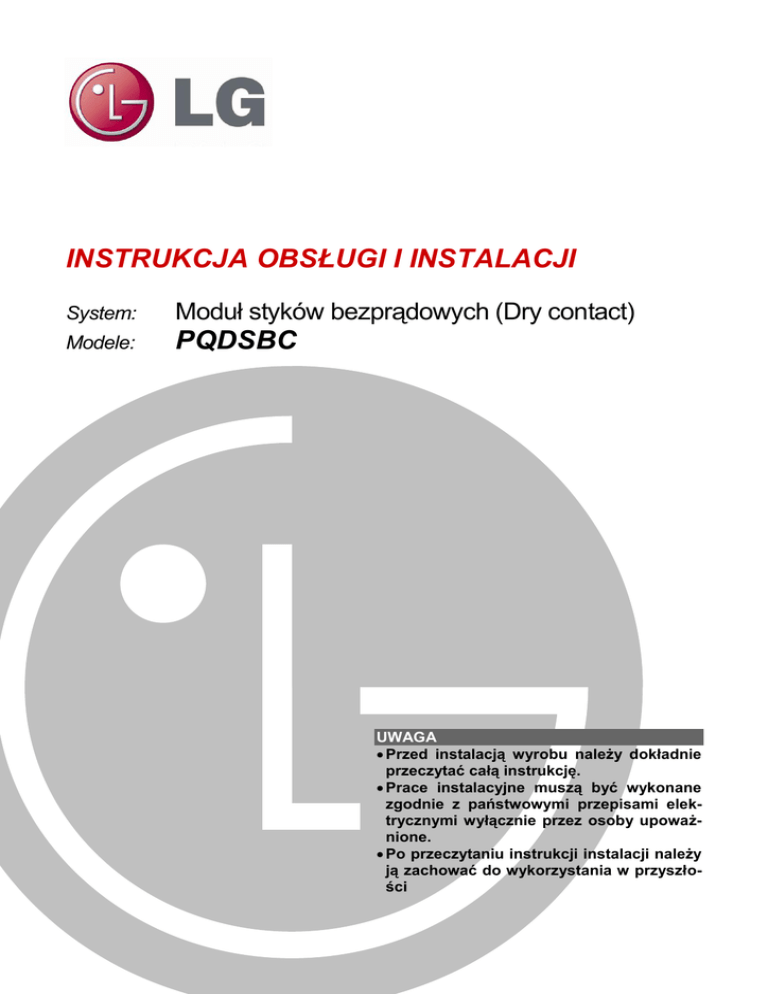 INSTRUKCJA OBSŁUGI I INSTALACJI System: Moduł styków bezprądowych (Dry contact) Modele: PQDSBC UWAGA Przed instalacją wyrobu należy dokładnie przeczytać całą instrukcję. Prace instalacyjne muszą być wykonane zgodnie z państwowymi przepisami elektrycznymi wyłącznie przez osoby upoważnione. Po przeczytaniu instrukcji instalacji należy ją zachować do wykorzystania w przyszłości Instrukcja obsługi i instalacji modułu styków bezprądowych SPIS TREŚCI Ostrzeżenia dotyczące bezpieczeństwa ..................................... 3 Opis części wyrobu ...................................................................... 5 Sposób instalacji .......................................................................... 6 Instalacja wewnątrz jednostki wewnętrznej ........................................... 6 Instalacja na zewnątrz jednostki wewnętrznej ....................................... 7 Sposób ustawiania i użytkowania ............................................... 8 1. Podłączenie zasilania i jednostki wewnętrznej .................................. 8 2. Ustawianie wejścia sygnałowego styków .......................................... 9 3. Ustawianie żądanej temperatury ..................................................... 10 4. Ustawianie trybu sterowania ........................................................... 11 5. Monitorowanie jednostki wewnętrznej ............................................. 15 2 Moduł styków bezprądowych (dry contact) Ostrzeżenia dotyczące bezpieczeństwa Ostrzeżenia dotyczące bezpieczeństwa Aby zapobiec zranieniu użytkownika lub innych osób oraz uszkodzeniu urządzenia, muszą być przestrzegane poniższe wskazówki. Nieprawidłowe postępowanie związane z ignorowaniem instrukcji może spowodować urazy lub uszkodzenia, których waga jest sklasyfikowana przez następujące ostrzeżenia dotyczące bezpieczeństwa. OSTRZEŻNIE Oznaczenie to wskazuje na możliwość spowodowania śmierci lub poważnego okaleczenia. UWAGA Oznaczenie to wskazuje na możliwość spowodowania zranienia lub zniszczenia przedmiotów. Znaczenia symboli używanych w instrukcji przedstawione są poniżej. Tego nie wolno robić To trzeba koniecznie wykonać OSTRZEŻENIE Instalacja Nie dotykać rękoma płytki PCB, gdy podłączone jest zasilanie. Może to być przyczyną pożaru, porażenia prądem elektrycznym, eksplozji, zranienia lub problemów z wyrobem. W sprawie instalacji zawsze należy kontaktować się z punktem serwisowym lub firmą instalatorską. Może to być przyczyną pożaru, porażenia prądem elektrycznym, eksplozji lub zranienia. Nie instalować w miejscach, gdzie wyrób może być wystawiony na deszcz. Może to być przyczyną problemów z wyrobem. Przy zmianie miejsca instalacji wyrobu należy kontaktować się z punktem serwisowym lub firmą instalatorską. Może to być przyczyną pożaru, porażenia prądem elektrycznym, eksplozji lub zranienia. Nie instalować wyrobu w miejscach o dużej wilgotności. Może to być przyczyną problemów z wyrobem. Instrukcja obsługi i instalacji 3 Ostrzeżenia dotyczące bezpieczeństwa Użytkowanie Nie modyfikować ani przedłużać przewodu zasilającego. Może to być przyczyną pożaru lub porażenia prądem elektrycznym. W pobliżu wyrobu nie używać żadnych urządzeń z palącym się ogniem. Może to być przyczyną pożaru. W pobliżu przewodu zasilającego nie używać żadnych urządzeń grzejnych. Może to być przyczyną pożaru lub porażenia prądem elektrycznym. Nie wlewać wody do wnętrza wyrobu. Jeśli wyrób zostanie zanurzony w wodzie zawsze należy skontaktować się z punktem serwisowym. Może to być przyczyną pożaru lub porażenia prądem elektrycznym. Nie pozwalać dzieciom i osobom starszym na użytkowanie wyrobu bez nadzoru. Może to być przyczyną wypadku lub problemów z wyrobem. Może to być przyczyną porażenia prądem elektrycznym lub problemów z wyrobem. Nie uderzać wyrobu. Może to być przyczyną problemów z wyrobem. 4 Moduł styków bezprądowych (dry contact) Opis części wyrobu Opis części wyrobu (przód obudowy) (tył obudowy) (góra) (wewnętrzna płytka PCB) (bok) (bok) SYGNAŁY KOMUNIKACYJNE MODUŁU DRY CONTACT 1. CN_INDOOR : Podłączenie przewodów komunikacyjnych pomiędzy jednostką wewnętrzną i modułem Dry contact oraz zasilania modułu Dry contact 2. CN_PI485 : Złącze interfejsu PI485 3. CHANGE_OVER_SW : Przełącznik wyboru napięcia styków przekaźnika (5V-12V) 4. CN_CONTROL : Sygnał wejściowy styków przekaźnika 5. CONTROL_MODE_SW :Przełącznik wyboru trybu sterowania 6. SETTING_SW : Przełącznik ustawienia, czy stosowana ma być funkcja modułu Dry contact 7. TEMP_SETTING : Przełącznik ustawienia żądanej temp. jednostki wewnętrznej 8. CN_OUT (O1, O2) : Styki przekaźnika sygnalizujące działanie jednostki wewnętrznej 9. CN_OUT (E3, E4) : Styki przekaźnika sygnalizujące błąd jednostki wewnętrznej 10. DISPLAY_LED : Wskaźnik LED do sygnalizacji stanu modułu Dry contact 11. RESET_SW : Przełącznik resetowania Instrukcja obsługi i instalacji 5 Sposób instalacji Sposób instalacji Instalacja wewnątrz jednostki wewnętrznej 1) Odkręcić 4 wkręty mocujące płytkę PCB. Rozdzielić PCB i obudowę. 2) Podłączyć przewody elektryczne zgodnie z instrukcją. (Patrz Sposób ustawiania i użytkowania). 3) Ustawić przełączniki z godnie z wybraną metodą. (Patrz Sposób ustawiania i użytkowania). 4) Przymocować płytkę PCB wewnątrz jednostki wewnętrznej w miejscu, gdzie jest wystarczająca przestrzeń. UWAGA 1. Urządzenie zainstalować na płaskiej powierzchni. Przykręcić wkrętami co najmniej w 2 punktach. W przeciwnym razie sterownik może być przymocowany nieprawidłowo. 2. Nie dokręcać zbyt mocno wkrętów. Może to spowodować odkształcenie się obudowy. 3. Nie wolno dowolnie wyginać obudowy. Może to spowodować nieprawidłowe działanie centralnego sterownika. 6 Moduł styków bezp