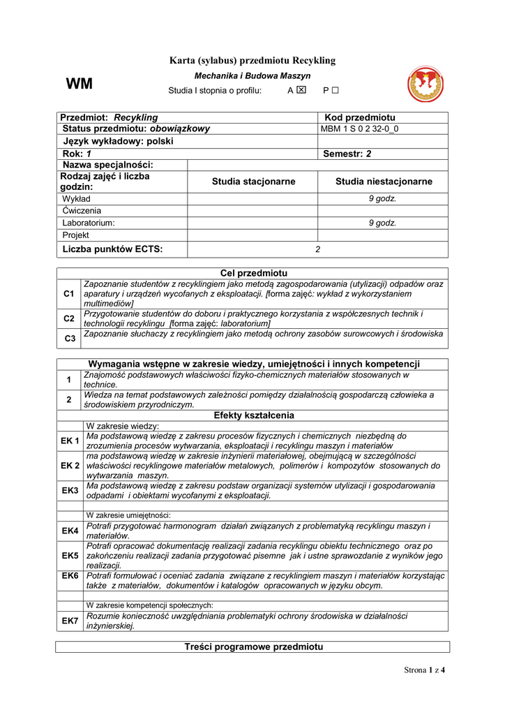 Karta (sylabus) przedmiotu Recykling A