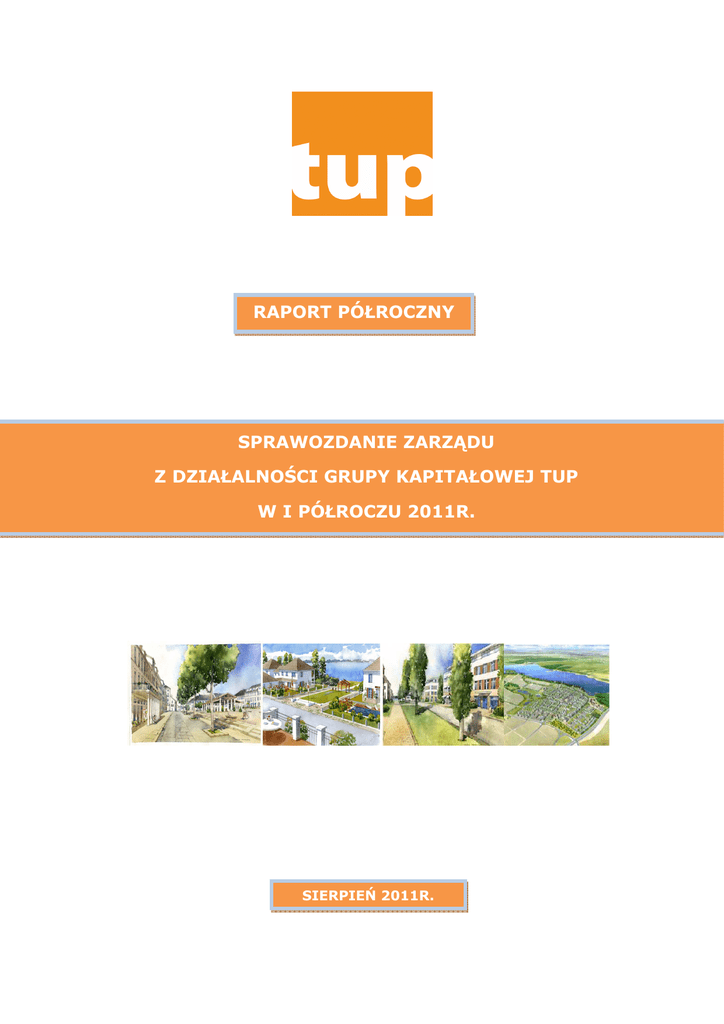 RAPORT PÓŁROCZNY SPRAWOZDANIE ZARZĄDU Z DZIAŁALNOŚCI GRUPY KAPITAŁOWEJ TUP W I PÓŁROCZU 2011R. SIERPIEŃ 2011R. Sprawozdanie Zarządu Grupy Kapitałowej TUP z działalności w I półroczu 2011r. Spis treści I INFORMACJE O GRUPIE KAPITAŁOWEJ ........................................................................................ 2 1. Organizacja Grupy Kapitałowej ....................................................................................................... 2 2. Kapitał i struktura właścicielska ...................................................................................................... 5 II DZIAŁALNOŚĆ W I PÓŁROCZU 2011R .......................................................................................... 6 1. Informacje istotne dla oceny działalności oraz czynniki mające wpływ na działalność .................. 6 2. Ryzyka i zagrożenia oraz zarządzanie ryzykiem finansowym ........................................................ 18 3 . Sezonowość i cykliczność działalności ......................................................................................... 23 III POZOSTAŁE INFORMACJE .................................................................................................... 24 1. Prognozy wyniku finansowego ...................................................................................................... 24 2. Informacje dotyczące emisji, wykupu i spłaty dłużnych i kapitałowych pap. wartościowych ...... 24 3. Informacje o dywidendzie ............................................................................................................. 24 4. Transakcje z podmiotami powiązanymi ........................................................................................ 24 5. Postępowania sądowe................................................................................................................... 25 6. Poręczenia i gwarancje .................................................................................................................. 26 IV OŚWIADCZENIA ZARZĄDU ...................................................................................................... 27 str. 1 Sprawozdanie Zarządu Grupy Kapitałowej TUP z działalności w I półroczu 2011r. I INFORMACJE O GRUPIE KAPITAŁOWEJ 1. Organizacja Grupy Kapitałowej Opis organizacji Grupy Kapitałowej ze wskazaniem jednostek podlegających konsolidacji (informacje o powiązaniach organizacyjnych lub kapitałowych emitenta) Struktura organizacyjna oraz zmiany w strukturze organizacyjnej wraz z podaniem ich przyczyn Na koniec I półrocza 2011 roku struktura organizacyjna Grupy Kapitałowej wchodziło 7 jednostek bezpośrednio zależnych i 2 jednostki pośrednio zależne od TUP (konsolidowane metodą pełną), i 2 jednostki stowarzyszone (konsolidowane metodą praw własności). TUP S.A. Spółka Giełdowa Prezes: Robert Jacek Moritz Kapitał: 15 212 345 zł Chmielowskie Sp. z o.o. 100% udziału, kapitał: 57 110 000 zł Siedziba: Warszawa TUP Property S.A. 100% akcji, kapitał: 26 145 333 zł Siedziba: Poznań Forest Hill Sp. z o.o. 100% udziałów, kapitał 10 475 000 zł Siedziba: Warszawa Centrum Handlowe Bażanty Sp. z o.o. 100% udziałów, kapitał 1 800 000 zł Siedziba: Poznań Euroconstruction Sp. z o.o. 100% udziału, kapitał: 2 000 000 zł Siedziba: Poznań Roda Sp. z o.o. w likwidacji 100% udziału, kapitał: 1 068 000 zł Siedziba: Środa Wielkopolska Port Jachtowy Nieporęt Sp. z o.o. 100% udziału, kapitał: 1 000 000 zł Siedziba: Warszawa X-press Couriers Sp. z o.o. 72,07 udzialu, kapitał: 5 853 100zł Siedziba: Warszawa Kino-Centrum Fordon Sp. z o.o. 50% udziału, kapitał 350 000 zł Siedziba: Bydgoszcz str. 2 Sprawozdanie Zarządu Grupy Kapitałowej TUP z działalności w I półroczu 2011r. Duncon Bikes Sp. z o.o. 46,53% udziału w głosach na WZ Podmioty stowarzyszone Powszechna Agencja Informacyjna S.A. (PAGI) 15,35% udziału w głosach na WZ Zmiany jakie zaszły w strukturze organizacyjnej Grupy Kapitałowej w okresie I półrocza 2011r. dotyczyły sprzedaży Spółek Małe Chmielowskie (obecnie Forest Hill Sp. z o.o.), oraz TG Investments (obecnie Centrum Handlowe Bażanty Sp. z o.o.) spółce TUP Property S.A. a także podniesienia kapitału zakładowego tych Spółek. W dniu 8 kwietnia 2011r. 100% udziałów Małe Chmielowskie Sp. z o.o. (zależna od Chmielowskie Sp. z o.o.) w liczbie 100 o wartości nominalnej 50 zł każdy, zostały sprzedane Spółce TUP Property S.A. za cenę 7 000 zł, natomiast 100% udziałów TG Investments Sp. z o.o.(zależna od TUP S.A.) , w liczbie 100 o wartości nominalnej 500 zł każdy, zostały sprzedane TUP Property S.A. za cenę 37 000 zł. TUP Property S.A. stał się jedynym udziałowcem w/w Spółek, które działają odpowiednio pod firmą: Forest Hill Sp. z o.o. oraz Centrum Handlowe Bażanty Sp. z o.o. Decyzją uchwał Walnego Zgromadzenia Centrum Handlowe Bażanty Sp. z o.o. i Forest Hill Sp. z o.o z dnia 8 kwietnia 2011r., nastąpiło podwyższenie kapitału zakładowego tych Spółek. TUP Property S.A. objęła nowo utworzone udziały w spółkach celowych w zamian za aport w postaci nieruchomości położonych w Katowicach przy ul. Bażantów w następujący sposób: - aport o łącznej wartości 25 872 205 zł w postaci niezabudowanych nieruchomości w Katowicach przy ul. Bażantów o powierzchni 50 544 m kw. w zamian za udziały spółki Małe Chmielowskie Sp. z o.o. (obecnie Forest Hill Sp. z o.o.), - aport w wysokości 4 231 026 zł wraz z poniesionymi nakładami w postaci niezabudowanych nieruchomości w Katowicach przy ul. Bażantów o powierzchni 11 357 m kw. w zamian za udziały TG Investments Sp. z o.o. (obecnie Centrum handlowe Bażanty Sp. z o.o.) str. 3 Sprawozdanie Zarządu Grupy Kapitałowej TUP z działalności w I półroczu 2011r. Zaangażowanie kapitałowe TUP S.A. wg stanu na 30.06.2011 r. Wartość akcji/udziałów wg cen nabycia w zł Warto