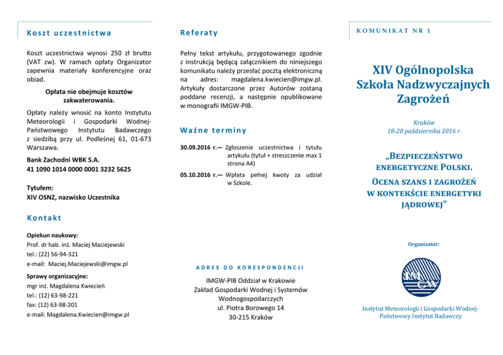 Koszt uczestnictwa Referat y Koszt uczestnictwa wynosi 250 zł bru,o (VAT zw). W ramach opłaty Organizator zapewnia materiały konferencyjne oraz obiad. Pełny tekst artykułu, przygotowanego zgodnie z instrukcją będącą załącznikiem do niniejszego komunikatu należy przesłać pocztą elektroniczną na adres: [email protected]. Artykuły dostarczone przez Autorów zostaną poddane recenzji, a następnie opublikowane w monografii IMGW-PIB. Opłata nie obejmuje kosztów zakwaterowania. Opłaty należy wnosić na konto Instytutu Meteorologii i Gospodarki WodnejPaństwowego Instytutu Badawczego z siedzibą przy ul. Podleśnej 61, 01-673 Warszawa. Bank Zachodni WBK S.A. 41 1090 1014 0000 0001 3232 5625 Tytułem: XIV OSNZ, nazwisko Uczestnika Wa ż n e t e r m i n y 30.09.2016 r.— Zgłoszenie uczestnictwa i tytułu artykułu (tytuł + streszczenie max 1 strona A4) 05.10.2016 r.— Wpłata pełnej kwoty za udział w Szkole. KOMUNIKAT NR 1 XIVOgólnopolska SzkołaNadzwyczajnych Zagrożeń Kraków 18-20 października 2016 r. „B !"# $! %&'() * +, '-$!* P)/&0#. O$ *2&!2*&#!2,+)3 % (0)*' 04$# * +, '-0# 567+)( 5” Kontakt Opiekun naukowy: Prof. dr hab. inż. Maciej Maciejewski tel.: (22) 56-94-321 e-mail: [email protected] Sprawy organizacyjne: mgr inż. Magdalena Kwiecień tel.: (12) 63-98-221 fax: (12) 63-98-201 e-mail: [email protected] Organizator: ADRES DO KORESPONDENCJI IMGW-PIB Oddział w Krakowie Zakład Gospodarki Wodnej i Systemów Wodnogospodarczych ul. Piotra Borowego 14 30-215 Kraków Instytut Meteorologii i Gospodarki WodnejPań stwowy Instytut Badawczy Te m a t y k a S z k o ł y Szkołę organizujemy w celu popularyzacji oraz wymiany wiedzy w zakresie nadzwyczajnych zagrożeń, w tym naturalnych i antropogenicznych. Tegoroczna Szkoła kontynuuje problematykę podjętą w roku 2014 r. dotyczącą szerokorozumianego bezpieczeństwa. Tematem przewodnim obecnej Szkoły jest bezpieczeństwo energetyczne Polski. Będzie to Szkoła uczących się i nauczających — doskonaląc się wzajemnie. Jedną z podstawowych funkcji państwa jest zapewnienie bezpieczeństwa i porządku obywatelom. Wszelkie działania związane z zapewnieniem bezpieczeństwa powinny mieć charakter systemowy. Proponowana tematyka: • Rola energetyki jądrowej w europejskiej polityce energetycznej. • Bezpieczeństwo jądrowe. Niepewność, a postrzeganie katastrofy. • Modelowanie i analiza ryzyka. • Energetyka jądrowa w kontekście polityki klimatycznej. Ramowy program • • • Energetyka środowiska. jądrowa, Działania edukacyjne z energetyką jądrową. Meteorologiczne i uwarunkowania przy elektrowni jądrowych: a ochrona 18.10 związane hydrologiczne lokalizowaniu − ekstremalne zdarzenia meteorologiczne i hydrologiczne, − kaskadowość zdarzeń meteorologicznych i hydrologicznych, − dostępność zasobów wodnych. • Metody i działania mające na celu przygotowanie się na sytuacje kryzysowe. • Analiza zagrożeń oraz związanych z nimi niepożądanych zdarzeń, w kontekście budowy elektrowni jądrowych. • Osłona meteorologiczna i hydrologiczna społeczeństwa oraz gospodarki. • Systemy monitoringu promieniowania jonizującego i pól elektromagnetycznych. • Sposoby ograniczania rozprzestrzeniania się skażeń i zanieczyszczeń w wodach, powietrzu, glebie i na powierzchni ziemi. 19.10 20.10 9:00-11:30 Rejestracja 11:30-13:00 Otwarcie XIV OSNZ oraz sesja referatowa 13:00-14:30 Obiad 14:30-16:00 Sesja referatowa 16:00-16:30 Przerwa kawowa 16:30-18:00 Sesja referatowa 9:30-11:00 Sesja referatowa 11:00-11:30 Przerwa kawowa 11:30-13:00 Sesja referatowa 13:00-14:30 Obiad 14:30-16:30 Sesja referatowa 9:00-10:30 Panel dyskusyjny 10:30-11:00 Podsumowanie XIV OSNZ Miejsce IMGW-PIB Oddział w Krakowie ul. Piotra Borowego 14 Sala seminaryjna im. prof. Henryka Słoty (nr 206), Budynek B, piętro I