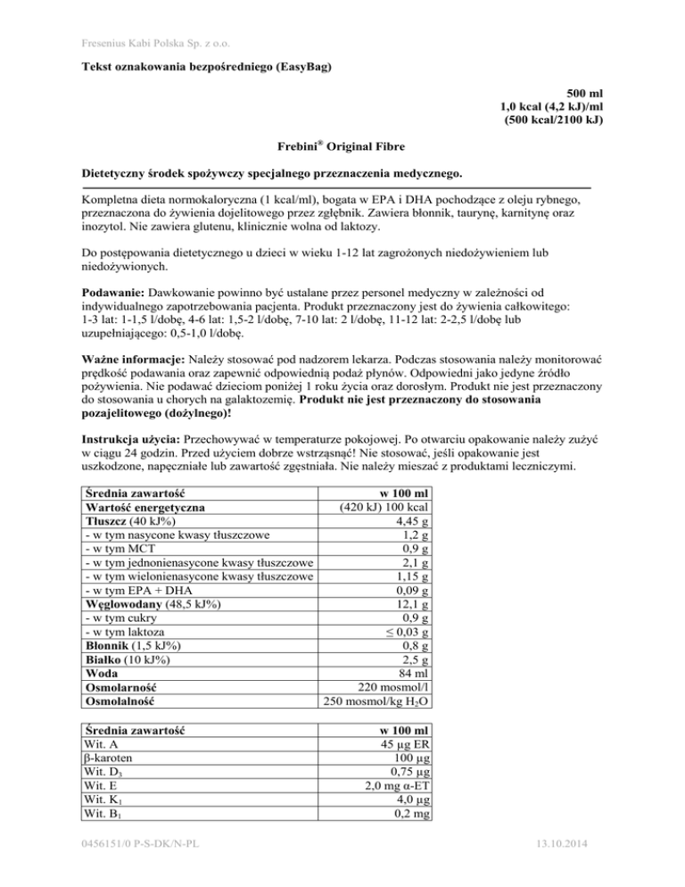 Fresenius Kabi Polska Sp. z o.o. Tekst oznakowania bezpośredniego (EasyBag) 500 ml 1,0 kcal (4,2 kJ)/ml (500 kcal/2100 kJ) Frebini® Original Fibre Dietetyczny środek spożywczy specjalnego przeznaczenia medycznego. Kompletna dieta normokaloryczna (1 kcal/ml), bogata w EPA i DHA pochodzące z oleju rybnego, przeznaczona do żywienia dojelitowego przez zgłębnik. Zawiera błonnik, taurynę, karnitynę oraz inozytol. Nie zawiera glutenu, klinicznie wolna od laktozy. Do postępowania dietetycznego u dzieci w wieku 1-12 lat zagrożonych niedożywieniem lub niedożywionych. Podawanie: Dawkowanie powinno być ustalane przez personel medyczny w zależności od indywidualnego zapotrzebowania pacjenta. Produkt przeznaczony jest do żywienia całkowitego: 1-3 lat: 1-1,5 l/dobę, 4-6 lat: 1,5-2 l/dobę, 7-10 lat: 2 l/dobę, 11-12 lat: 2-2,5 l/dobę lub uzupełniającego: 0,5-1,0 l/dobę. Ważne informacje: Należy stosować pod nadzorem lekarza. Podczas stosowania należy monitorować prędkość podawania oraz zapewnić odpowiednią podaż płynów. Odpowiedni jako jedyne źródło pożywienia. Nie podawać dzieciom poniżej 1 roku życia oraz dorosłym. Produkt nie jest przeznaczony do stosowania u chorych na galaktozemię. Produkt nie jest przeznaczony do stosowania pozajelitowego (dożylnego)! Instrukcja użycia: Przechowywać w temperaturze pokojowej. Po otwarciu opakowanie należy zużyć w ciągu 24 godzin. Przed użyciem dobrze wstrząsnąć! Nie stosować, jeśli opakowanie jest uszkodzone, napęczniałe lub zawartość zgęstniała. Nie należy mieszać z produktami leczniczymi. Średnia zawartość w 100 ml (420 kJ) 100 kcal Wartość energetyczna Tłuszcz (40 kJ%) 4,45 g - w tym nasycone kwasy tłuszczowe 1,2 g - w tym MCT 0,9 g - w tym jednonienasycone kwasy tłuszczowe 2,1 g - w tym wielonienasycone kwasy tłuszczowe 1,15 g - w tym EPA + DHA 0,09 g Węglowodany (48,5 kJ%) 12,1 g - w tym cukry 0,9 g - w tym laktoza ≤ 0,03 g Błonnik (1,5 kJ%) 0,8 g Białko (10 kJ%) 2,5 g 84 ml Woda 220 mosmol/l Osmolarność 250 mosmol/kg H2O Osmolalność Średnia zawartość Wit. A β-karoten Wit. D3 Wit. E Wit. K1 Wit. B1 0456151/0 P-S-DK/N-PL w 100 ml 45 µg ER 100 µg 0,75 µg 2,0 mg α-ET 4,0 µg 0,2 mg 13.10.2014 Fresenius Kabi Polska Sp. z o.o. Wit. B2 Niacyna Wit. B6 Wit. B12 Kwas pantotenowy Biotyna Kwas foliowy Wit. C Cholina Mioinozytol Karnityna Tauryna 0,2 mg 1,2 mg EN 0,11 mg 0,2 µg 0,4 mg 5,0 µg 22 µg 8,0 mg 20 mg 15 mg 3,0 mg 8,0 mg Średnia zawartość Sód (Na) Potas (K) Chlorki (Cl) Wapń (Ca) Magnez (Mg) Fosfor (P) Żelazo (Fe) Cynk (Zn) Miedź (Cu) Mangan (Mn) Jod (I) Fluorki (F) Chrom (Cr) Molibden (Mo) Selen (Se) w 100 ml 54 mg 100 mg 82 mg 70 mg 12,5 mg 61 mg 1,0 mg 1,0 mg 100 μg 0,12 mg 10 μg 0,08 mg 4,0 μg 4,0 μg 3,0 μg Skład: woda, maltodekstryna, olej rzepakowy, białko mleka, trójglicerydy o średniej długości łańcucha (MCT), inulina (z cykorii), olej rybny, emulgatory (E 471, lecytyna sojowa), celuloza, cytrynian sodu, wodorofosforan dipotasu, chlorek potasu, stabilizator (E 466), chlorek sodu, dekstryna pszeniczna, wodorowinian choliny, wit. C, tlenek magnezu, mioinozytol, tauryna, siarczan żelaza, siarczan cynku, L-karnityna, niacyna, wit. E, kwas pantotenowy, wit. B1, chlorek manganu, wit. B2, siarczan miedzi, wit. B6, fluorek sodu, ß-karoten, wit. A, kwas foliowy, chlorek chromu, selenin sodu, molibdenian sodu, biotyna, jodek potasu, wit. K1, wit. D3, wit. B12. Najlepiej spożyć przed końcem: data i numer partii na opakowaniu. [logo Fresenius Kabi] [na opakowaniu umieszczona jest skala, kod EAN oraz numer partii produkcyjnej] EasyBag Producent: Fresenius Kabi Deutschland GmbH D-61346 Bad Homburg/Niemcy www.fresenius-kabi.com Dystrybutor: Fresenius Kabi Polska Sp. z o.o. ul. Hrubieszowska 2 01-209 Warszawa 0456151/0 0456151/0 P-S-DK/N-PL 13.10.2014