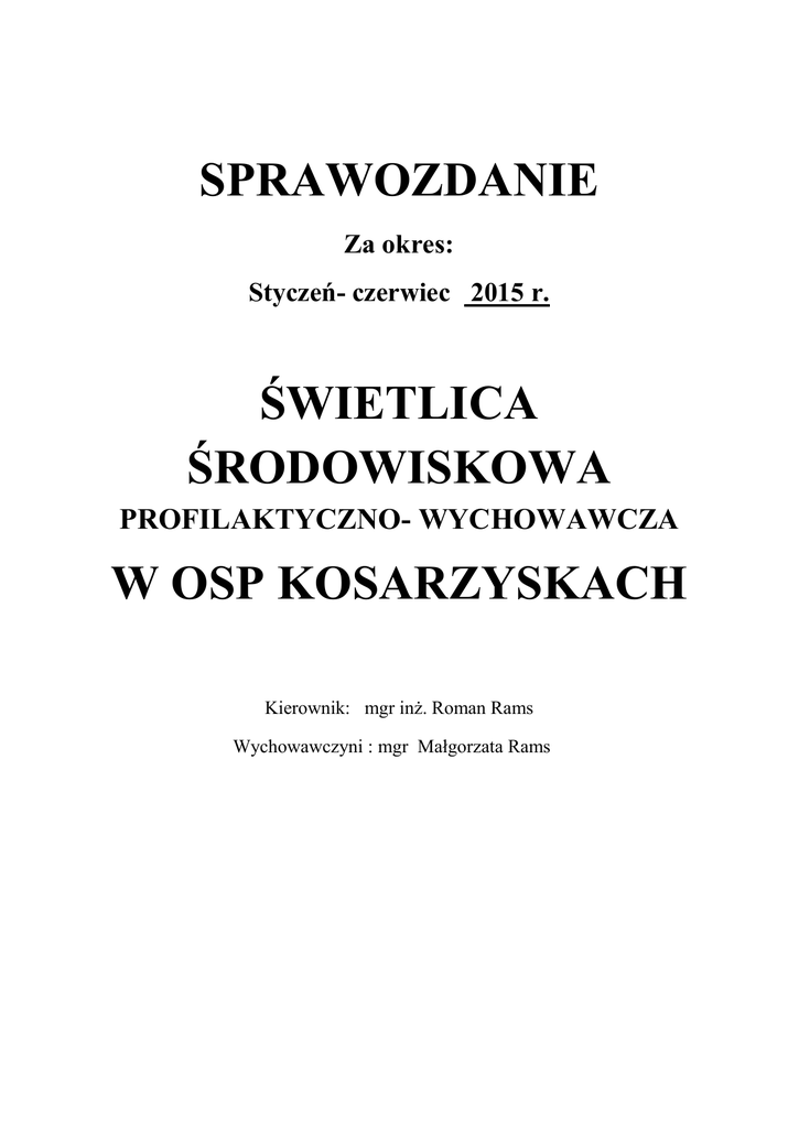 SPRAWOZDANIE Za okres: Styczeń- czerwiec 2015 r. ŚWIETLICA ŚRODOWISKOWA PROFILAKTYCZNO- WYCHOWAWCZA W OSP KOSARZYSKACH Kierownik: mgr inż. Roman Rams Wychowawczyni : mgr Małgorzata Rams Od stycznia do czerwca grupa młodzieży ze świetlicy środowiskowej z OSP Kosarzyska spotykała się regularnie, raz w tygodniu. Był to czas, w którym młodzież przede wszystkim bezpiecznie i owocnie spędzała wolne chwile. Nacisk został położony na sport, wyjścia w teren, filmowe wieczory, ale i rozmowy swobodne i tematyczne przy herbacie i kawie. To, co zostało zaplanowane, zrealizowaliśmy w pełni. Nasi wychowankowie byli nagradzani, ich sukcesy dostrzegane, promowane, zauważane poprzez dobre słowo, dobry gest wsparcia i aprobaty, dyplomy, jak również drobne upominki- zwłaszcza przybory szkolne, przydatne na co dzień. Nasi uczestnicy rozwijają się bardzo dobrze, na miarę swoich możliwości pod względem edukacyjnym i wychowawczym, a problemy, jakie się pojawiały były rozwiązywane na bieżąco. Wszyscy uczestnicy świetlicy na zakończenie spotkań przed wakacjami otrzymali dyplomy i drobne upominki, przydatne w szkole. Wśród licznych tematów profilaktycznych, rozmów, dyskusji , pojawiały się takie, jak: Na bazie profesjonalnie przygotowanych materiałów: - „Gdy hazard staje się problemem… Czy jestem uzależniony?” -„ Gdy seks staje się problemem... Czy jestem uzależniony?” - „Gdy praca staje się problemem… Czy jestem uzależniony?” -„ Gdy zakupy stają się problemem... Czy jestem uzależniony?” Wykonaliśmy wiele prac ręcznych, plastycznych, technicznych/ plakatów związanych z omawianymi zajęciami profilaktycznymi , wychowawczymi. Zwłaszcza dziewczynki angażowały się w przygotowania kartek i ozdób Wielkanocnych, zajęcia z bibułkarstwa, wykonywanie prac plastyczno- technicznych na dowolne tematy. Przygotowaliśmy wiele spotkań, zawodów, imprez, wyjazdów integracyjnych. Oto przykłady: -WYJAZD DO KINA HELIOS na film o niepełnosprawnym chłopcu i jego perypetiach: „Ze wszystkich sił”. - Wyjazd na lodowisko do Muszyny. - Wędrówki po okolicy. - Ferie zimowe na sportowo. - Międzynarodowy Dzień Dziecka – nasze małe święto dla dużych dzieci ze SŁODKIMI UPOMINKAMI. -OGNISKA integracyjne. -DYSKOTEKI. - ROZGRYWKI W SZACHY, WARCABY, PING- PONGA, BILARDA, HOKEJA. -PIKNIK z ogniskiem w terenie. -Turnieje sportowe, konkurencje sportowe na wesoło z dyplomami i nagrodami, według stworzonego programu i konsultacji z panią Jolą Jochymek, która przebieg sportowych zmagań umieściła w sprawozdaniu. -Udział w I Piwniczańskiej Grze Miejskiej „Polowanie na skarby Króla Kazimierza Wielkiego”- wystawienie drużyn do gry oraz pomoc wolontariuszy ze świetlicy. -Dwudniowa górska, piesza wycieczka na Przehybę oraz wspólna integracja 4 świetlic młodzieży: z OSP Kosarzyska, Łomnica ( 2 świetlice), Piwnicznej. Obejrzeliśmy liczne filmy przyniesione przez samych uczestników . Film, który spotkał się z największą aprobatą to: -„ Kopia Mistrza” o Ludwiku Beethowenie. Stworzyliśmy namiastkę wolontariatu dla chętnych uczniów. Została przeprowadzona prelekcja dla uczestników i rodziców na temat: „Szukaj porozumienia ze swoim dzieckiem”. Sprawozdanie sporządzili: Małgorzata i Roman Rams