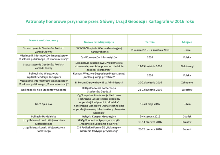Patronaty honorowe przyznane przez Główny Urząd Geodezji i Kartografii w 2016 roku Nazwa wnioskodawcy Stowarzyszenie Geodetów Polskich Zarząd Główny Miesięcznik informatyków i menedżerów IT sektora publicznego „IT w administracji” Stowarzyszenie Geodetów Polskich Zarząd Główny Politechnika Warszawska Wydział Geodezji i Kartografii Miesięcznik informatyków i menedżerów IT sektora publicznego „IT w administracji” Ogólnopolski Klub Studentów Geodezji GGPS Sp. z o.o. Politechnika Gdańska Urząd Marszałkowski Województwa Małopolskiego Urząd Marszałkowski Województwa Podlaskiego Nazwa przedsięwzięcia Termin Miejsce XXXVIII Olimpiada Wiedzy Geodezyjnej i Kartograficznej 31 marca 2016 – 2 kwietnia 2016 Opole Cykl Konwentów Informatyków 2016 Polska 13-15 kwietnia 2016 Białobrzegi 2016 Polska 20-22 kwietnia 2016 Zakopane 21-22 kwietnia 2016 Wrocław 19-20 maja 2016 Lublin 2-4 czerwca 2016 Gdańsk 13-14 czerwca 2016 Kraków 23-25 czerwca 2016 Supraśl Seminarium szkoleniowe „Problematyka stosowania przepisów prawa w dziedzinie geodezji i kartografii” Konkurs Wiedzy o Gospodarce Przestrzennej „Zaplanuj swoją przestrzeń” III Forum Kierowników IT w Administracji XI Ogólnopolska Konferencja Studentów Geodezji Ogólnopolska Konferencja NaukowoTechniczna „Współczesne problemy w geodezji i inżynierii środowiska” Konferencja Biznesowa „Nowe technologie w geodezji a rozwój infrastruktury obszarów wiejskich” Bałtycki Kongres Geodezyjny XII Ogólnopolskie Sympozjum z cyklu „Krakowskie Spotkania z INSPIRE” XIII Podlaskie Forum GIS „Rok mapy – zderzenie tradycji z przyszłością” Wojewódzki Ośrodek Dokumentacji Geodezyjnej i Kartograficznej w Katowicach Seminarium Jubileuszowe „Geodezja wczoraj, dzisiaj, jutro” 29 czerwca 2016 Katowice Trzecie Mistrzostwa Geodetów w Tenisie Stołowym Kazimiera Wielka 2016 24-25 września 2016 Kazimiera Wielka XXXIX Ogólnopolska Konferencja Kartograficzna 26-28 września 2016 Zwierzyniec Forum Teleinformatyki XXII Forum Teleinformatyki „Państwo a cyberprzestrzeń – od izolacji do współdziałania” 29-30 września 2016 Miedzeszyn Stowarzyszenie Geodetów Polskich Oddział w Legnicy XI Ogólnopolska Konferencja Techniczna 20-21 października 2016 Legnica Polskie Towarzystwo Informacji Przestrzennej XXVI Konferencja Polskiego Towarzystwa Informacji Przestrzennej z cyklu GEOINFORMACJA W POLSCE na temat GEOINFORMACYJNE ASPEKTY ZARZĄDZANIA PRZESTRZENIĄ 8-9 listopada 2016 Warszawa GIS Day 2016 16-17 listopada 2016 Bydgoszcz III Wrocławski Dzień GIS-u 16 listopada 2016 Wrocław Stowarzyszenie Geodetów Polskich Świętokrzyski Zarząd Oddziału w Kielcach, Koło Terenowe w Kazimierzy Wielkiej Uniwersytet Marii Curie-Skłodowskiej Wydział Nauk o Ziemi i Gospodarki Przestrzennej Uniwersytet Kazimierza Wielkiego w Bydgoszczy Instytut Geodezji Zespół Szkół Budowlanych w Bydgoszczy Uniwersytet Przyrodniczy we Wrocławiu Politechnika Wrocławska Uniwersytet Wrocławski
