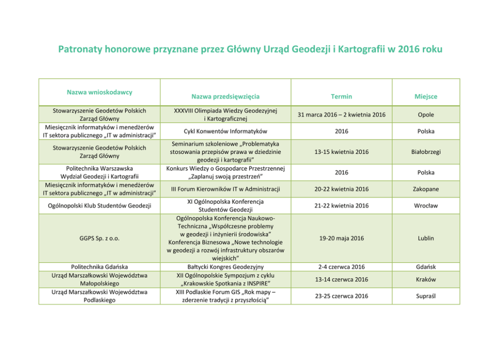 Patronaty honorowe przyznane przez Główny Urząd Geodezji i