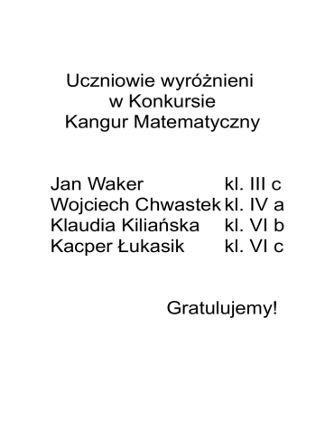 Uczniowie wyróżnieni w Konkursie Kangur Matematyczny Jan Waker kl. III c Wojciech Chwastek kl. IV a Klaudia Kiliańska kl. VI b Kacper Łukasik kl. VI c Gratulujemy!