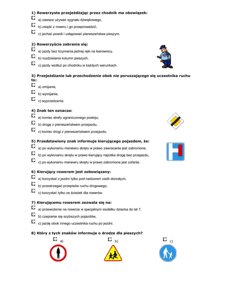 1) Rowerzysta przejeżdżając przez chodnik ma obowiązek: a) zawsze używać sygnału dźwiękowego, b) zsiąść z roweru i go przeprowadzić, c) jechać powoli i ustępować pierwszeństwa pieszym. 2) Rowerzyście zabrania się: a) jazdy bez trzymania jednej ręki na kierownicy, b) rozdzielania kolumn pieszych, c) jazdy wzdłuż po chodniku w każdych warunkach. 3) Przejeżdżanie lub przechodzenie obok nie poruszającego się uczestnika ruchu to: a) omijanie, b) wymijanie, c) wyprzedzanie. 4) Znak ten oznacza: a) koniec strefy ograniczonego postoju, b) drogę z pierwszeństwem przejazdu, c) koniec drogi z pierwszeństwem przejazdu. 5) Przedstawiony znak informuje kierującego pojazdem, że: a) po wykonaniu manewru skrętu w prawo zawracanie jest zabronione, b) po wykonaniu skrętu w prawo kierujący napotka drogę bez przejazdu, c) po wykonaniu manewru skrętu w prawo zabronione jest cofanie. 6) Kierujący rowerem jest zobowiązany: a) korzystać z jezdni tylko pod nadzorem osób dorosłych, b) przestrzegać przepisów ruchu drogowego, c) korzystać tylko ze ścieżek dla rowerów. 7) Kierującemu rowerem zezwala się na: a) przewożenie na rowerze w specjalnym siodełku dziecka do lat 7, b) czepianie się szybszych pojazdów, c) jazdę obok innego uczestnika ruchu po jezdni. 8) Który z tych znaków informuje o drodze dla pieszych? a) b) c) 9) Włączanie się do ruchu następuje: a) przy wjeżdżaniu na drogę polną z drogi asfaltowej, b) przy wjeżdżaniu na boisko szkolne z drogi asfaltowej, c) przy wjeżdżaniu z podwórka szkolnego na drogę asfaltową. 10) Znak ten zabrania rowerzyście: a) jazdy rowerem tylko po jezdni, b) jazdy rowerem tylko po poboczu, c) jazdy rowerem i po jezdni, i po poboczu. 11) Kierujący ruchem policjant zwrócony przodem lub tyłem do nadjeżdżającego rowerzysty oznacza: a) zakaz wjazdu na skrzyżowanie, b) zezwolenie na wjazd na skrzyżowanie, c) uwaga, za chwilę nastąpi zmiana sygnału. 12) W tej sytuacji kierujący rowerem: a) ustępuje tylko pojazdowi z numerem 2, b) ustępuje tylko pojazdowi z numerem 3, c) jedzie ostatni. 13) W tej sytuacji kierujący rowerem: a) ma pierwszeństwo przed pojazdem z numerem 3, b) ma pierwszeństwo przed pojazdem z numerem 2, c) jedzie ostatni. 14) W tej sytuacji kierujący rowerem: a) ustępuje pierwszeństwa pojazdowi z numerem 3, b) jedzie jako pierwszy, c) ustępuje pierwszeństwa tramwajowi z numerem 2. 15) Pierwszą czynnością, poprzedzającą udzielanie pomocy ofiarom wypadku, powinno być: a) zadbanie o bezpieczeństwo ruchu w miejscu wypadku, b) wezwanie policji, c) wezwanie pogotowia ratunkowego.