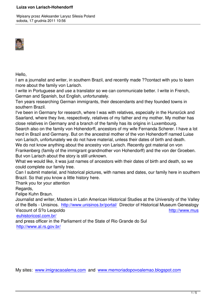 Luiza von Larisch-Hohendorff Wpisany przez Aleksander Larysz Silesia Poland sobota, 17 grudnia 2011 10:56 Hello, I am a journalist and writer, in southern Brazil, and recently made ??contact with you to learn more about the family von Larisch. I write in Portuguese and use a translator so we can communicate better. I write in French, German and Spanish, but English, unfortunately. Ten years researching German immigrants, their descendants and they founded towns in southern Brazil. I've been in Germany for research, where I was with relatives, especially in the Hunsrück and Saarland, where they live, respectively, relatives of my father and my mother. My mother has close relatives in Germany and a branch of the family has its origins in Luxembourg. Search also on the family von Hohendorff, ancestors of my wife Fernanda Scherer. I have a lot herd in Brazil and Germany. But on the ancestral mother of the von Hohendorff named Luise von Larisch, unfortunately we do not have material, unless their dates of birth and death. We do not know anything about the ancestry von Larisch. Recently got material on von Frankenberg (family of the immigrant grandmother von Hohendorff) and the von der Groeben. But von Larisch about the story is still unknown. What we would like, it was just names of ancestors with their dates of birth and death, so we could complete our family tree. Can I submit material, and historical pictures, with names and dates, our family here in southern Brazil. So that you know a little history here. Thank you for your attention Regards, Felipe Kuhn Braun. Journalist and writer, Masters in Latin American Historical Studies at the University of the Valley of the Bells - Unisinos. http://www.unisinos.br/portal/ Director of Historical Museum Genealogy Viscount of S?o Leopoldo http://www.mus euhistoricosl.com.br/ and press officer in the Parliament of the State of Rio Grande do Sul http://www.al.rs.gov.br/ My sites: www.imigracaoalema.com and www.memoriadopovoalemao.blogspot.com 1/5 Luiza von Larisch-Hohendorff Wpisany przez Aleksander Larysz Silesia Poland sobota, 17 grudnia 2011 10:56 Enclose the family tree von Hohendorff. Since the couple who stayed in Germany, Friedrich von Hohendorff and Luise von Larisch, until the immigrant Heinrich Friedrich von Hohendorff and their three children were born in Brazil: Josef, and John Nicolaus Also sending (in another e-mail) old photographs of the family von Hohendorff in Brazil, the descendants of Jo?o von Hohendorff, who marriedtwice, with Catharina Mattje and Adelina Richter. Viele Grüsse aus Südbrasilien, Felipe. Stambaum der Familie von Hohendorff Generation I Friedrich und Luise von Larisch - blieb in Ostpreussen 2/5 Luiza von Larisch-Hohendorff Wpisany przez Aleksander Larysz Silesia Poland sobota, 17 grudnia 2011 10:56 Generation II - Friedrich von Hohendorff - kam nach Brasilien Generation III - Die Brüder von Hohendorff - sind in Brasilien geboren Jo?o von Hohendorff (*1856+1934) 3/5 Luiza von Larisch-Hohendorff Wpisany przez Aleksander Larysz Silesia Poland sobota, 17 grudnia 2011 10:56 Mathilde von Hohendorff e Henrique Felipe Ebling Jo?o Carlos von Hohendorff e Adolfina Einsfeld Oscar Walter von Hohendorff Frederico Gulherme von Hohendorff 4/5 Luiza von Larisch-Hohendorff Wpisany przez Aleksander Larysz Silesia Poland sobota, 17 grudnia 2011 10:56 Gustavo von Hohendorff Jo?o von Hohendorff (syn imigrantów) z synami w 1895 roku Dzieci: Luiz Germano, Jo?o Carlos Leopoldo e Mathilde von Hohendorff. Hause von Hohendorff 5/5