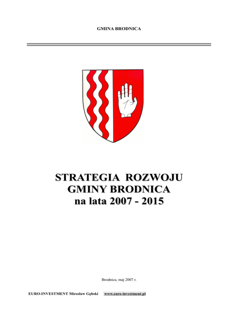 GMINA BRODNICA STRATEGIA ROZWOJU GMINY BRODNICA na lata 2007 - 2015 Brodnica, maj 2007 r. EURO-INVESTMENT Mirosław Gębski www.euro-investment.pl Spis treści I. WYBRANE ELEMENTY Z „DIAGNOZY STANU GMINY 1. 2. BRODNICA” Wprowadzenie Gmina Brodnica w opracowaniach planistycznych skali 3. 3.1. 3.2. 3.3. 3.4. 3.5. 3.6. 3.7. II. 1. 2. 3. 4. 4 - 44 5 ponadlokalnej Aktualny stan gminy Brodnica Sytuacja demograficzno – społeczna 3.1.1. Ludność gminy 3.1.2. Projekcje demograficzne do 2015 roku Infrastruktura społeczna 3.2.1. Edukacja 3.2.2. Kultura, sport i turystyka 3.2.3. Opieka społeczna 3.2.4. Opieka zdrowotna 3.2.5 Mieszkalnictwo Gospodarka i rynek pracy 3.3.1. Podmioty gospodarcze 3.3.2. Bezrobocie 3.3.3. Zatrudnienie Środowisko przyrodnicze 3.4.1. Zasoby i stan środowiska przyrodniczego 3.4.2. Zasoby wodne Infrastruktura techniczna – gospodarka komunalna 3.5.1. Drogi – transport 3.5.2. Gospodarka wodno – ściekowa 3.5.3. Gospodarka odpadami w gminie 3.5.4. Zaopatrzenie w energię elektryczną, gazową i cieplną Uwarunkowania rozwoju przestrzennego gminy Brodnica 3.6.1. Instrumenty prawne zagospodarowania przestrzennego 3.6.2. Uwarunkowania przestrzenne rozwoju gminy Stan finansów gminy 5 7 7 7 11 13 13 14 15 18 20 22 22 23 25 26 26 28 31 31 32 34 36 38 38 39 40 STRATEGIA ROZWOJU GMINY BRODNICA 45-77 Podstawowe informacje o Metodzie Aktywnego Planowania Strategii 45 Streszczenie strategii rozwoju 48 Analiza SWOT 49 Analiza problemów 52 2 5. 6. 7. 8. Analiza celów Przegląd planowania strategii (mierniki) Harmonogram działań Uczestnicy warsztatów planowania strategicznego 54 57 60 75 3 Diagnoza stanu gminy Brodnica I. WYBRANE ELEMENTY Z „DIAGNOZY STANU GMINY BRODNICA” KOORDYNATOR PROJEKTU: Edward Łukaszewski AUTORZY PRACY: Andrzej Czyżewski Beata Tamara Kijowiec Bożena Becmer Edward Łukaszewski Edyta Zabłotna Jolanta Tomella Marek Pomianowski Paweł Wiśniewski Sławomir Komorowski Sylwia Gołębiewska Tomasz Goźliński Wiesława Jaranowska Wiesława Zielińska Witold Jastrzębski Zdjęcia pochodzą z kolekcji fotografii Urzędu Gminy oraz ze stron internetowych: www.brodnica.pl www.brodnica.net Urząd Gminy Brodnica Diagnoza stanu gminy Brodnica 1.WPROWADZENIE. Gmina Brodnica znajduje się we wschodniej części województwa kujawsko-pomorskiego. Otacza miasto Brodnica, w nim mieści się siedziba władz i stąd też nazwa gminy. Ma charakter rolniczy z elementami kontynuacji zabudowy miejskiej na styku z miastem. Nowe uwarunkowania, w jakich przychodzi funkcjonować gminie Brodnica, wymagają posiadania przez gminę strategii rozwoju oraz planu rozwoju lokalnego. Podstawą do opracowania tych dokumentów jest diagnoza stanu obecnego zawierająca materiały statystyczne i wstępną, retrospektywną ocenę badanego obszaru. „Diagnoza Stanu Gminy Brodnica” została opracowana przez pracowników Urzędu Gminy. Materiał statystyczny opatrzono syntetycznym komentarzem, który charakteryzuje zjawiska w wybranych obszarach życia społeczno-gospodarczego w układzie przestrzennym i dynamicznym. Badaniem objęto głównie okres od 2000 do 2006 roku. Jako punkt odniesienia pozwalający na sformułowanie opinii co do zakresu jakości zmian zachodzących w wybranych dziedzinach przyjęto średnie statystyczne dla województwa kujawsko-pomorskiego. Część porównawczą wzbogacono o materiały sytuujące powiat brodnicki wśród powiatów ziemskich województwa kujawsko-pomorskiego. W badaniach korzystano z danych statystycznych GUS, WUS, USC, GOPS i danych własnych Urzędu Gminy. Dla celów porównawczych dane dla gminy Brodnica zestawiono z danymi gmin porównywalnej wielkości. 2.GMINA BRODNICA W OPRACOWANIACH PLANISTYCZNYCH SKALI PONADLOKALNEJ. Gmina Brodnica jako odrębna jednostka samorządowa nie była bezpośrednio obiektem zainteresowania planistów opracowujących Strategię Rozwoju Województwa Kujawsko-Pomorskiego z Wizją Rozwoju do roku 2010 (Uchwała Nr XLI/586/05 Sejmiku Województwa Kujawsko-Pomorskiego z dnia 12 grudnia 2005r.). Jest to dokument odnoszący się do terenu województwa jako całości, a poszczególne jednostki samorządowe w niej występują rzadko, głównie dotyczy to miast Bydgoszczy i Torunia. Nie mniej jednak szereg obszarów działań zawartych w Strategii ma swoje odniesienie również do gminy Brodnica. Urząd Gminy Brodnica 5 Diagnoza stanu gminy Brodnica W 2001r. opracowano Strategię Rozwoju Powiatu Brodnickiego. Zapisane w harmonogramie działania (zadania) dotyczą również gminy Brodnica, np. wspieranie budowy oczyszczalni przyzagrodowych, uczestnictwo w programie gazyfikacji. W czerwcu 2003r. Sejmik Województwa Kujawsko-Pomorskiego uchwalił Plan Zagospodarowania Przestrzennego Województwa Kujawsko-Pomorskiego (Uchwała Nr XI/135/03 Sejmiku Województwa Kujawsko-Pomorskiego z dnia 26 czerwca 2003r.). Jest to dokument przedstawiający wizję struktury przestrzenno-funkcjonalnej do roku 2020, a więc w okresie znacznie dłuższym niż obejmować będzie Strategia Rozwoju Gminy. W Planie Zagospodarowania Przestrzennego Województwa Kujawsko-Pomorskiego gmina Brodnica znajduje się w strefie polityki przestrzennej wschodniej. Plan zakłada: −w sferze ochrony i kształtowania środowiska kulturowego wspieranie działań konserwatorskich dla zachowania obiektów sakralnych oraz zespołów dworskopałacowych, −w sferze związanej z gospodarką turystyczną dalszy rozwój agroturystyki na bazie istniejących siedlisk rolniczych, −dla produkcji żywności zakłada rozwój rolnictwa ukierunkowanego na produkcję warzyw i owoców dla istniejącego przetwórstwa oraz na zaopatrzenie turystów, a także produkcję zwierzęcą, −w zakresie komunikacji planuje się przebudowę drogi krajowej nr 15 Toruń-Olsztyn oraz dróg wojewódzkich 543 – kierunek Grudziądz i 560 – kierunek Rypin, −w zakresie przebudowy dróg wojewódzkich do klasy technicznej wymienia się drogę nr 544 Brodnica – Mława ( przez wieś 