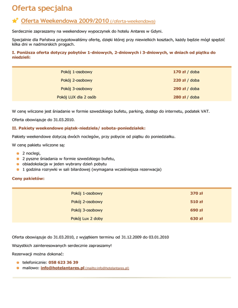 Oferta specjalna Oferta Weekendowa 2009/2010 (/oferta-weekendowa) Serdecznie zapraszamy na weekendowy wypoczynek do hotelu Antares w Gdyni. Specjalnie dla Państwa przygotowaliśmy ofertę, dzięki której przy niewielkich kosztach, każdy będzie mógł spędzić kilka dni w nadmorskich progach. I. Poniższa oferta dotyczy pobytów 1-dniowych, 2-dniowych i 3-dniowych, w dniach od piątku do niedzieli: Pokój 1-osobowy 170 zł / doba Pokój 2-osobowy 220 zł / doba Pokój 3-osobowy 290 zł / doba Pokój LUX dla 2 osób 280 zł / doba W cenę wliczone jest śniadanie w formie szwedzkiego bufetu, parking, dostęp do internetu, podatek VAT. Oferta obowiązuje do 31.03.2010. II. Pakiety weekendowe piątek-niedziela/ sobota-poniedziałek: Pakiety weekendowe dotyczą dwóch noclegów, przy pobycie od piątku do poniedziałku. W cenę pakietu wliczone są: 2 noclegi, 2 pyszne śniadania w formie szwedzkiego bufetu, obiadokolacja w jeden wybrany dzień pobytu 1 godzina rozrywki w sali bilardowej (wymagana wcześniejsza rezerwacja) Ceny pakietów: Pokój 1-osobowy 370 zł Pokój 2-osobowy 510 zł Pokój 3-osobowy 690 zł Pokój Lux 2 doby 630 zł Oferta obowiązuje do 31.03.2010, z wyjątkiem terminu od 31.12.2009 do 03.01.2010 Wszystkich zainteresowanych serdecznie zapraszamy! Rezerwacji można dokonać: telefonicznie: 058 623 36 39 mailowo: [email protected] (mailto:[email protected])
