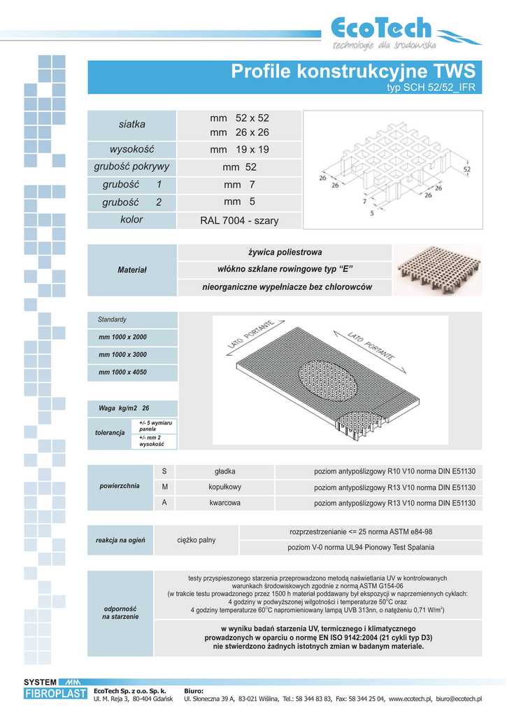 Profile konstrukcyjne TWS typ SCH 52/52_IFR siatka mm 52 x 52 mm 26 x 26 wysokoœæ mm 19 x 19 gruboœæ pokrywy mm 52 gruboœæ 1 mm 7 gruboœæ 2 mm 5 kolor RAL 7004 - szary ¿ywica poliestrowa w³ókno szklane rowingowe typ “E” Materia³ nieorganiczne wype³niacze bez chlorowców Standardy mm 1000 x 2000 mm 1000 x 3000 mm 1000 x 4050 Waga kg/m2 26 tolerancja +/- 5 wymiaru panela +/- mm 2 wysokoœæ powierzchnia S g³adka poziom antypoœlizgowy R10 V10 norma DIN E51130 M kopu³kowy poziom antypoœlizgowy R13 V10 norma DIN E51130 A kwarcowa poziom antypoœlizgowy R13 V10 norma DIN E51130 rozprzestrzenianie <= 25 norma ASTM e84-98 ciê¿ko palny reakcja na ogieñ odpornoœæ na starzenie poziom V-0 norma UL94 Pionowy Test Spalania testy przyspieszonego starzenia przeprowadzono metod¹ naœwietlania UV w kontrolowanych warunkach œrodowiskowych zgodnie z norm¹ ASTM G154-06 (w trakcie testu prowadzonego przez 1500 h materia³ poddawany by³ ekspozycji w naprzemiennych cyklach: 4 godziny w podwy¿szonej wilgotnoœci i temperaturze 50OC oraz 4 godziny temperaturze 60OC napromieniowany lamp¹ UVB 313nn, o natê¿eniu 0,71 W/m2) w wyniku badañ starzenia UV, termicznego i klimatycznego prowadzonych w oparciu o normê EN ISO 9142:2004 (21 cykli typ D3) nie stwierdzono ¿adnych istotnych zmian w badanym materiale. EcoTech Sp. z o.o. Sp. k. Ul. M. Reja 3, 80-404 Gdañsk Biuro: Ul. S³oneczna 39 A, 83-021 Wiœlina, Tel.: 58 344 83 83, Fax: 58 344 25 04, www.ecotech.pl, [email protected] MAKSYMALNE DOPUSZCZALNE MASY Typ podpory ci¹g³a - na dwóch przeciwleg³ych krawêdziach panela Granice wyznaczone przez Ugiêcie (pod wp³ywem obci¹¿enia) maksymalne dopuszczalne ugiêcie wynosi 1/100 dystansu pomiêdzy podporami Obci¹¿enie równomiernie roz³o¿one Obci¹¿enie liniowe Odleg³oœæ miêdzy podporami [cm] Masa z odchylenie równym 1/100 [kg/m2] Odleg³oœæ miêdzy podporami [cm] Masa z odchyleniem równym 1/100 [kg/m] 50 3350 50 1450 70 1550 70 850 90 850 90 600 110 500 110 400 Granice wyznaczone przez Dopuszczalne naprê¿enia (powodowane przez obci¹¿enie) maxymalne dopuszczalne naprê¿enie wynosi 1/5 naprê¿enia ³ami¹cego (wspó³czynnik bezpieczeñstwa wynosi 5 - naprê¿enie ³ami¹ce to piêciokrotnoœæ okreœlonego obci¹¿enia) Obci¹¿enie równomiernie roz³o¿one Obci¹¿enie liniowe Odleg³oœæ miêdzy podporami [cm] Masa z odchylenie równym 1/100 [kg/m2] Odleg³oœæ miêdzy podporami [cm] Masa z odchyleniem równym 1/100 [kg/m] 50 5600 50 1950 70 3350 70 1500 90 2250 90 1250 110 1600 110 1050 Wszystkie mniejsze wagi s¹ dopuszczalne Informacje podane wy¿ej nale¿y czytaæ jako œredni¹ - wahania wartoœci mog¹ wynosi +/-15%. EcoTech Sp. z o.o. Sp. k. Ul. M. Reja 3, 80-404 Gdañsk Biuro: Ul. S³oneczna 39 A, 83-021 Wiœlina, Tel.: 58 344 83 83, Fax: 58 344 25 04, www.ecotech.pl, [email protected]