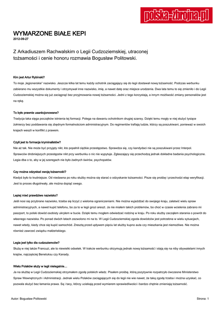 WYMARZONE BIAŁE KEPI 2012-09-27 Z Arkadiuszem Rachwalskim o Legii Cudzoziemskiej, utraconej tożsamości i cenie honoru rozmawia Bogusław Politowski. Kim jest Artur Rybinski? To moje „legionerskie” nazwisko. Jeszcze kilka lat temu każdy ochotnik zaciągający się do legii dostawał nową tożsamość. Podczas werbunku zabierano mu wszystkie dokumenty i otrzymywał inne nazwisko, imię, a nawet datę oraz miejsce urodzenia. Dwa lata temu to się zmieniło i do Legii Cudzoziemskiej można się już zaciągnąć bez przyjmowania nowej tożsamości. Jedni z tego korzystają, a innym możliwość zmiany personaliów jest na rękę. To było prawnie usankcjonowane? Tradycja taka sięga początków istnienia tej formacji. Polega na dawaniu ochotnikom drugiej szansy. Dzięki temu mogły w niej służyć tysiące żołnierzy bez poddawania się zbędnym formalnościom administracyjnym. Do regimentów trafiają ludzie, którzy są poszukiwani, ponieważ w swoich krajach weszli w konflikt z prawem. Czyli jest to formacja kryminalistów? Nie aż tak. Nie może być przyjęty nikt, kto popełnił ciężkie przestępstwo. Sprawdza się, czy kandydaci nie są poszukiwani przez Interpol. Sprawców drobniejszych przestępstw nikt przy werbunku o nic nie wypytuje. Zgłaszający się przechodzą jednak dokładne badania psychologiczne. Legia dba o to, aby w jej szeregach nie było żadnych świrów, psychopatów. Czy można odzyskać swoją tożsamość? Kiedyś było to trudniejsze. Od niedawna po roku służby można się starać o odzyskanie tożsamości. Pisze się prośbę i przechodzi etap weryfikacji. Jest to proces długotrwały, ale można dopiąć swego. Lepiej mieć prawdziwe nazwisko? Jeśli nosi się przybrane nazwisko, trzeba się liczyć z wieloma ograniczeniami. Nie można wyjeżdżać do swojego kraju, załatwić wielu spraw administracyjnych, a nawet kupić telefonu, bo za to w legii grozi areszt. Ja nie miałem takich problemów, bo choć w czasie wcielenia zabrano mi paszport, to polski dowód osobisty ukryłem w bucie. Dzięki temu mogłem odwiedzać rodzinę w kraju. Po roku służby zacząłem starania o powrót do własnego nazwiska. Po ponad dwóch latach zezwolono mi na to. W Legii Cudzoziemskiej zgoda dowódców jest potrzebna w wielu sytuacjach, nawet wtedy, kiedy chce się kupić samochód. Zresztą przed upływem pięciu lat służby kupno auta czy mieszkania jest niemożliwe. Nie można również zawrzeć związku małżeńskiego. Legia jest tylko dla cudzoziemców? Służą w niej także Francuzi, ale to niewielki odsetek. W trakcie werbunku otrzymują jednak nową tożsamość i stają się na niby obywatelami innych krajów, najczęściej Beneluksu czy Kanady. Wielu Polaków służy w legii nielegalnie… Ja na służbę w Legii Cudzoziemskiej otrzymałem zgodę polskich władz. Pisałem prośbę, którą pozytywnie rozpatrzyło ówczesne Ministerstwo Spraw Wewnętrznych i Administracji. Jednak wielu Polaków zaciągających się do legii nie wie nawet, że taką zgodę trzeba i można uzyskać, co pozwala służyć bez łamania prawa. Są i tacy, którzy uciekają przed wymiarem sprawiedliwości i bardzo chętnie zmieniają tożsamość. Autor: Bogusław Politowski Strona: 1 Skąd zarzut, że do służby w Legii Cudzoziemskiej nakłoniło Pana polskie wojsko? Tylko pośrednio. W 2004 roku skończyłem technikum. Marzyłem o tym, aby zostać wojskowym pilotem. Poszedłem do WKU i tam pani stwierdziła, że to zły pomysł, bo z pewnością się nie dostanę na uczelnię. Byłem jednak uparty i złożyłem wszystkie potrzebne dokumenty. Czekałem na wezwanie, jakąś rozmowę czy badania lekarskie, ale się nie doczekałem. Któregoś dnia przyszło za to pismo, że nie zostałem przyjęty do szkoły oficerskiej w Dęblinie, bo nie zgłosiłem się na egzaminy. Wojskowa administracja bardzo pokpiła moją sprawę. Byłem zły na nasze wojsko, że tak traktuje ochotników do służby. Po tych przykrych doświadczeniach przyszedł mi do głowy pomysł, że skoro nie chce mnie armia własnego kraju, to zaciągnę się do legii. Tam było łatwiej się dostać? Legionistą zostałem dopiero dwa lata później. Po porażce z Dęblinem pojechałem do biura werbunkowego w Paryżu i poddałem się testom. Celowo biegałem wolniej, niż mogłem, i oblałem sprawdzian fizyczny. Zrobiłem to dla rodziców, którzy bardzo mnie prosili, żebym służył w legii legalnie, skoro tak bardzo tego chcę. Wtedy zaczęło się pisanie do MSWiA? Nie. Poszedłem do tego samego WKU i poprosiłem o wcielenie do wojska. Jako żołnierza zasadniczej służby skierowano mnie do szkółki w Czarnem, a później – jako kierowcę mechanika czołgu – do jednostki w Morągu. Mam za sobą całą dziesięciomiesięczną zasadniczą służbę w polskim wojsku. Po wyjściu do cywila nie odechciało się Panu wojaczki? Służba w tajemniczej i elitarnej formacji, jaką jest Legia Cudzoziemska, nadal siedziała mi w głowie. Lubię wyzwania. Nie tyle kasa, ile chęć sprawdzenia siebie i znalezienia ciekawego sposobu na życie sprawiły, że napisałem prośbę do ministerstwa o zgodę na służbę w obcej armii. Gdy ją otrzymałem, w październiku 2006 roku po raz drugi wyjechałem do Paryża. Tym razem nie obijałem się podczas zajęć fizycznych i pokazałem, że jestem wart tej formacji. Bez żadnych obaw? Miałem ich wiele. O legii wiedziałem tylko tyle, ile wyczytałem w internecie. Później okazało się, że ludzie wypisują tam bzdury. Byli „legionerzy” na swoich stronach bardzo gloryfikują tę formację. Piszą o etosie, honorze, wielkich tradycjach, jakby służyli tam sami nadludzie. W innych materiałach dominuje z kolei ton prześmiewczy. Żołnierzy legii pokazuje się jako wyzutych z uczuć najemników, gotowych zabijać za kasę. Rzeczywistość okazała się zupełnie inna. Legia jest normalną formacją wojskową podlegającą dowództwu armii francuskiej. Wykonuje takie 