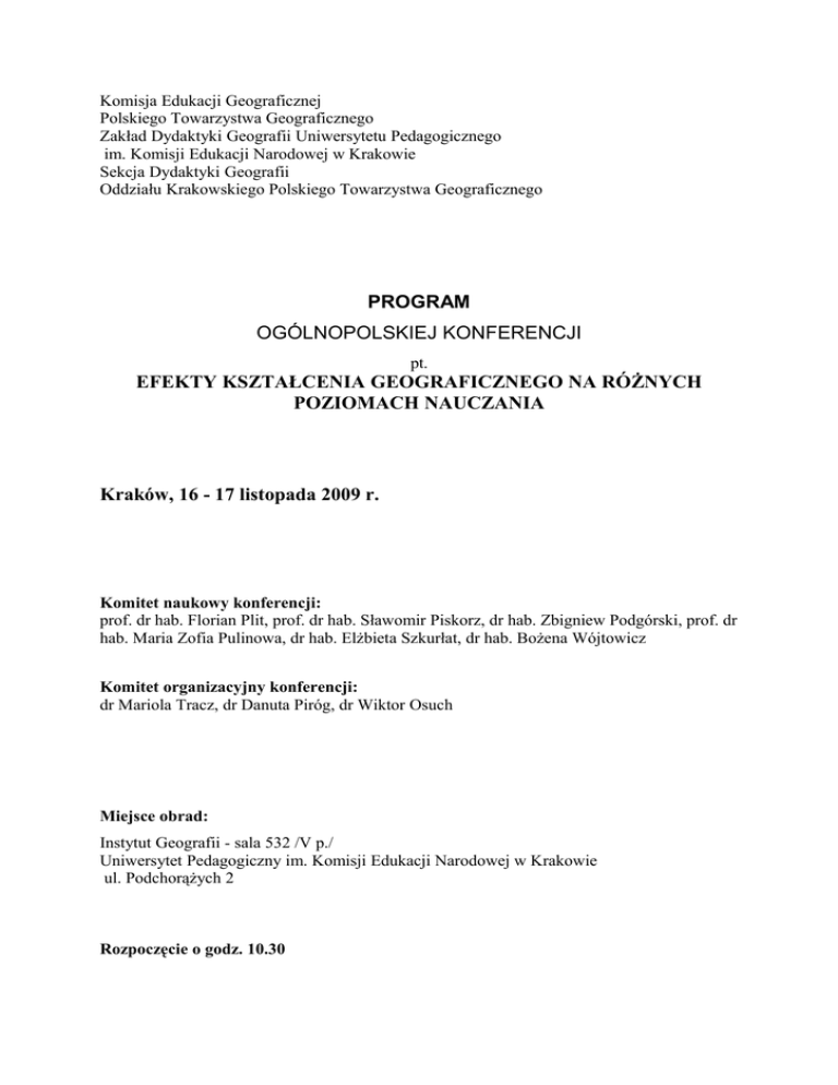 Komisja Edukacji Geograficznej Polskiego Towarzystwa Geograficznego Zakład Dydaktyki Geografii Uniwersytetu Pedagogicznego im. Komisji Edukacji Narodowej w Krakowie Sekcja Dydaktyki Geografii Oddziału Krakowskiego Polskiego Towarzystwa Geograficznego PROGRAM OGÓLNOPOLSKIEJ KONFERENCJI pt. EFEKTY KSZTAŁCENIA GEOGRAFICZNEGO NA RÓŻNYCH POZIOMACH NAUCZANIA Kraków, 16 - 17 listopada 2009 r. Komitet naukowy konferencji: prof. dr hab. Florian Plit, prof. dr hab. Sławomir Piskorz, dr hab. Zbigniew Podgórski, prof. dr hab. Maria Zofia Pulinowa, dr hab. Elżbieta Szkurłat, dr hab. Bożena Wójtowicz Komitet organizacyjny konferencji: dr Mariola Tracz, dr Danuta Piróg, dr Wiktor Osuch Miejsce obrad: Instytut Geografii - sala 532 /V p./ Uniwersytet Pedagogiczny im. Komisji Edukacji Narodowej w Krakowie ul. Podchorążych 2 Rozpoczęcie o godz. 10.30 Program konferencji: Poniedziałek, 16 listopada 2009 r. 10.00 -10.30 - rejestracja uczestników konferencji 10.30 - 14.00. Obrady plenarne – sesja I: Geografia w nowym systemie kształcenia - jej funkcja i współczesne cele edukacyjne Otwarcie obrad – prof. dr hab. Zbigniew Długosz - Dziekan Wydziału Geograficzno— Biologicznego UP w Krakowie dr Teresa Sadoń-Osowiecka (UG): Inspiracje psychologiczno-pedagogiczne w edukacji geograficznej dr Mariola Tracz (UP): Relacje między problematyką współczesnej geografii, a geografią jako przedmiotem nauczania 12.00 -12.30 przerwa kawowa mgr Ewa Jaworska (UG): System IB a polska edukacja geograficzna mgr Marta Bobiatyńska (UW): Percepcja geografii wśród uczniów szkół ponadgimnazjalnych realizujących program matury międzynarodowej Dyskusja 14.00 - 15.30 przerwa obiadowa 15.30 - 18.00 Obrady plenarne - sesja II Efektywność edukacji geograficznej w świetle egzaminów zewnętrznych dr Jolanta Rodzoś (UMCS): Efekty i efektywność w edukacji szkolnej rozważania teoretyczne dr Maria Groenwald (UG): Egzamin jako narzędzie rozliczania człowieka z jego pracy dr Joanna Szczęsny (UMCS): Osiągnięcia szkolne uczniów z zakresu geografii u progu gimnazjum - wyniki badań pedagogicznych 16.45 - 17.00 przerwa kawowa dr Małgorzata Cichoń (UAM): Efektywność procesu kształcenia wybranych umiejętności geograficznych mgr Barbara Dzięcioł-Kurczaba (UŁ): Przyczyny zróżnicowania efektywności kształcenia geograficznego w świetle wyników egzaminu maturalnego dr Iwona Piotrowska (UAM): Efekty dydaktyczne aktywizujących metod w nauczaniu dwujęzycznym geografii Dyskusja Wtorek , 17 listopada 2009 r. 9.00 - 14.00 Obrady plenarne - sesja III Jakość i efektywność akademickiego kształcenia geograficznego dr Adam Hibszer (UŚ), dr Mariola Tracz (UP): Studia geograficzne w Polsce w świetle literatury i badań ankietowych dr hab. prof. UŁ Elżbieta Szkurłat: Jakość i efektywność akademickiego kształcenia geograficznego dr hab. prof. UP Bożena Wójtowicz (UP): Poziom i oczekiwania studentów w zakresie kształcenia geograficznego 10.30 - 11.00 przerwa kawowa dr Danuta Piróg (UP): Rodzaje specjalności w geograficznym kształceniu akademickim w Polsce - moda czy odpowiedź na potrzeby rynku pracy dr Wiktor Osuch (UP): Efektywność akademickiego kształcenia kompetencji na studiach podyplomowych z geografii (na przykładzie Uniwersytetu Pedagogicznego w Krakowie) mgr Maria Adamczewska (UŁ), mgr Arkadiusz Głowacz (UŁ), mgr Karolina Smętkiewicz (UŁ), dr hab. prof. UŁ Elzbieta Szkurłat: Jakość kształcenia geograficznego w szkole wyższej na przykładzie łódzkiego ośrodka akademickiego dr Lucyna Przybylska (UG): Sprawozdania studentów z ćwiczeń terenowych zwierciadłem osiąganych celów kształcenia akademickiego 13.30 - 14.00 Dyskusja podsumowująca konferencję