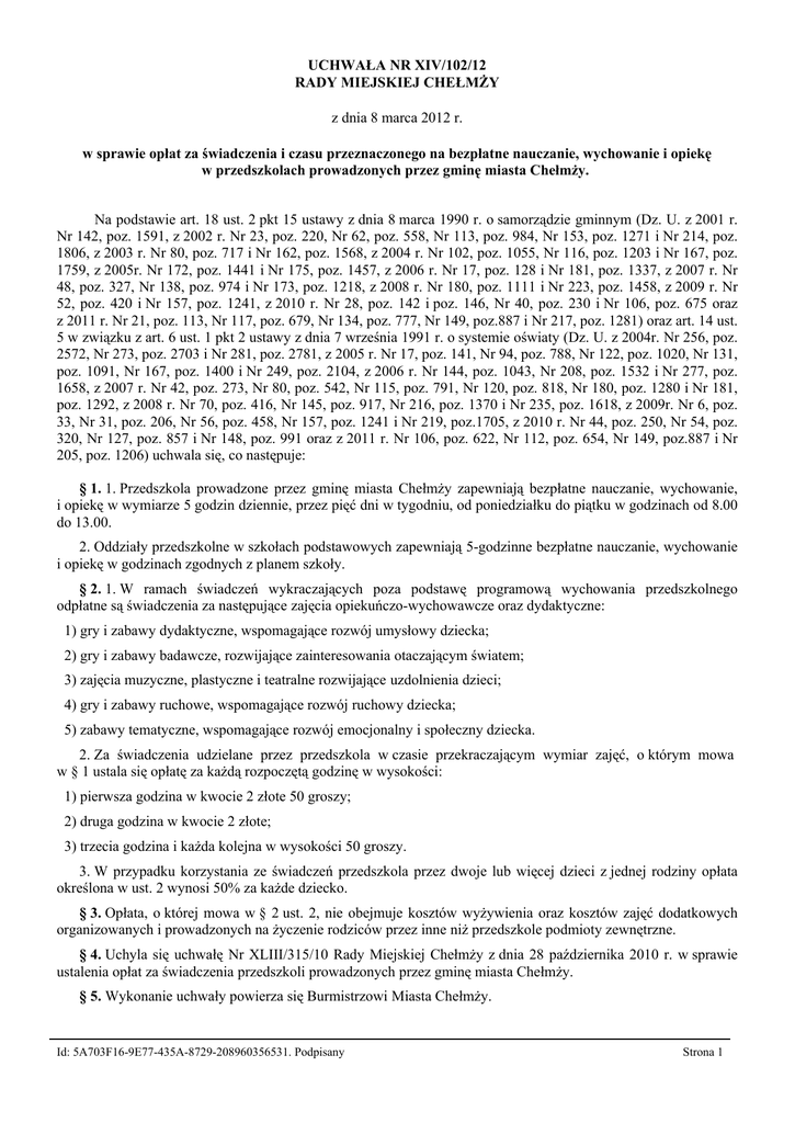 UCHWAŁA NR XIV/102/12 RADY MIEJSKIEJ CHEŁMŻY z dnia 8 marca 2012 r. w sprawie opłat za świadczenia i czasu przeznaczonego na bezpłatne nauczanie, wychowanie i opiekę w przedszkolach prowadzonych przez gminę miasta Chełmży. Na podstawie art. 18 ust. 2 pkt 15 ustawy z dnia 8 marca 1990 r. o samorządzie gminnym (Dz. U. z 2001 r. Nr 142, poz. 1591, z 2002 r. Nr 23, poz. 220, Nr 62, poz. 558, Nr 113, poz. 984, Nr 153, poz. 1271 i Nr 214, poz. 1806, z 2003 r. Nr 80, poz. 717 i Nr 162, poz. 1568, z 2004 r. Nr 102, poz. 1055, Nr 116, poz. 1203 i Nr 167, poz. 1759, z 2005r. Nr 172, poz. 1441 i Nr 175, poz. 1457, z 2006 r. Nr 17, poz. 128 i Nr 181, poz. 1337, z 2007 r. Nr 48, poz. 327, Nr 138, poz. 974 i Nr 173, poz. 1218, z 2008 r. Nr 180, poz. 1111 i Nr 223, poz. 1458, z 2009 r. Nr 52, poz. 420 i Nr 157, poz. 1241, z 2010 r. Nr 28, poz. 142 i poz. 146, Nr 40, poz. 230 i Nr 106, poz. 675 oraz z 2011 r. Nr 21, poz. 113, Nr 117, poz. 679, Nr 134, poz. 777, Nr 149, poz.887 i Nr 217, poz. 1281) oraz art. 14 ust. 5 w związku z art. 6 ust. 1 pkt 2 ustawy z dnia 7 września 1991 r. o systemie oświaty (Dz. U. z 2004r. Nr 256, poz. 2572, Nr 273, poz. 2703 i Nr 281, poz. 2781, z 2005 r. Nr 17, poz. 141, Nr 94, poz. 788, Nr 122, poz. 1020, Nr 131, poz. 1091, Nr 167, poz. 1400 i Nr 249, poz. 2104, z 2006 r. Nr 144, poz. 1043, Nr 208, poz. 1532 i Nr 277, poz. 1658, z 2007 r. Nr 42, poz. 273, Nr 80, poz. 542, Nr 115, poz. 791, Nr 120, poz. 818, Nr 180, poz. 1280 i Nr 181, poz. 1292, z 2008 r. Nr 70, poz. 416, Nr 145, poz. 917, Nr 216, poz. 1370 i Nr 235, poz. 1618, z 2009r. Nr 6, poz. 33, Nr 31, poz. 206, Nr 56, poz. 458, Nr 157, poz. 1241 i Nr 219, poz.1705, z 2010 r. Nr 44, poz. 250, Nr 54, poz. 320, Nr 127, poz. 857 i Nr 148, poz. 991 oraz z 2011 r. Nr 106, poz. 622, Nr 112, poz. 654, Nr 149, poz.887 i Nr 205, poz. 1206) uchwala się, co następuje: § 1. 1. Przedszkola prowadzone przez gminę miasta Chełmży zapewniają bezpłatne nauczanie, wychowanie, i opiekę w wymiarze 5 godzin dziennie, przez pięć dni w tygodniu, od poniedziałku do piątku w godzinach od 8.00 do 13.00. 2. Oddziały przedszkolne w szkołach podstawowych zapewniają 5-godzinne bezpłatne nauczanie, wychowanie i opiekę w godzinach zgodnych z planem szkoły. § 2. 1. W ramach świadczeń wykraczających poza podstawę programową wychowania przedszkolnego odpłatne są świadczenia za następujące zajęcia opiekuńczo-wychowawcze oraz dydaktyczne: 1) gry i zabawy dydaktyczne, wspomagające rozwój umysłowy dziecka; 2) gry i zabawy badawcze, rozwijające zainteresowania otaczającym światem; 3) zajęcia muzyczne, plastyczne i teatralne rozwijające uzdolnienia dzieci; 4) gry i zabawy ruchowe, wspomagające rozwój ruchowy dziecka; 5) zabawy tematyczne, wspomagające rozwój emocjonalny i społeczny dziecka. 2. Za świadczenia udzielane przez przedszkola w czasie przekraczającym wymiar zajęć, o którym mowa w § 1 ustala się opłatę za każdą rozpoczętą godzinę w wysokości: 1) pierwsza godzina w kwocie 2 złote 50 groszy; 2) druga godzina w kwocie 2 złote; 3) trzecia godzina i każda kolejna w wysokości 50 groszy. 3. W przypadku korzystania ze świadczeń przedszkola przez dwoje lub więcej dzieci z jednej rodziny opłata określona w ust. 2 wynosi 50% za każde dziecko. § 3. Opłata, o której mowa w § 2 ust. 2, nie obejmuje kosztów wyżywienia oraz kosztów zajęć dodatkowych organizowanych i prowadzonych na życzenie rodziców przez inne niż przedszkole podmioty zewnętrzne. § 4. Uchyla się uchwałę Nr XLIII/315/10 Rady Miejskiej Chełmży z dnia 28 października 2010 r. w sprawie ustalenia opłat za świadczenia przedszkoli prowadzonych przez gminę miasta Chełmży. § 5. Wykonanie uchwały powierza się Burmistrzowi Miasta Chełmży. Id: 5A703F16-9E77-435A-8729-208960356531. Podpisany Strona 1 § 6. Uchwała wchodzi w życie po upływie 14 dni od dnia ogłoszenia w Dzienniku Urzędowym Województwa Kujawsko - Pomorskiego. Przewodniczący Rady Miejskiej Janusz Kalinowski Id: 5A703F16-9E77-435A-8729-208960356531. Podpisany Strona 2 Uzasadnienie do uchwały nr XIV/102/12 Rady Miejskiej Chełmży z dnia 8 marca 2012 r. w sprawie opłat za świadczenia i czasu przeznaczonego na bezpłatne nauczanie, wychowanie i opiekę w przedszkolach prowadzonych przez gminę miasta Chełmży. W ustawie z 5 sierpnia 2010 r.o zmianie ustawy o systemie oświaty (Dz.U.z 2010 r. Nr 148, poz. 991) wprowadzono regulacje prawne, które określają między innymi, że „przedszkolem publicznym jest przedszkole, które:1) realizuje programy wychowania przedszkolnego uwzględniające podstawę programową wychowania przedszkolnego;2) zapewnia bezpłatne nauczanie, wychowanie i opiekę w czasie ustalonym przez organ prowadzący, nie krótszym niż 5 godzin dziennie". Organ prowadzący ustala wysokość opłat za świadczenia udzielane przez przedszkola publiczne w czasie przekraczającym 5 godzin dziennie, zgodnie z art. 14 ust. 5 ustawy z dnia 7 września 1991 r.o systemie oświaty (Dz. U. z 2004 r. Nr 256, póz. 2572 z późniejszymi zmianami). Dotychczasowa uchwała Rady Miejskiej w sprawie opłat za usługi świadczone przez przedszkola publiczne nie określała,wysokości opłaty za poszczególne godziny w czasie wykraczającym poza 5 godzin dziennie bezpłatnego nauczania, wychowania i opieki, ustalała tylko wysokość opłaty miesięcznej w wysokości 100 zł. W niniejszej uchwale wprowadzono zmianę sposobu ustalania należności z tego tytułu z opłaty stałej miesięcznej na godzinową. Zmiany te dostosowują stan prawny pobierania opłat za przedszkole do wymogów wynikających z ustawy o systemie oświaty. Konieczność podjęcia nowej uchwały wynika także z licznie wydanych w ostatnim okresie wyroków sądów administracyjnych oraz rozstrzygnięć nadzorczych wojewodów, w których ustalono między innymi, że opłaty za dodatkowe świadczenia przedszkoli mają charakter cywilnoprawny, a zatem zastosowanie