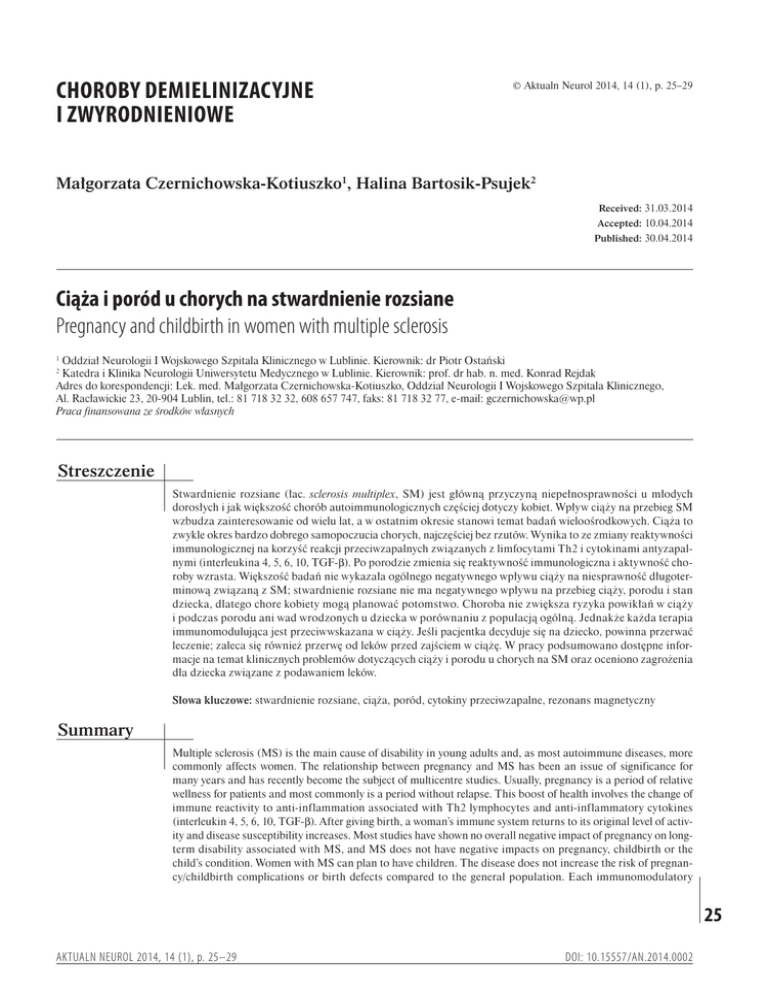 CHOROBY DEMIELINIZACYJNE I ZWYRODNIENIOWE © Aktualn Neurol 2014, 14 (1), p. 25–29 Małgorzata Czernichowska-Kotiuszko1, Halina Bartosik-Psujek2 Received: 31.03.2014 Accepted: 10.04.2014 Published: 30.04.2014 Ciąża i poród u chorych na stwardnienie rozsiane Pregnancy and childbirth in women with multiple sclerosis Oddział Neurologii I Wojskowego Szpitala Klinicznego w Lublinie. Kierownik: dr Piotr Ostański Katedra i Klinika Neurologii Uniwersytetu Medycznego w Lublinie. Kierownik: prof. dr hab. n. med. Konrad Rejdak Adres do korespondencji: Lek. med. Małgorzata Czernichowska-Kotiuszko, Oddział Neurologii I Wojskowego Szpitala Klinicznego, Al. Racławickie 23, 20-904 Lublin, tel.: 81 718 32 32, 608 657 747, faks: 81 718 32 77, e-mail: [email protected] Praca finansowana ze środków własnych 1 2 Streszczenie Stwardnienie rozsiane (łac. sclerosis multiplex, SM) jest główną przyczyną niepełnosprawności u młodych dorosłych i jak większość chorób autoimmunologicznych częściej dotyczy kobiet. Wpływ ciąży na przebieg SM wzbudza zainteresowanie od wielu lat, a w ostatnim okresie stanowi temat badań wieloośrodkowych. Ciąża to zwykle okres bardzo dobrego samopoczucia chorych, najczęściej bez rzutów. Wynika to ze zmiany reaktywności immunologicznej na korzyść reakcji przeciwzapalnych związanych z limfocytami Th2 i cytokinami antyzapalnymi (interleukina 4, 5, 6, 10, TGF-β). Po porodzie zmienia się reaktywność immunologiczna i aktywność choroby wzrasta. Większość badań nie wykazała ogólnego negatywnego wpływu ciąży na niesprawność długoterminową związaną z SM; stwardnienie rozsiane nie ma negatywnego wpływu na przebieg ciąży, porodu i stan dziecka, dlatego chore kobiety mogą planować potomstwo. Choroba nie zwiększa ryzyka powikłań w ciąży i podczas porodu ani wad wrodzonych u dziecka w porównaniu z populacją ogólną. Jednakże każda terapia immunomodulująca jest przeciwwskazana w ciąży. Jeśli pacjentka decyduje się na dziecko, powinna przerwać leczenie; zaleca się również przerwę od leków przed zajściem w ciążę. W pracy podsumowano dostępne informacje na temat klinicznych problemów dotyczących ciąży i porodu u chorych na SM oraz oceniono zagrożenia dla dziecka związane z podawaniem leków. Słowa kluczowe: stwardnienie rozsiane, ciąża, poród, cytokiny przeciwzapalne, rezonans magnetyczny Summary Multiple sclerosis (MS) is the main cause of disability in young adults and, as most autoimmune diseases, more commonly affects women. The relationship between pregnancy and MS has been an issue of significance for many years and has recently become the subject of multicentre studies. Usually, pregnancy is a period of relative wellness for patients and most commonly is a period without relapse. This boost of health involves the change of immune reactivity to anti-inflammation associated with Th2 lymphocytes and anti-inflammatory cytokines (interleukin 4, 5, 6, 10, TGF-β). After giving birth, a woman’s immune system returns to its original level of activity and disease susceptibility increases. Most studies have shown no overall negative impact of pregnancy on longterm disability associated with MS, and MS does not have negative impacts on pregnancy, childbirth or the child’s condition. Women with MS can plan to have children. The disease does not increase the risk of pregnancy/childbirth complications or birth defects compared to the general population. Each immunomodulatory 25 AKTUALN NEUROL 2014, 14 (1), p. 25–29 DOI: 10.15557/AN.2014.0002 CHOROBY DEMIELINIZACYJNE I ZWYRODNIENIOWE therapy is contraindicated in pregnancy. If a patient wishes to become pregnant, discontinuation of the therapy much before planned pregnancy is recommended. The work summarizes available information on clinical problems associated with pregnancy and childbirth in patients with MS and analyses risks to the child associated with the administration of drugs. Key words: multiple sclerosis, pregnancy, childbirth, cytokines anti-inflammatory, magnetic resonance imaging WSTĘP S twardnienie rozsiane (łac. sclerosis multiplex, SM) jest główną przyczyną niepełnosprawności u młodych dorosłych i jak większość chorób autoimmunologicznych częściej dotyczy kobiet(1–3). Wpływ ciąży na stwardnienie rozsiane od wielu lat jest przedmiotem licznych dyskusji. Początkowo odradzano chorym planowanie potomstwa, jednak po licznych badaniach prospektywnych zmieniono ten pogląd. Od 2000 roku uważa się, że ciąża i poród nie mają negatywnego wpływu na SM. Początek SM u ciężarnych jest nietypowy(4,5), dlatego diagnoza u pacjentek z pierwszym rzutem podczas 9 miesięcy ciąży może być szczególnie trudna. Pozagałkowe zapalenie nerwu wzrokowego opisywano jako pierwszy kliniczny objaw rozpoczynającego się SM w okresie laktacji(6,7). Rozpoznanie SM ustala się na podstawie obrazu klinicznego oraz badania rezonansem magnetycznym (MRI). Rezonans jest nieocenionym narzędziem w rozpoznawaniu i monitorowaniu choroby, jednak jego wykorzystanie w czasie ciąży może budzić wiele wątpliwości w związku z oddziaływaniem na płód. Ze względu na ewentualne działania niepożądane MRI nie powinien być wykonywany w I trymestrze ciąży, a w późniejszym okresie można go stosować tylko w wyjątkowych sytuacjach (American College of Obstetricians and Gynecologists, 1995). WPŁYW CIĄŻY NA STWARDNIENIE ROZSIANE 26 W kilku retrospektywnych badaniach oceniano wpływ ciąży na przebieg SM(4,8–13). Ciąża to zwykle okres bardzo dobrego samopoczucia chorych, najczęściej bez rzutów. Wynika to ze zmiany reaktywności immunologicznej na korzyść reakcji przeciwzapalnych związanych z limfocytami Th2 i cytokinami antyzapalnymi (interleukina 4, 5, 6, 10, TGF-β). Po porodzie zmienia się reaktywność immunologiczna i aktywność choroby wzrasta. Badania Confavreux i wsp.(14), oceniające współczynnik rzutów u 227 kobiet
