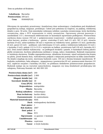 Dom na południe od Krakowa Lokalizacja Bęczarka Powierzchnia 200 [m2] Cena 950000[PLN] Oferujemy do sprzedaży przestronny i komfortowy dom wolnostojący z budynkiem pod działalność gospodarczą (usługi, magazyn, produkcja). Całość jest położona na wzgórzu, na pięknej, widokowej działce o pow. 56 arów. Dom mieszkalny wykonany solidnie z pustaka ceramicznego, kryty dachówką ceramiczną, okna z PCV wyposażone w rolety zewnętrzne. Ogrzewany piecem gazowym z zasobnikiem 115 l, sterowanym elektronicznie (w łazienkach ogrzewanie podłogowe). Powierzchnia użytkowa domu wynosi 192 m2 + podpiwniczenie (częściowe) - rozkład pomieszczeń: - piwnica: salon barowy, pralnia z kotłownią. - parter: wiatrołap (3 m2), hall (11 m2), WC (2 m2), otwarta kuchnia (9 m2), salon+jadalnia (36 m2) z wyjściem na widokowy taras, gabinet (13 m2), garderoba (6 m2), garaż (22 m2). - poddasze: sala telewizyjna (13 m2), pokój z widokowym balkonem (14 m2) i z łazienką (3 m2), pokoje (12,5+13,5) z wyjściem na balkon, przestronny hall (18 m2), łazienka (6,5 m2). Dom został solidnie wykończony - na podłogach terakota i panele, w łazienkach dobrej jakości płytki ceramiczne, kuchnia zabudowana meblami z wyspą, salon z kominkiem. Budynek wyposażony w instalację alarmową. Działka zagospodarowana, obsadzona krzewami, wjazd automatyczną bramą na pilota, przed domem duży, wybrukowany podjazd z miejscami postojowymi na kilka samochodów. Na działce znajduję się nowy, murowany budynek o pow. 105 m2 z dwoma bramami wjazdowymi. W budynku wydzielono: halę usługowo - magazynową o powierzchni 85 m2, pomieszczenie biurowe (10 m2), zaplecze socjalne z łazienką (16,5m2, na poddaszu dodatkowe pomieszczenie gospodarcze. Budynek nadaje się na warsztat samochodowy, magazyn czy inną działalność produkcyjną lub usługową. Polecamy Kontakt: tel. 662 093 335 Powierzchnia domu [m2] 200 Powierzchnia działki [m2] 2 800 Długość działki [m] 100 Szerokość działki [m] 30 Cena [PLN] 950 000 Województwo małopolskie Miasto Bęczarka Rodzaj zabudowy wolnostojący Stan techniczny bardzo dobry Zaawansowanie do zamieszkania Materiał konstrukcyjny MAX Dach wielospadowy dachówka Ilość pięter 1 Rok budowy 2007 Ilość pokoi 6 Okna PCV Ogrzewanie co gazowe + kominek Umeblowanie tak Piwnica częściowa Garaż w bryle budynku 2017-03-06 Nieruchomości Feluś 1 Zieleń ogród Zobacz wszystkie oferty z działu: Domy Kraków 2017-03-06 Nieruchomości Feluś 2